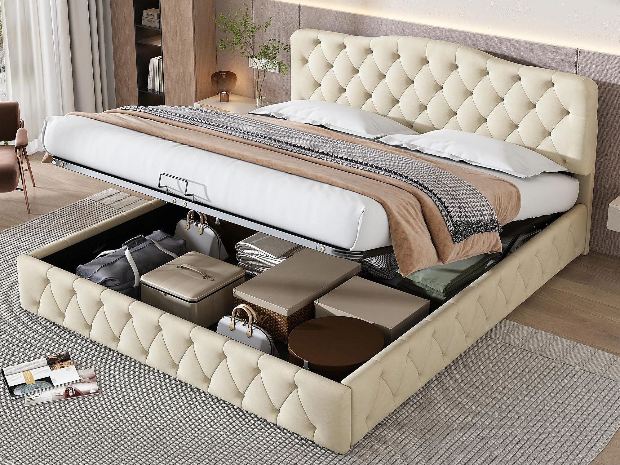 Opbergbed 180 x 200 cm - volwassenenbed - verstelbaar hoofdeinde - houten lattenbodem - fluweel - beige