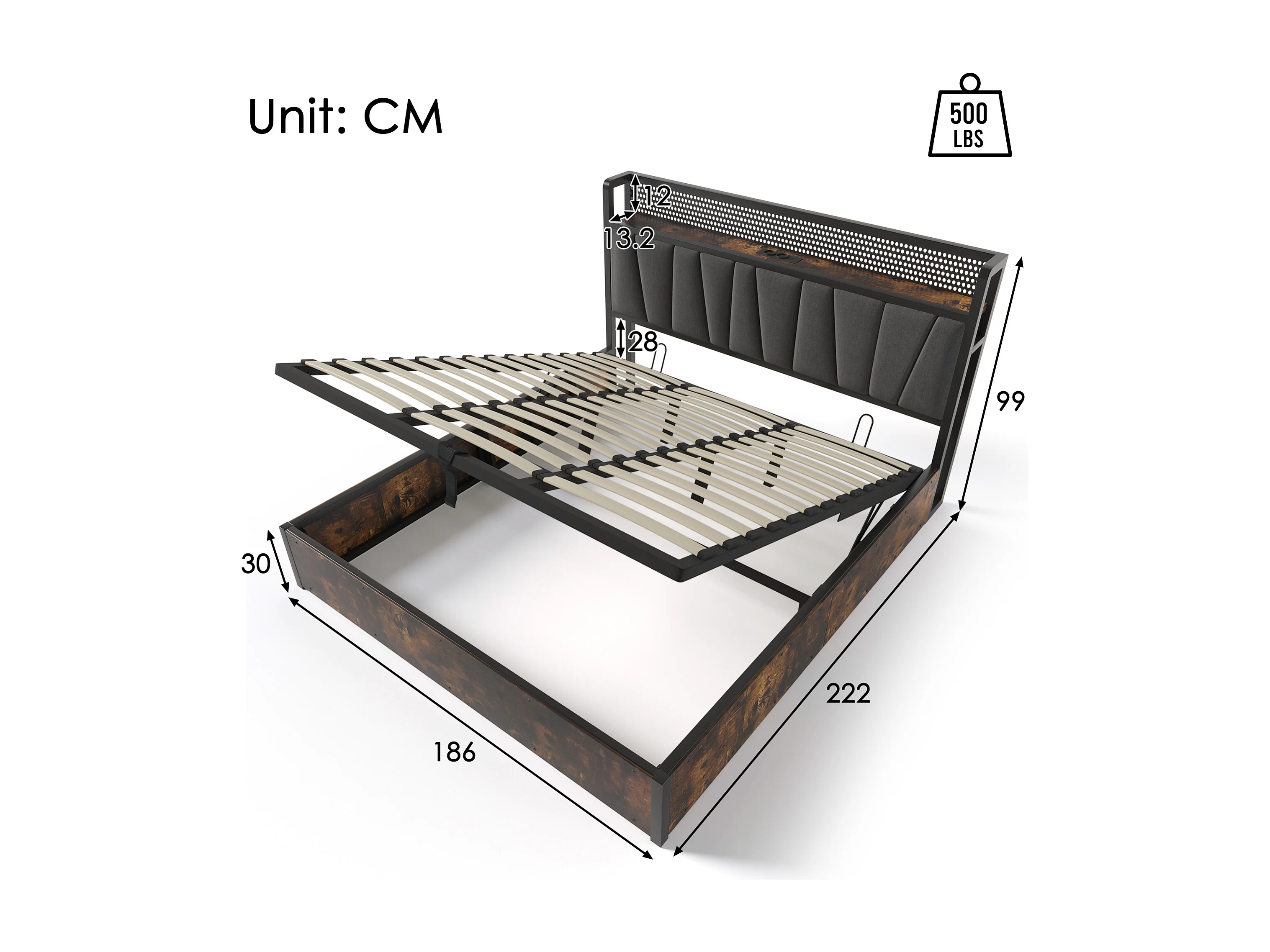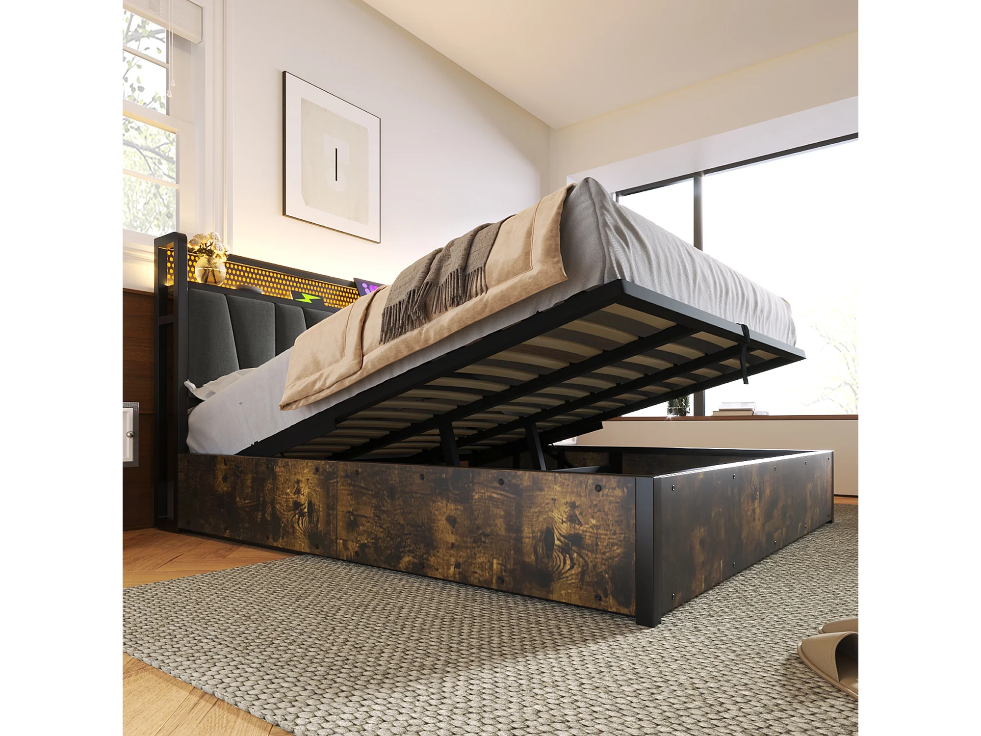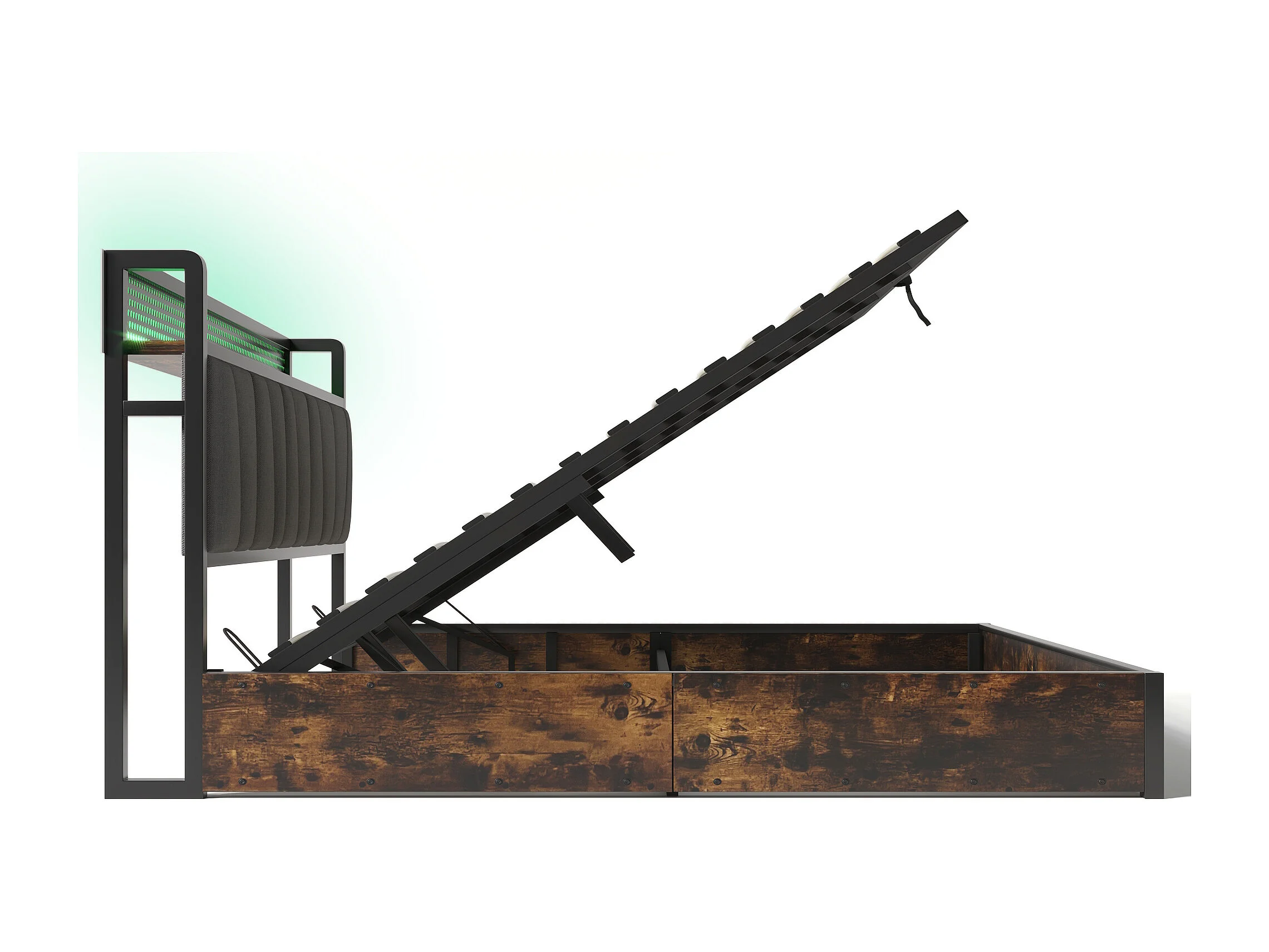 Opbergbed 180x200 cm, volwassenbed met USB-oplaadfunctie en LED-verlichting, linnen en metaal - grijs (zonder matras)