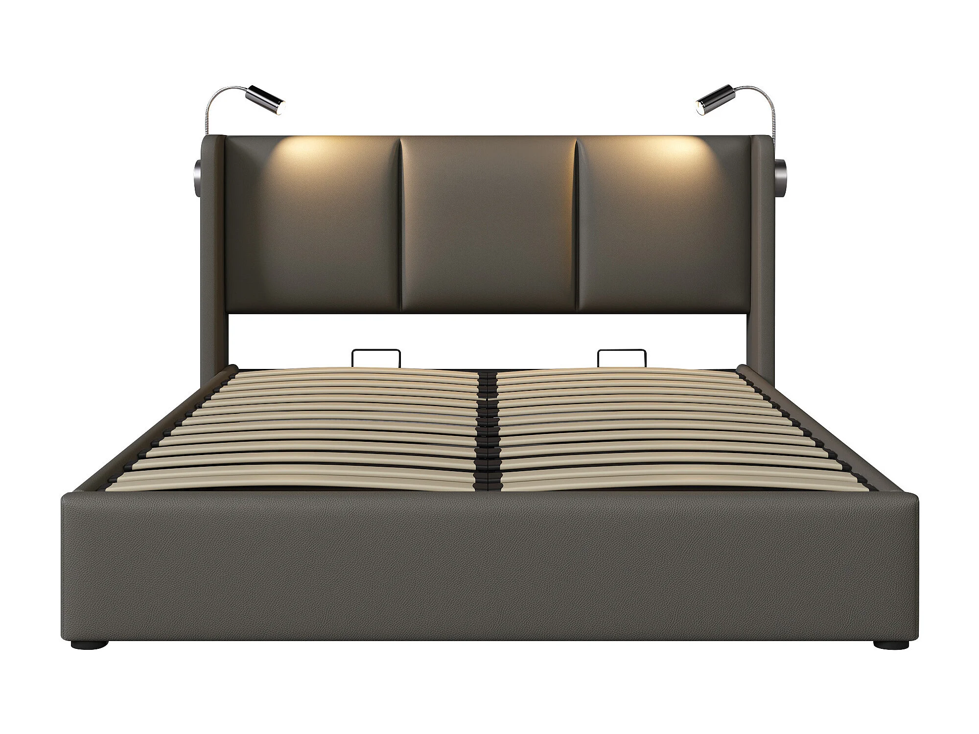 Opbergbed 206x165x107 cm met LED-verlichting, laadfunctie, opbergruimte, grijze matras voor volwassenen en tieners
