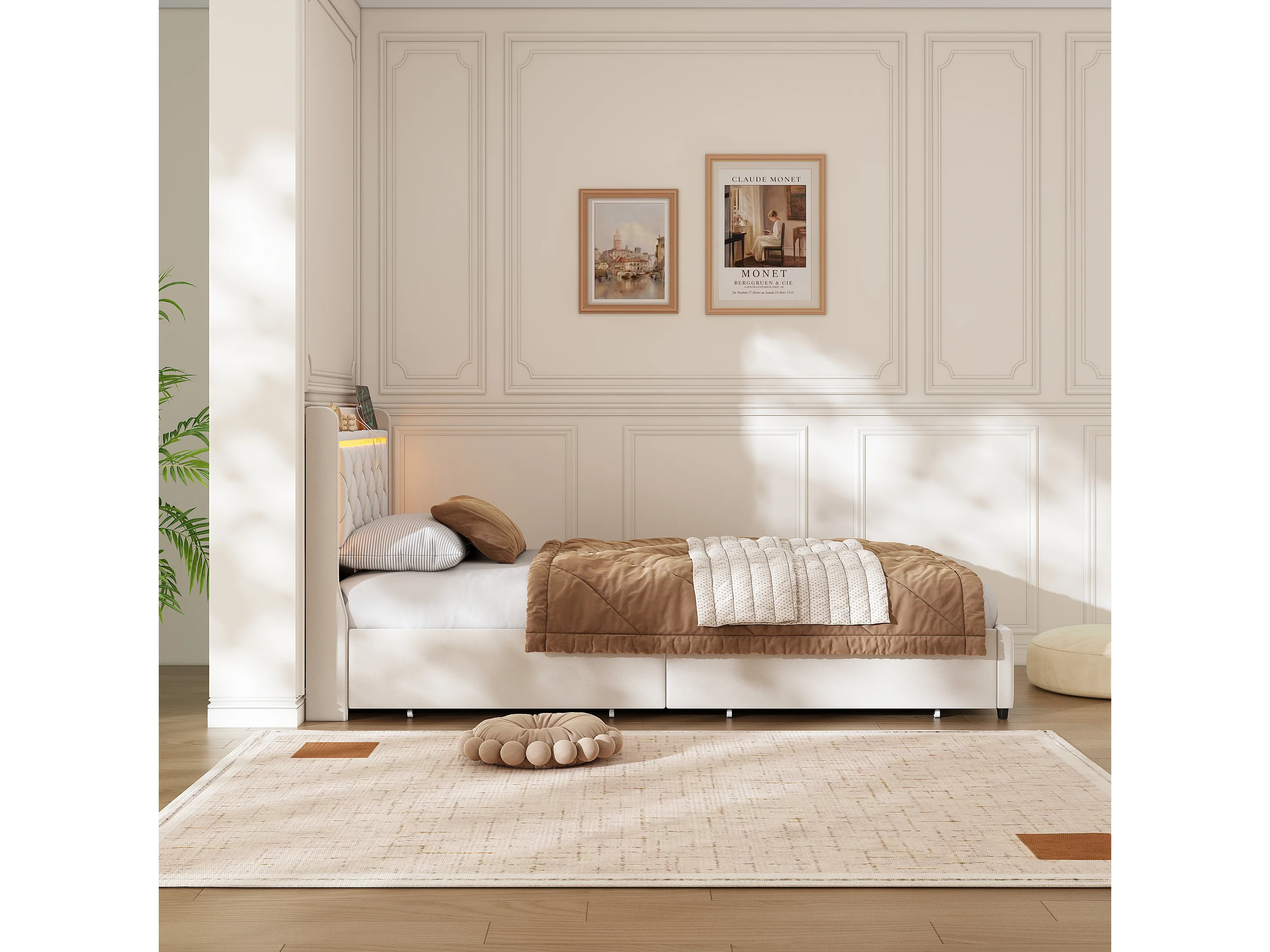 Opbergbed 90 x 200 cm met LED en USB, 2 lades en lattenbodem, fluweel, beige