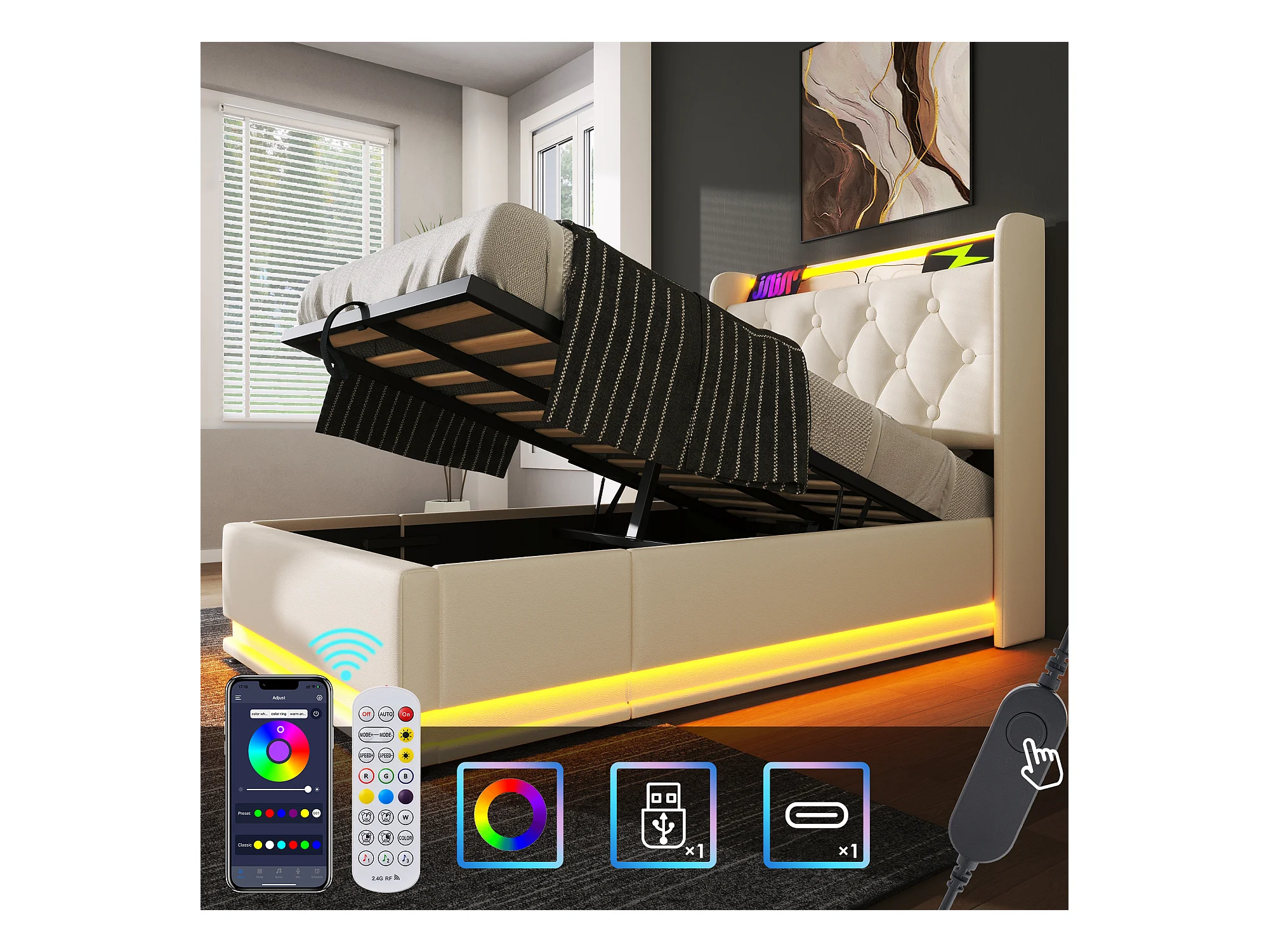 Opbergbed van kunstleer 90x200cm - met LED- en USB- en Type-C-aansluitingen - Wit