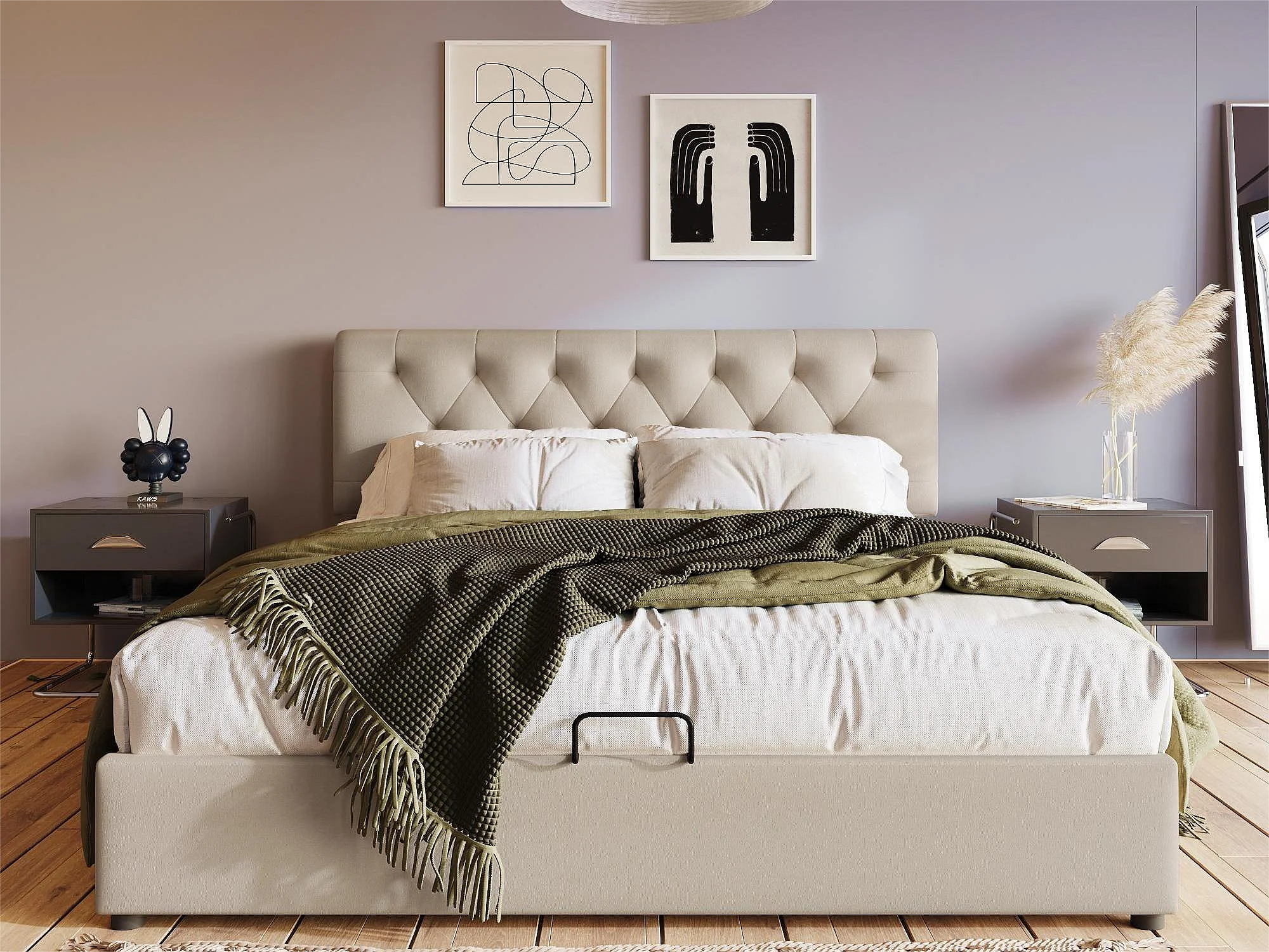 Opbergbed met opbergruimte - 140 x 200 cm - linnen stof - lattenbodem - natuurlijke kleur