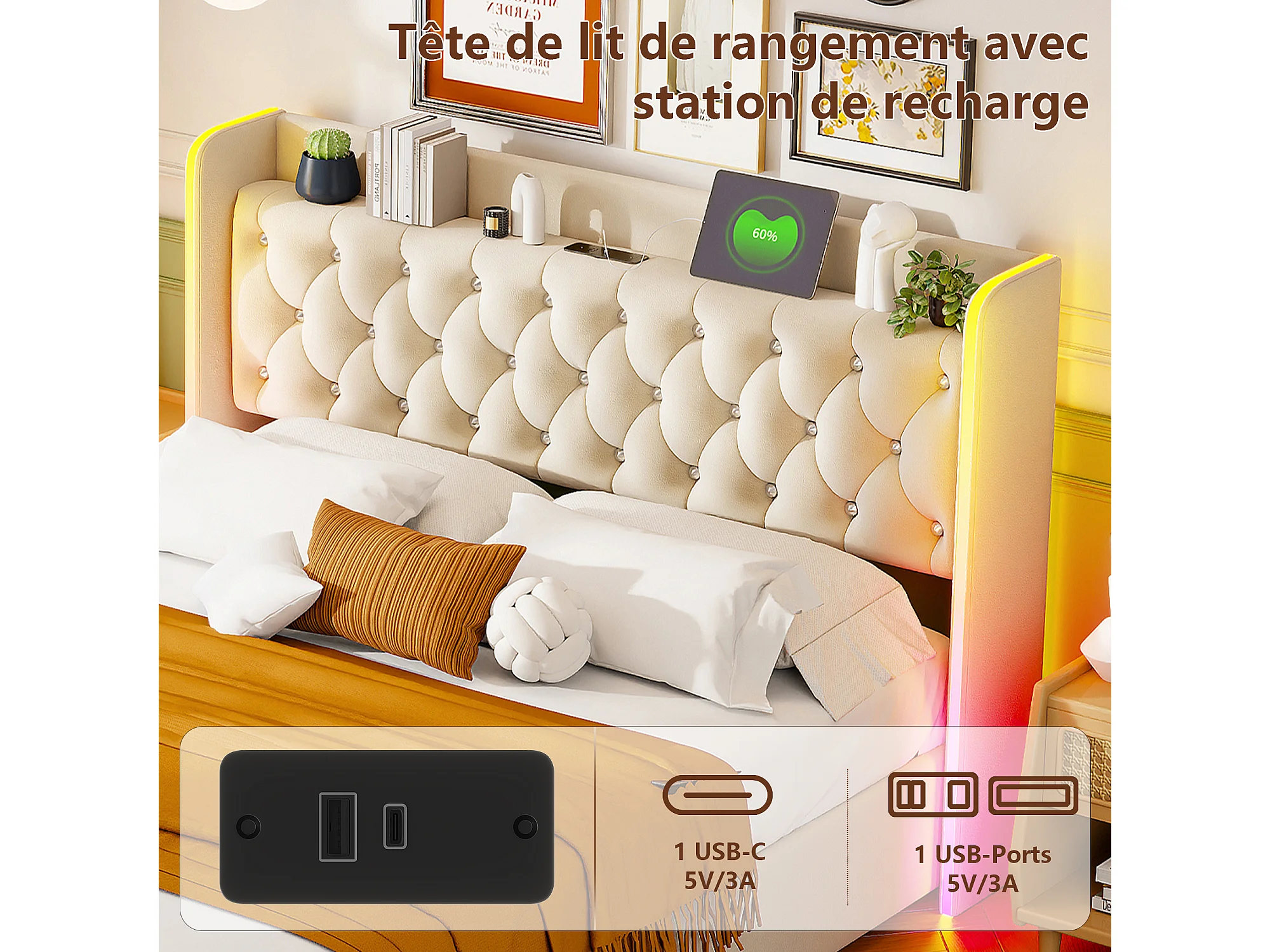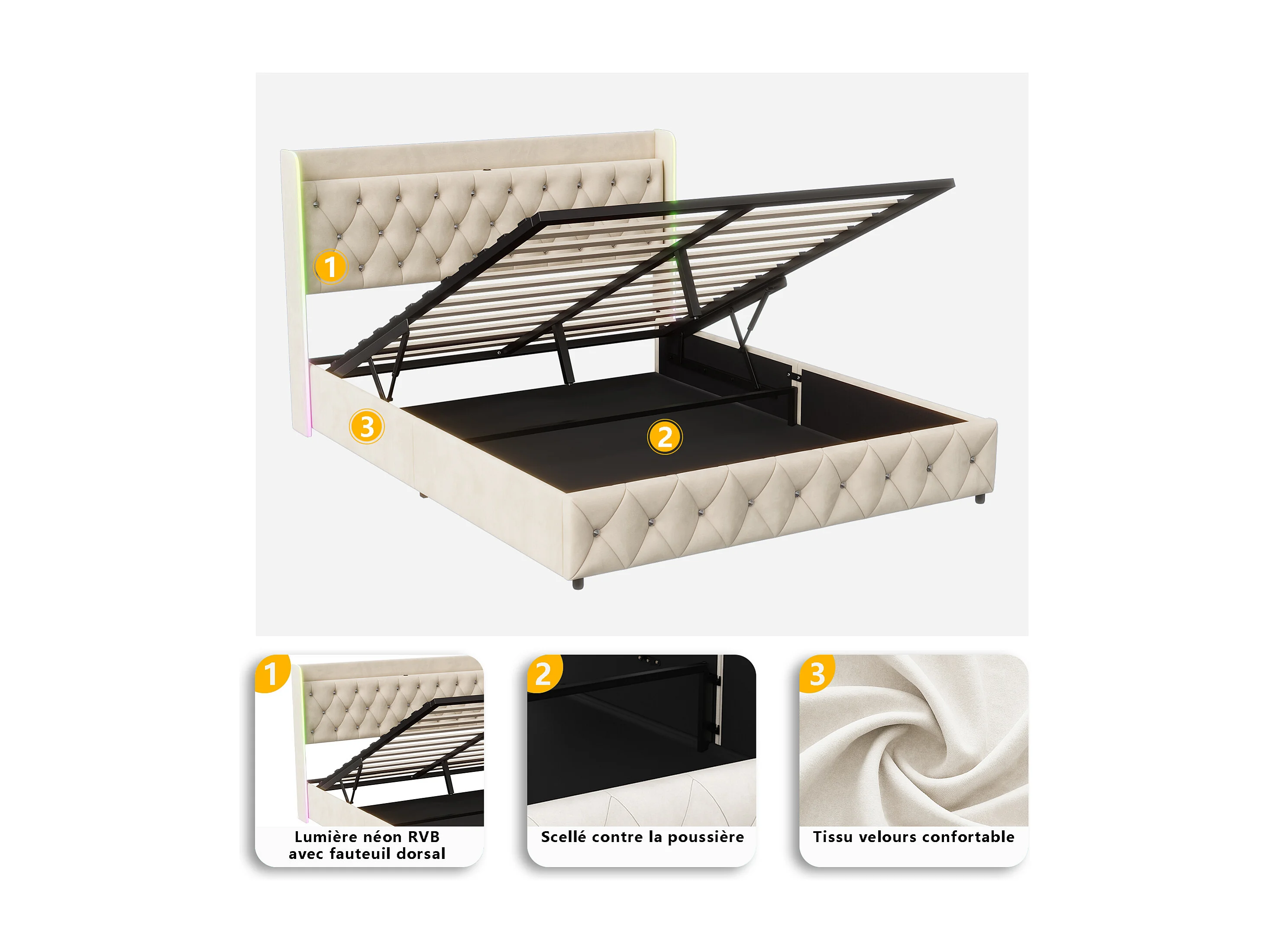 Opbergbed van 140x200 cm met RGB LED-verlichting, beige fluwelen bekleding, opklapbare lattenbodem en geïntegreerde opbergruimte.