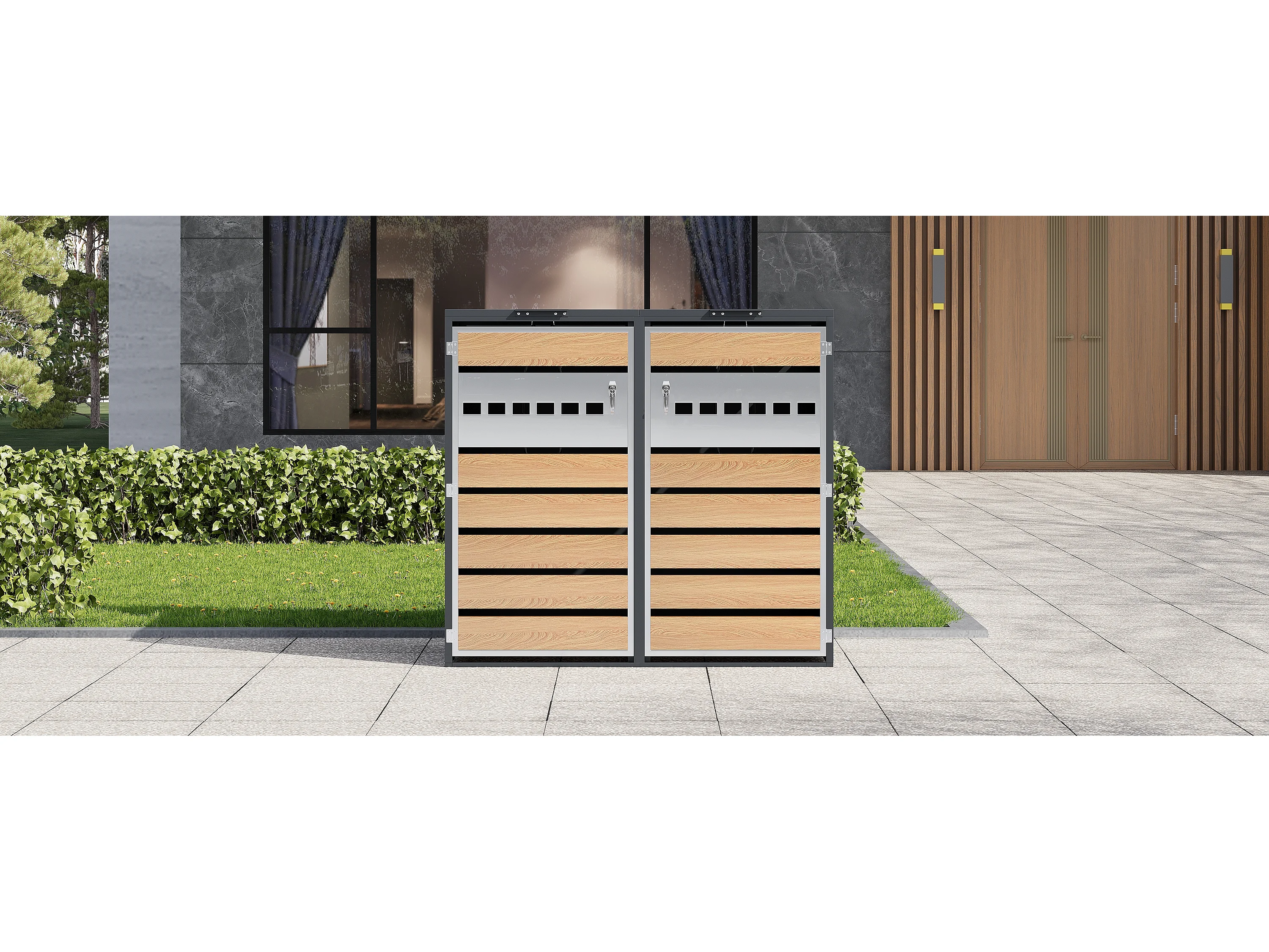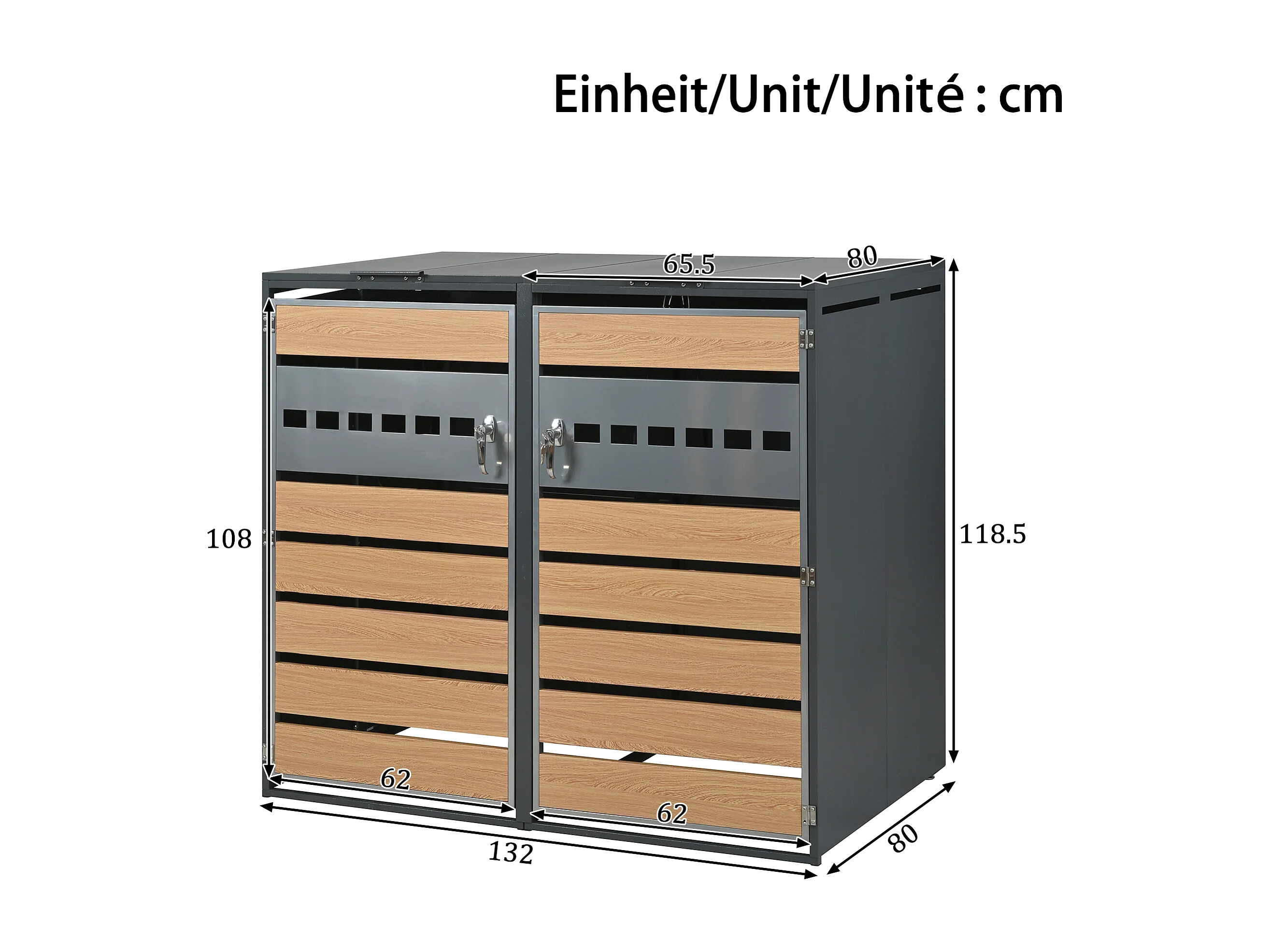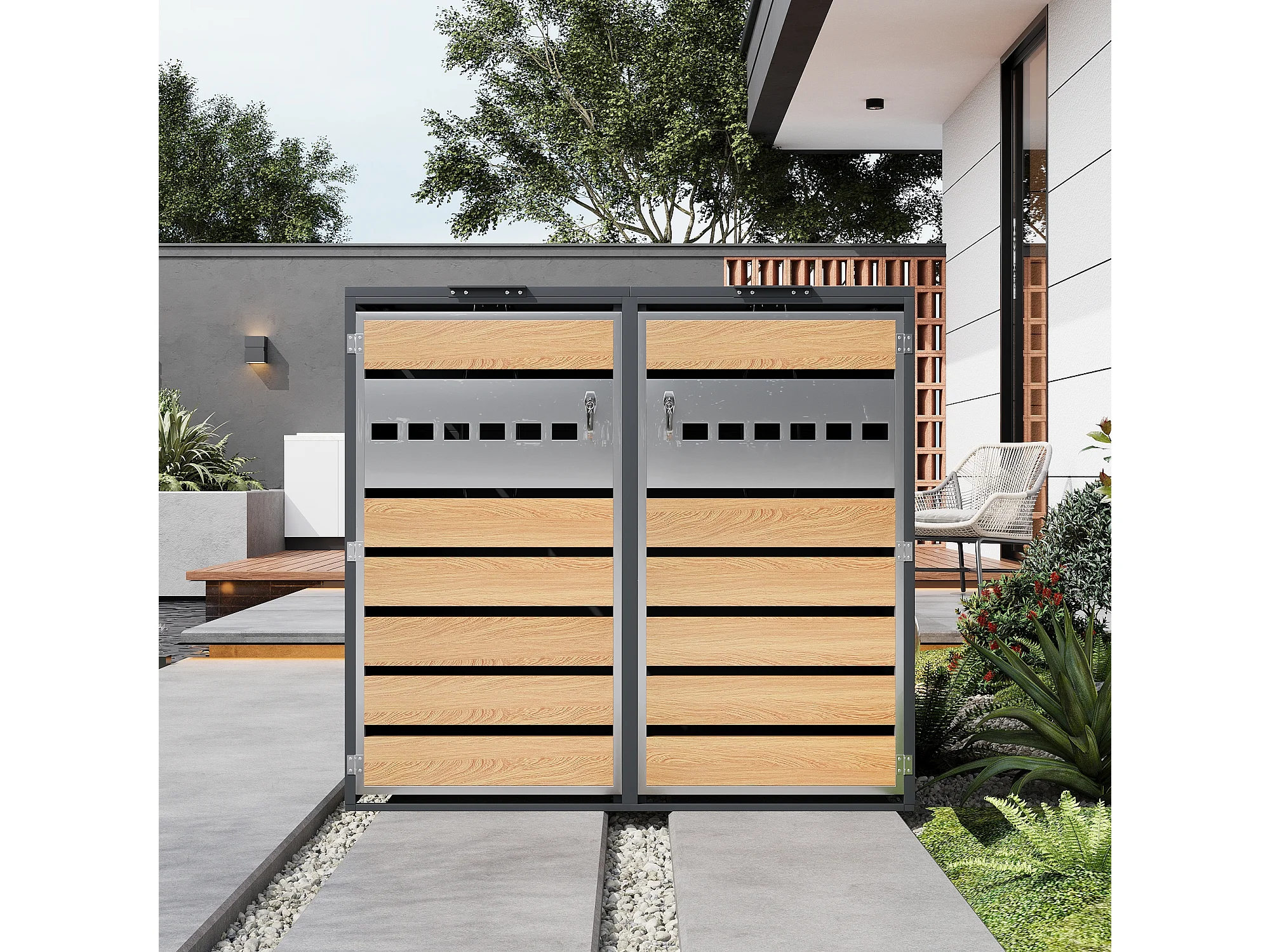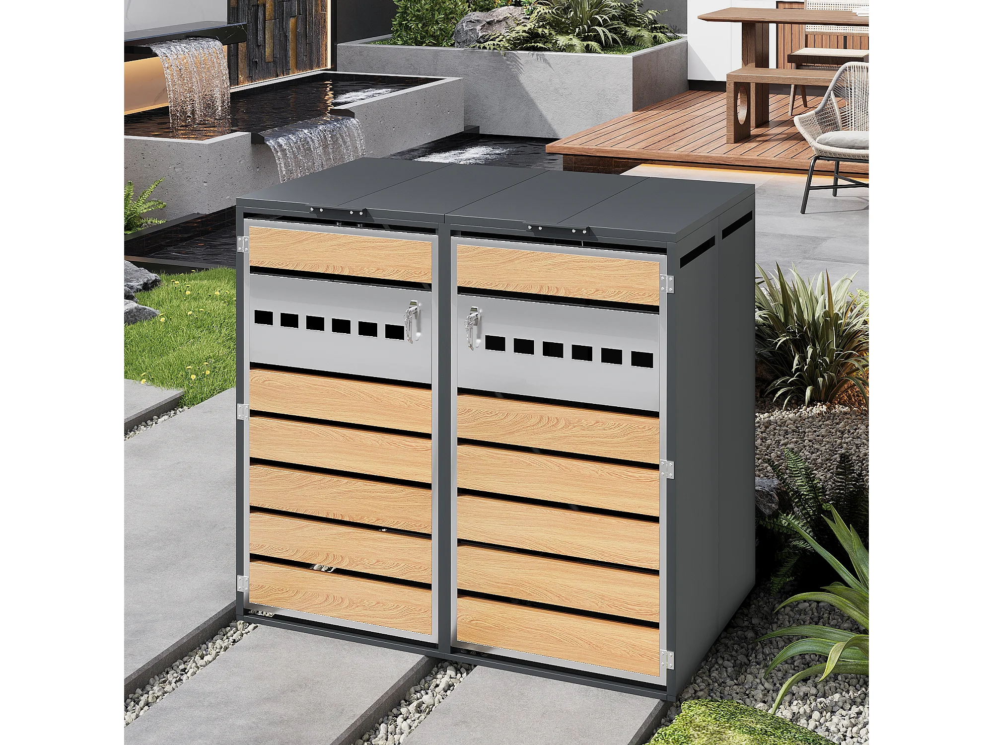 Opbergkast voor 2 tuinvuilnisbakken - 132 x 80 x 118,5 cm - met scharnierend deksel + vergrendelbaar + 2 deuren - metaal - grijs + natuur