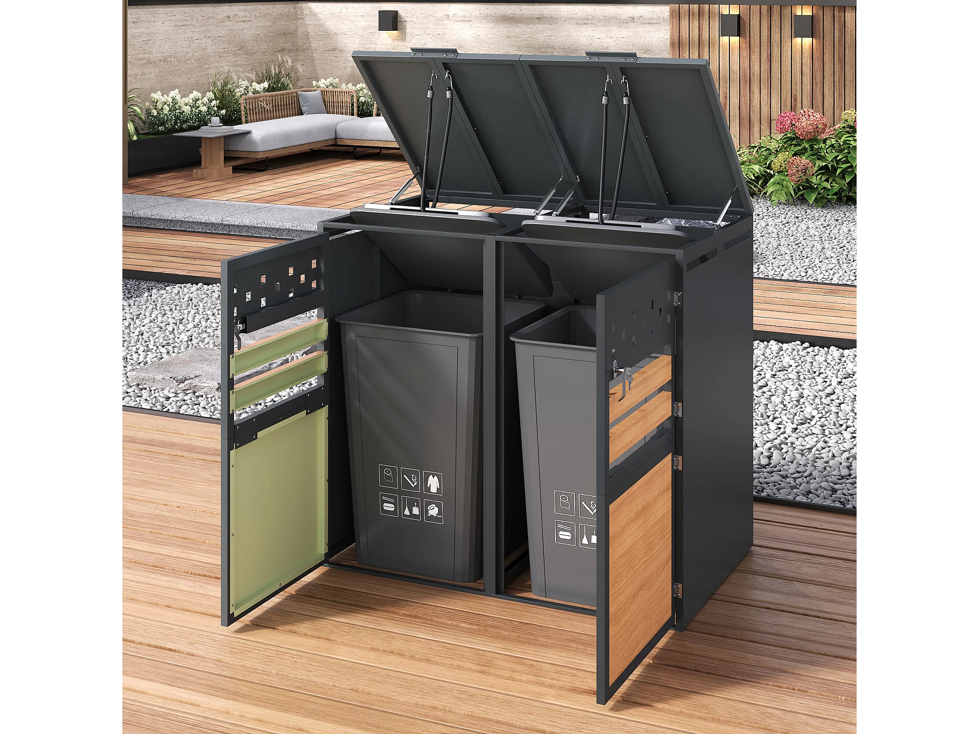 Opbergkast voor 2 tuinvuilnisbakken - 132 x 80 x 120 cm - met scharnierend deksel + vergrendelbaar + 2 deuren - metaal - grijs + natuur