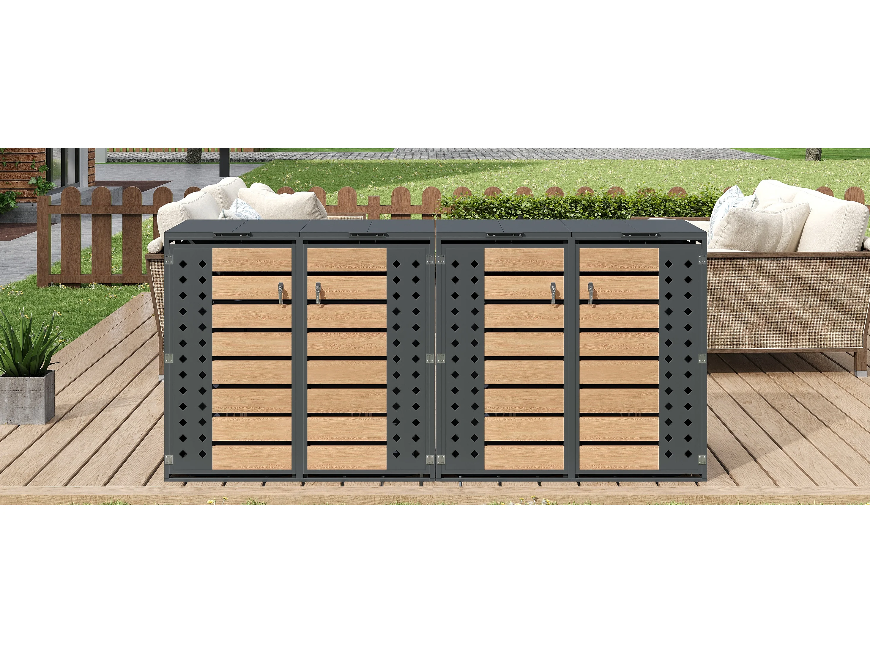 Opbergkast voor 4 tuinvuilnisbakken - 2 x 132 x 80 x 118,5 cm - met scharnierend deksel + vergrendelbaar + 4 deuren - metaal - grijs + natuur
