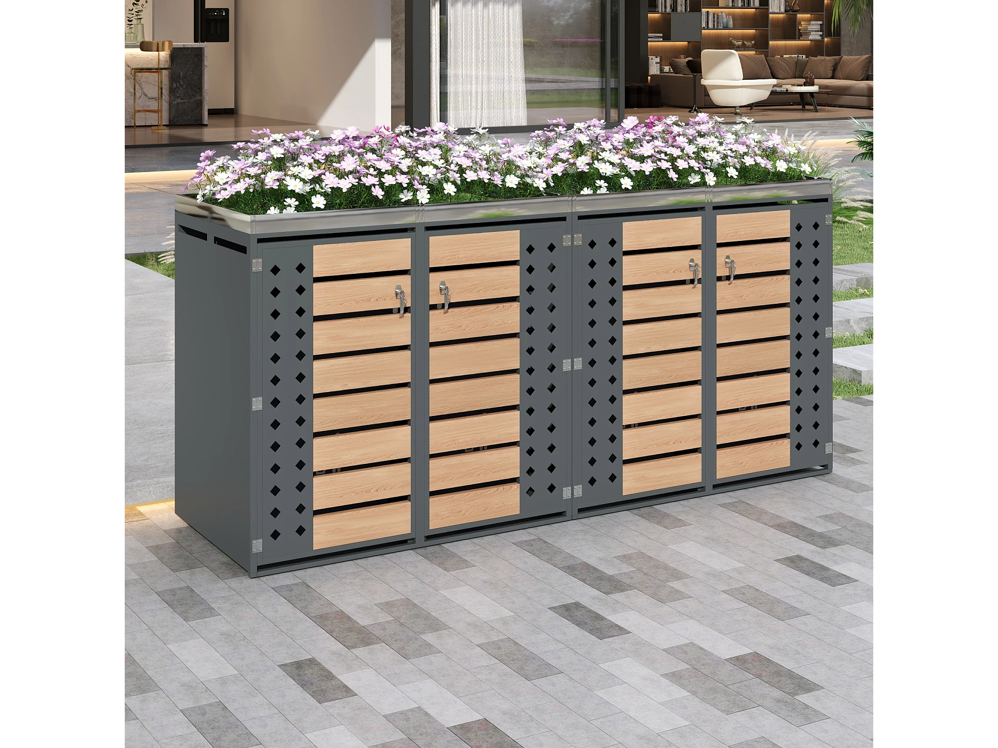 Opbergkast voor 4 tuinvuilnisbakken - 2 x 132 x 80 x 124,5 cm - met 4 deuren + beplanting + vergrendelbaar - metaal - grijs + natuur