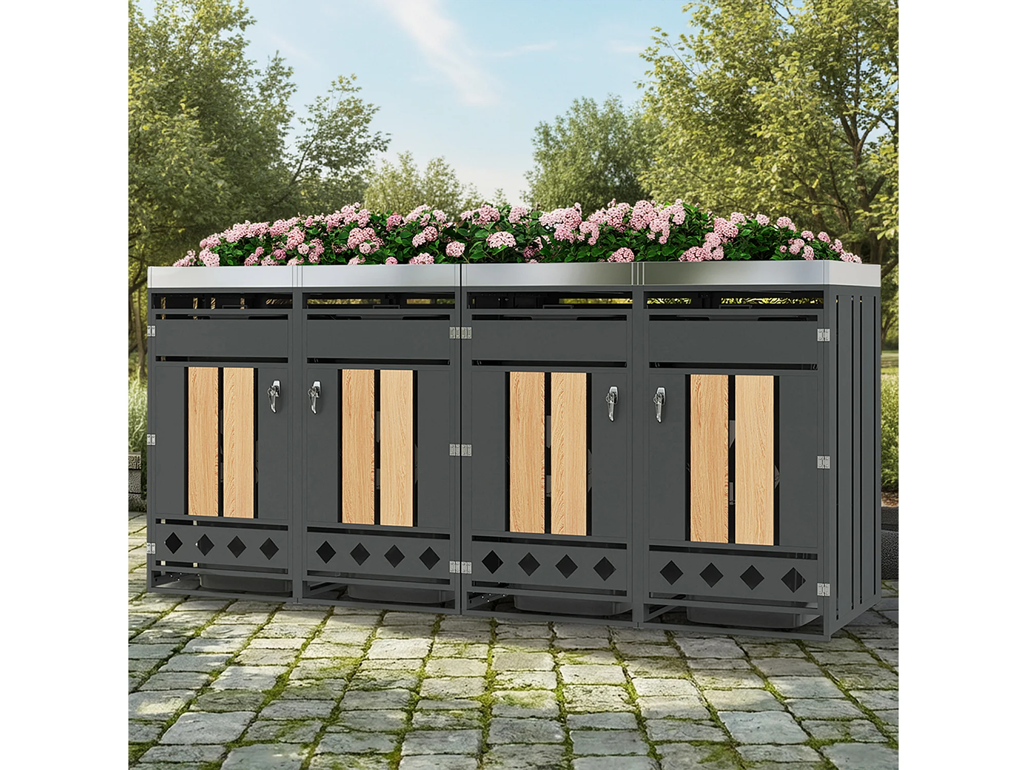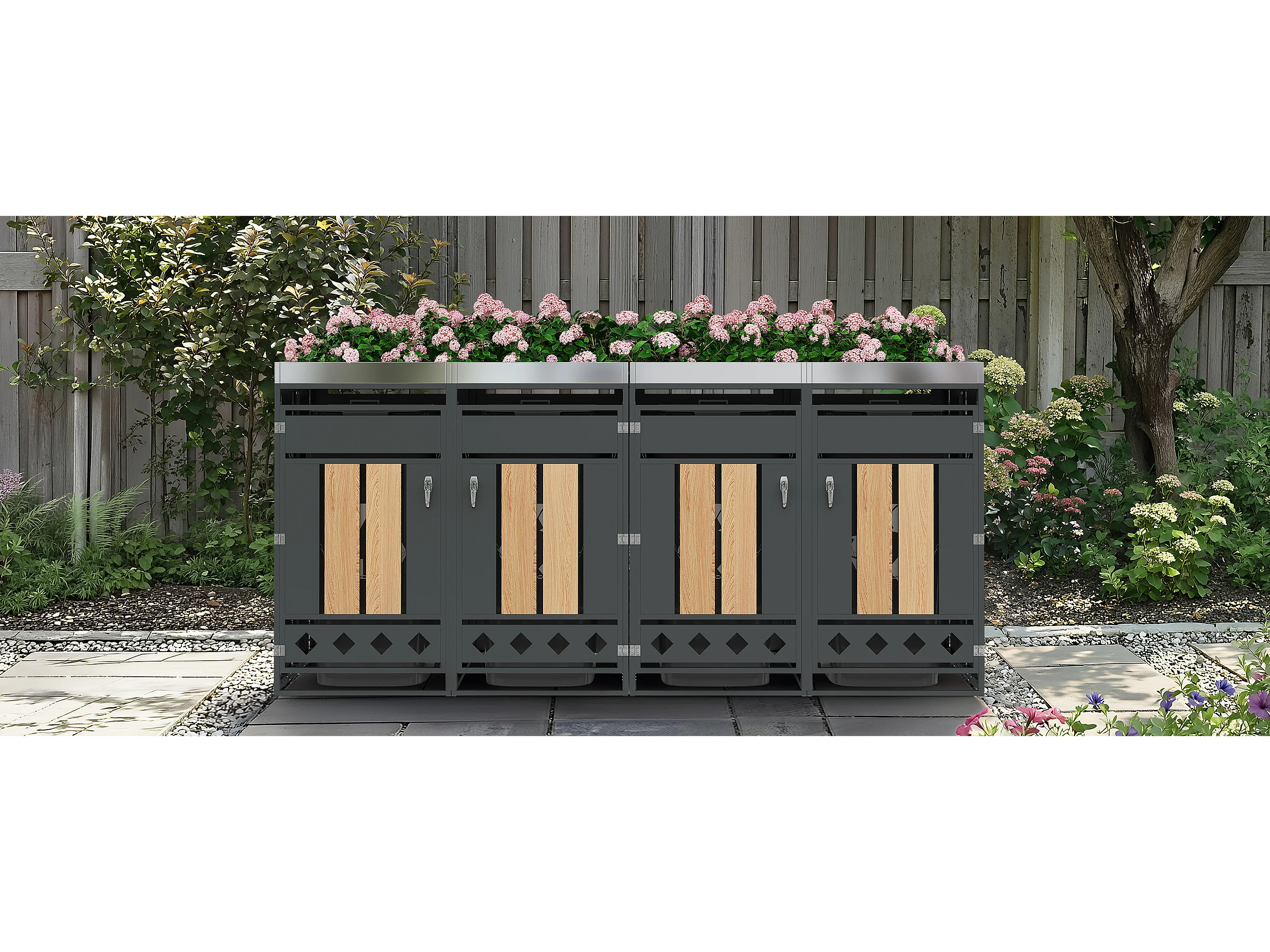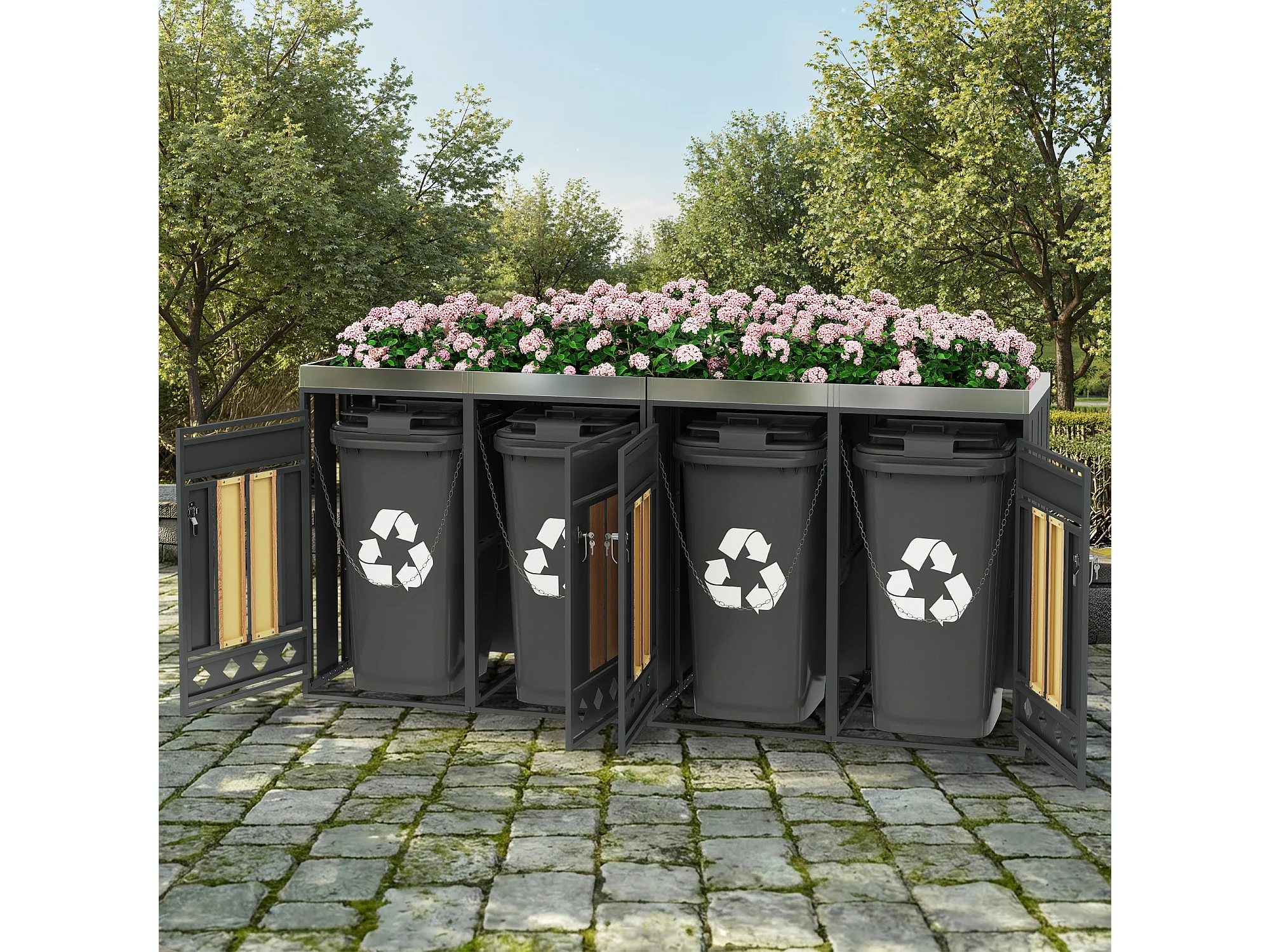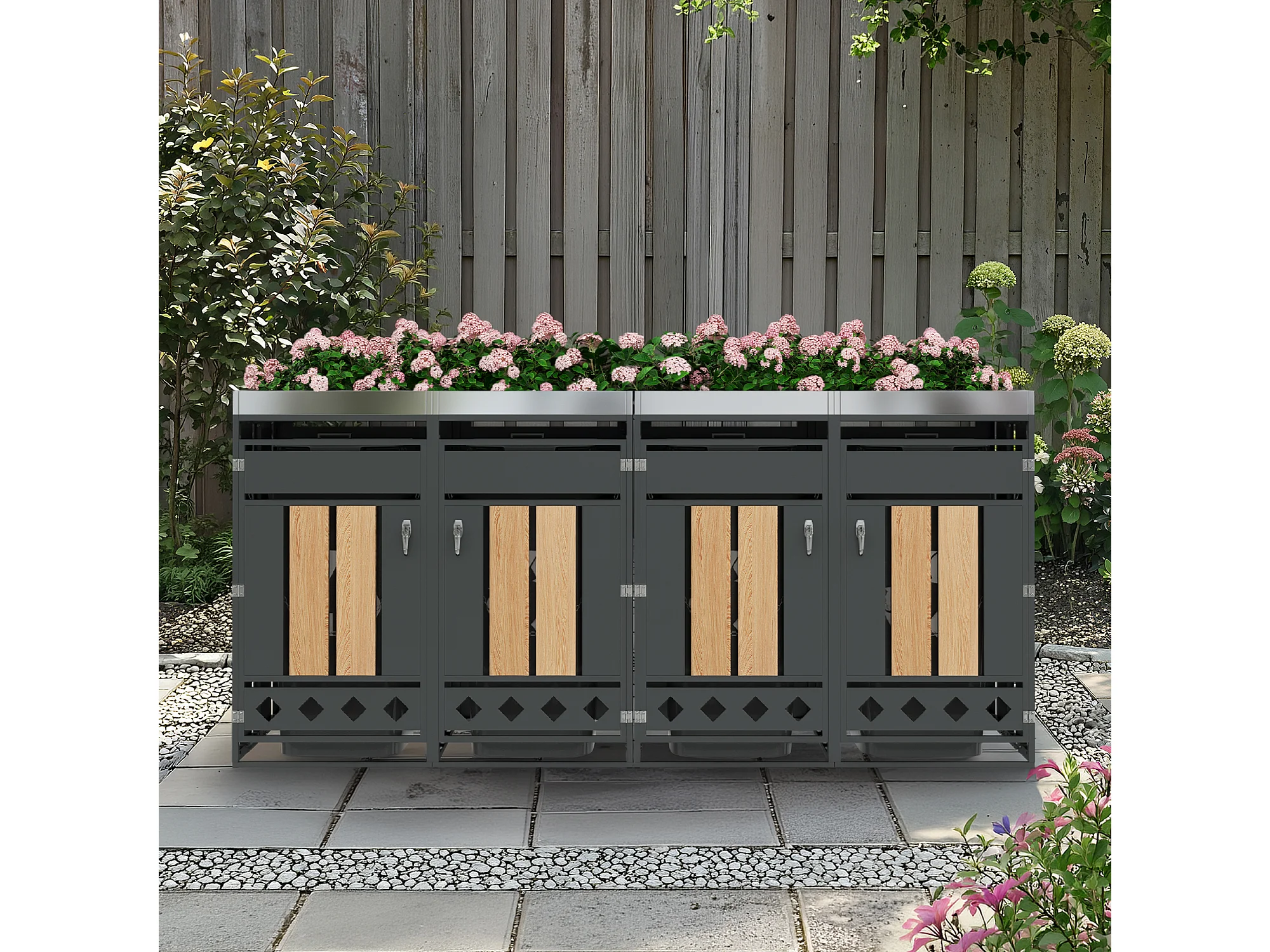 Opbergkast voor 4 tuinvuilnisbakken - 2 x 132 x 80 x 124,5 cm - met vergrendelbaar + 4 deuren + beplanting - metaal - grijs + natuur