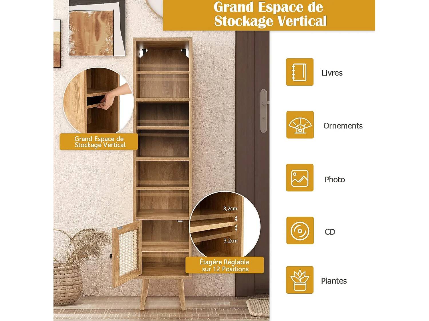 Opbergkolommeubels met rotandeur en massief houten poten, badkamermeubel verstelbare plank, Boheemse stijl, voor woonkamer, keuken, slaapkamer, 29,5x29,5x137cm