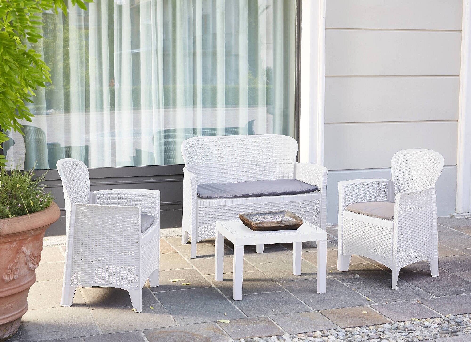 Dbalestrer outdoor loungeset, Tuinset met 2 fauteuils, 1 bank en 1 opbergtafel, Rotan effect met kussens, 100% Made in Italy, Wit