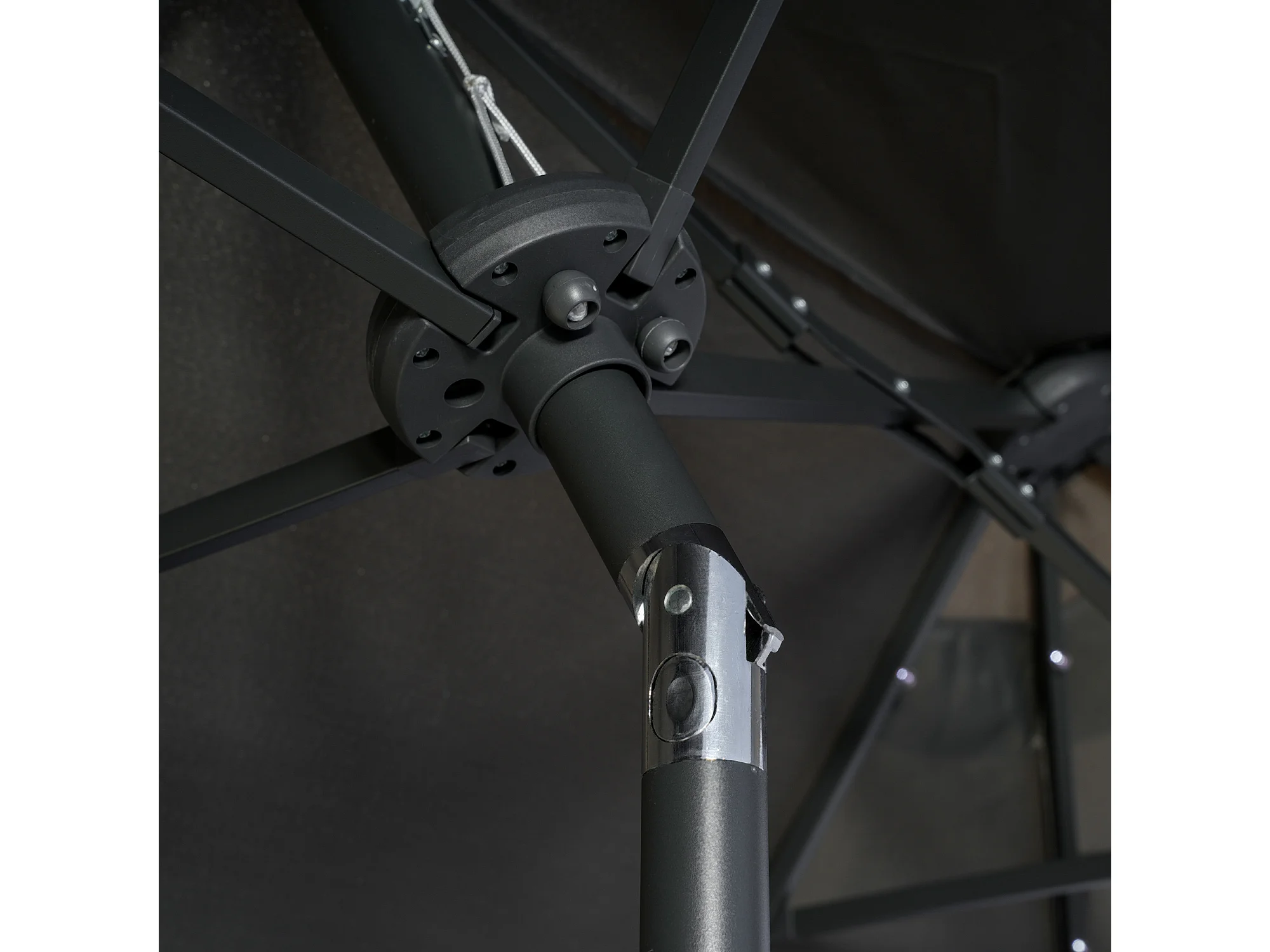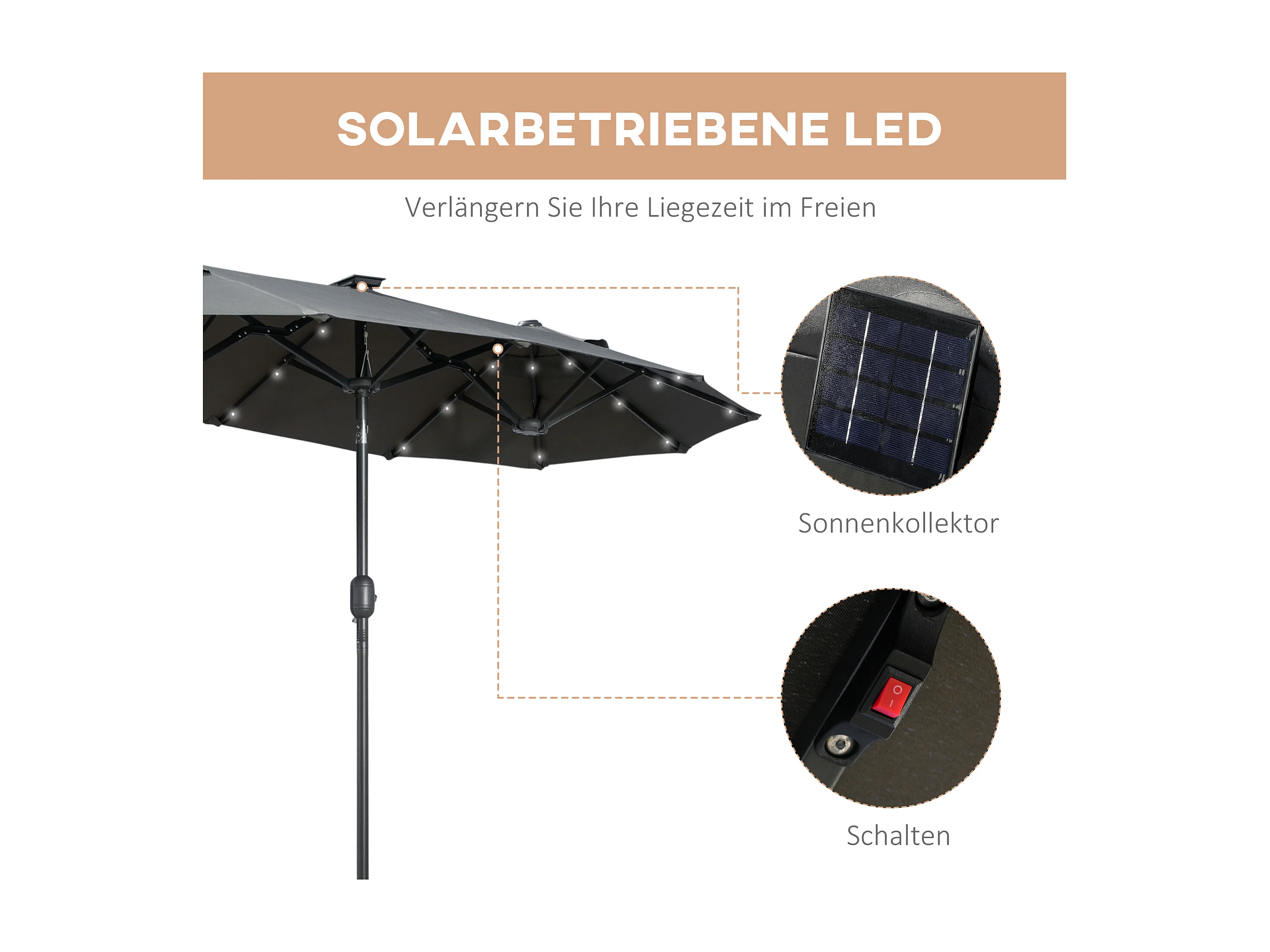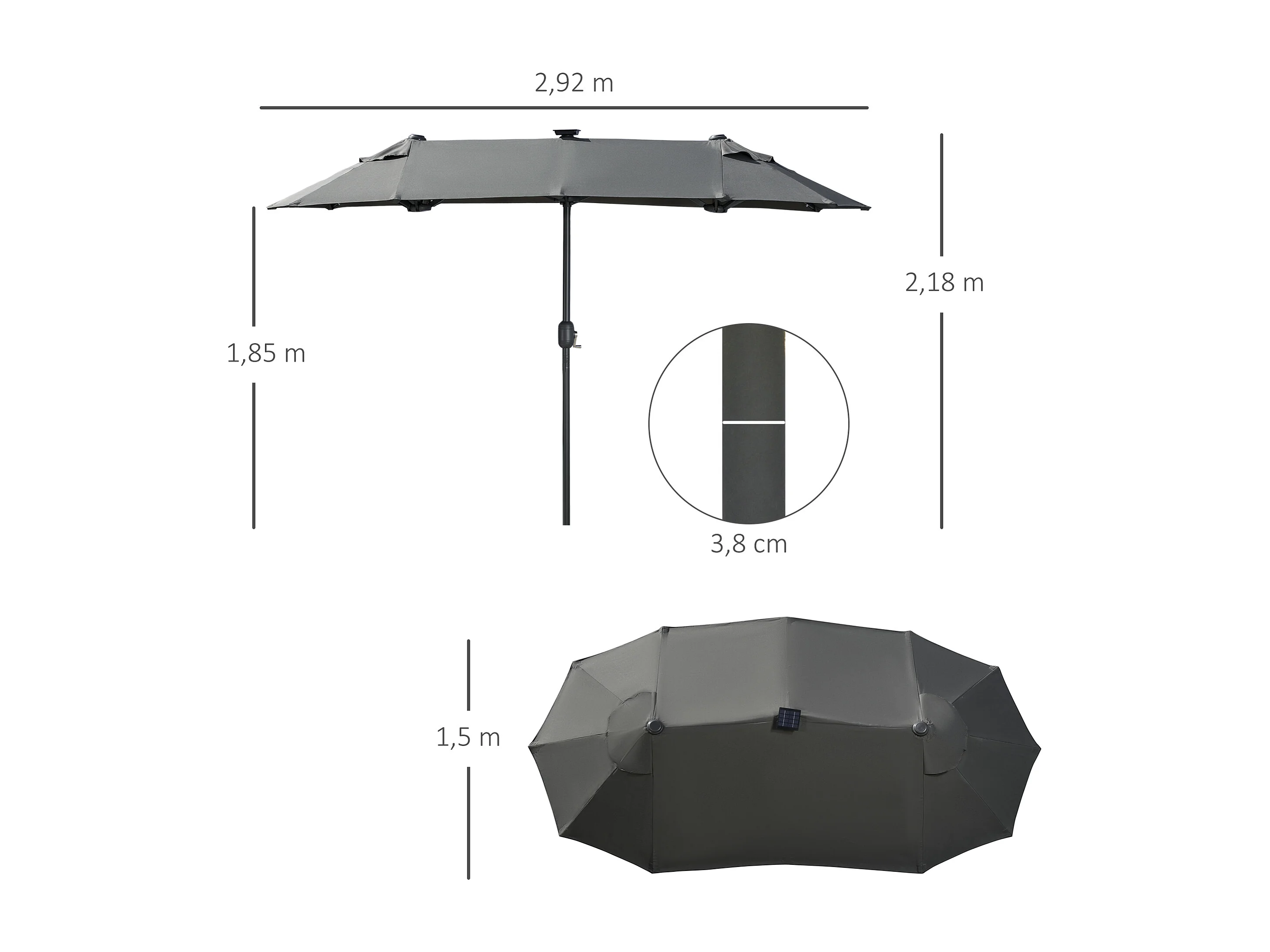 Ovale dubbele parasol met solar LED, polyester en staal, donkergrijs (292x150x218cm)