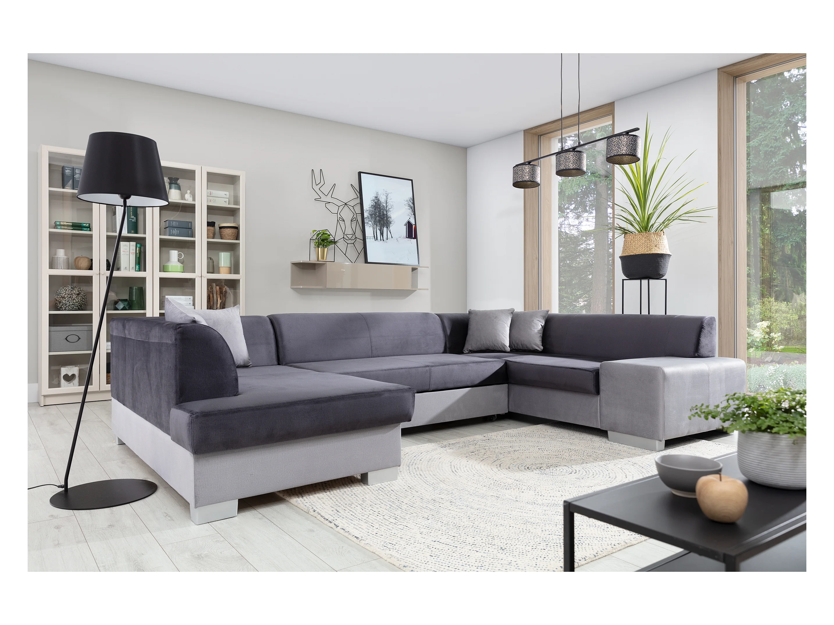 Linker U slaapbank in donkergrijze stof en grijze imitatie met Tovy opbergdoos 340 cm