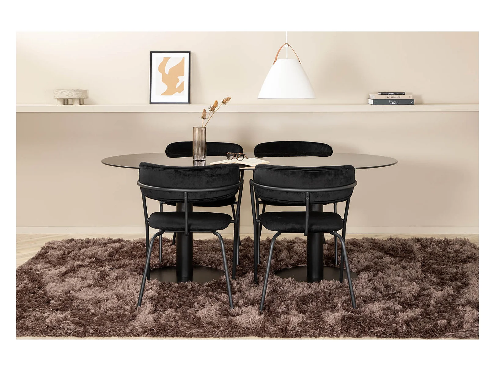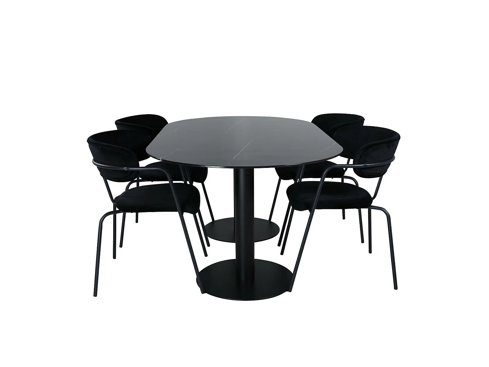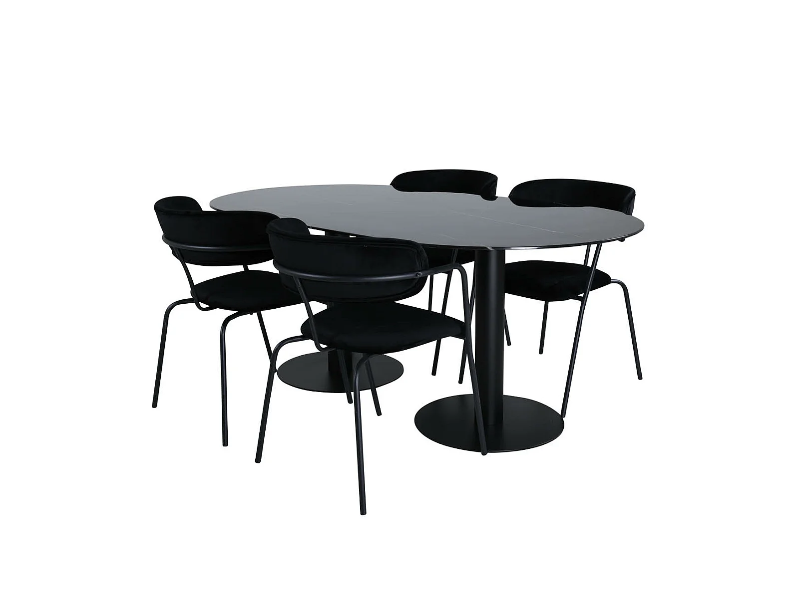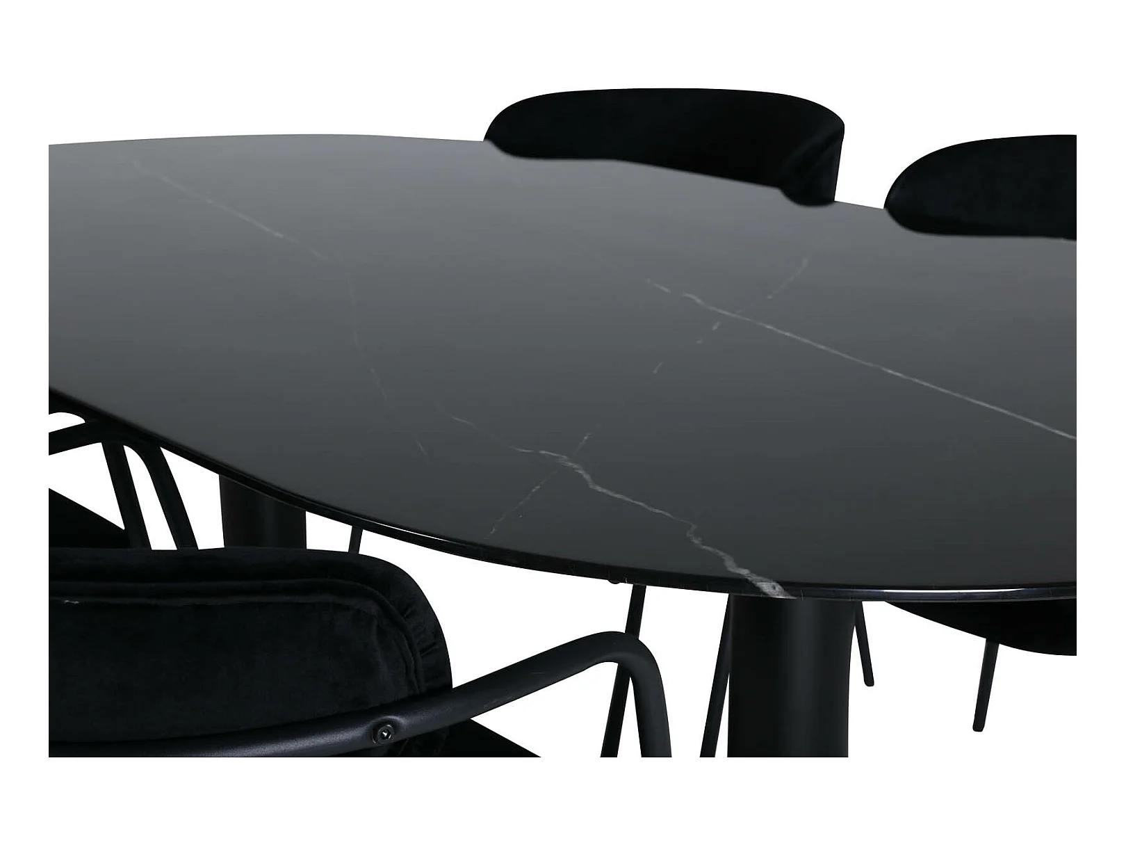 Pillan eethoek eetkamertafel zwart glas marmer decor en 4 Arrow eetkamerstal velours zwart.