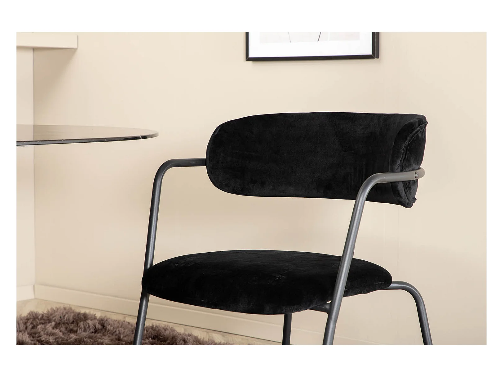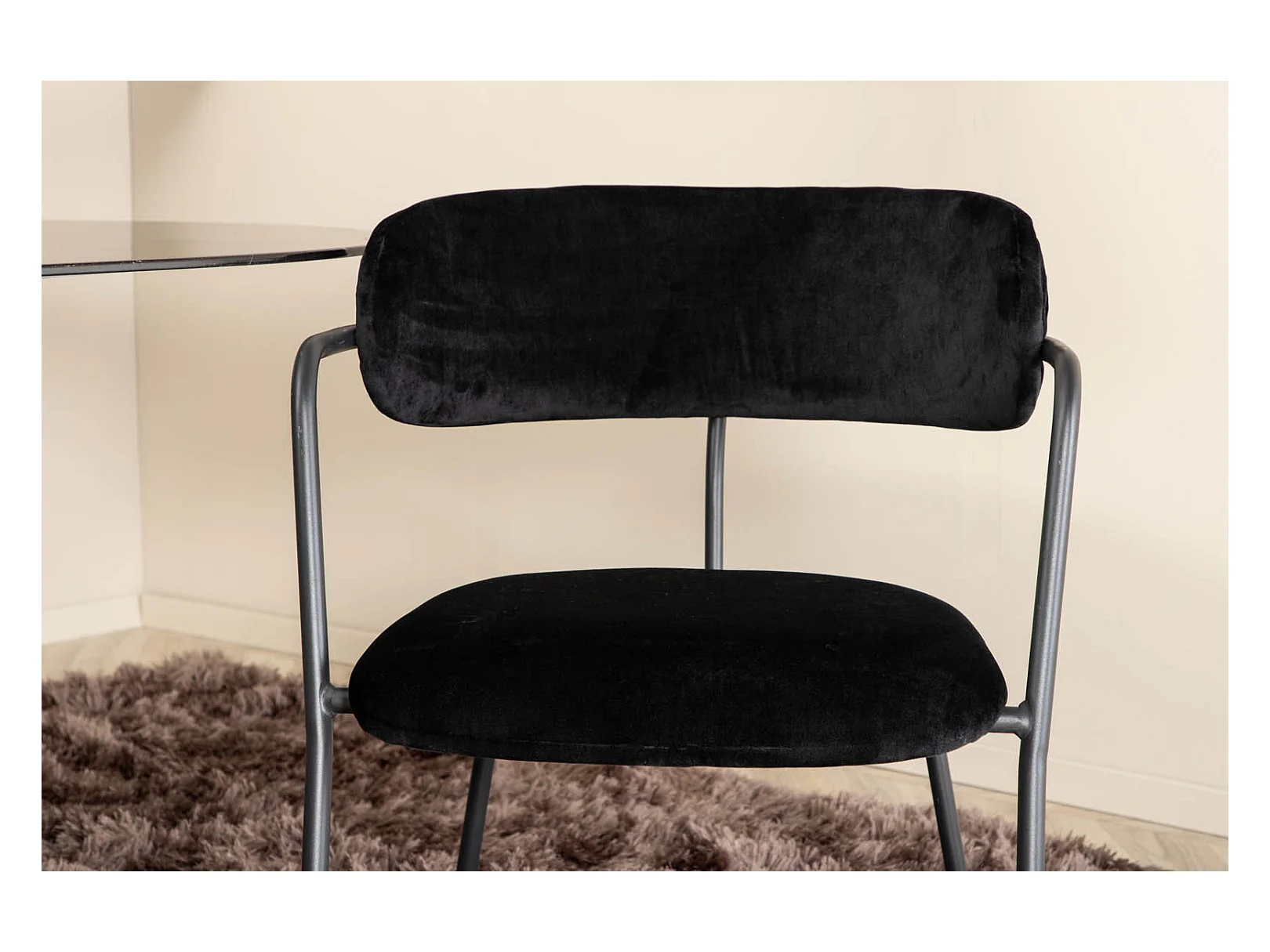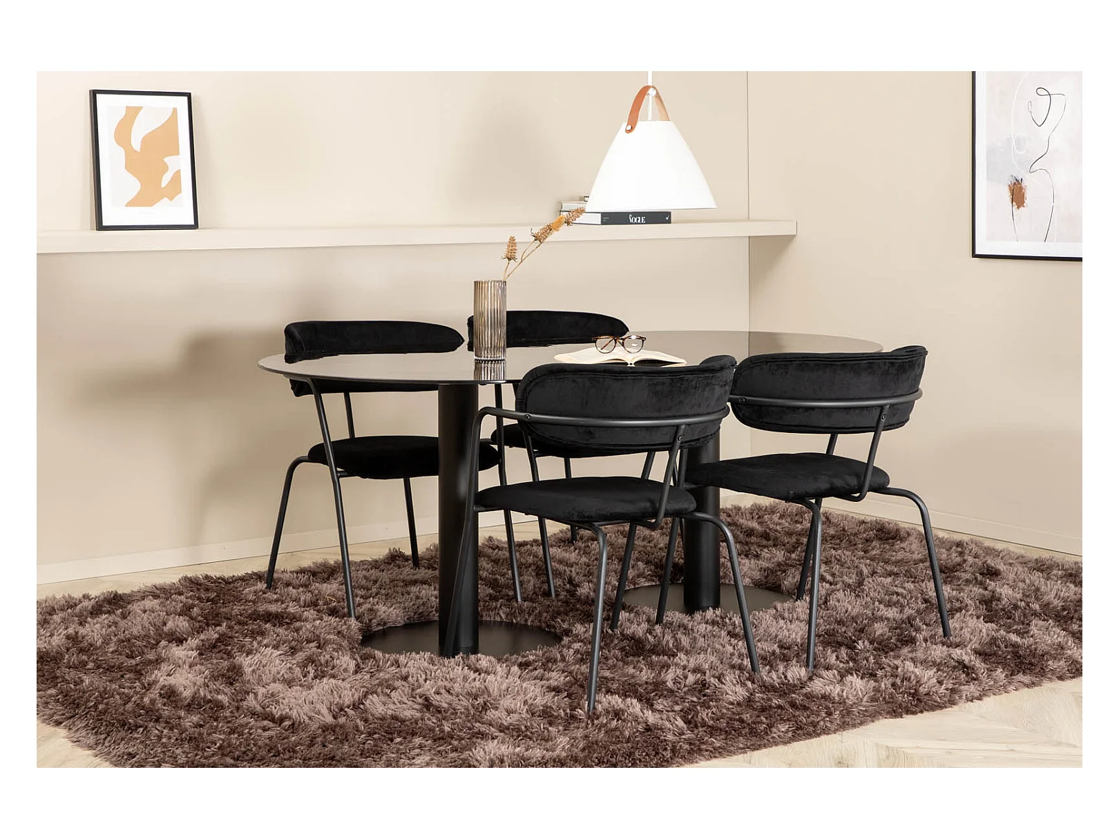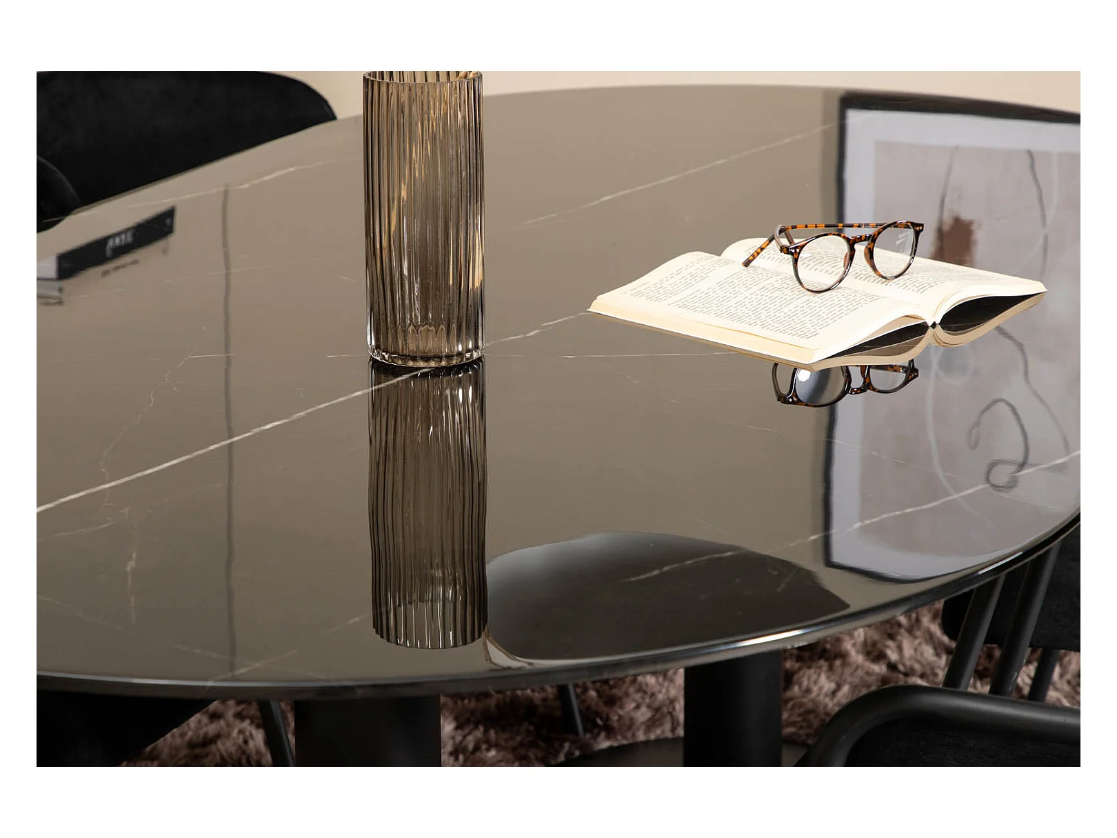Pillan eethoek eetkamertafel zwart glas marmer decor en 4 Arrow eetkamerstal velours zwart.