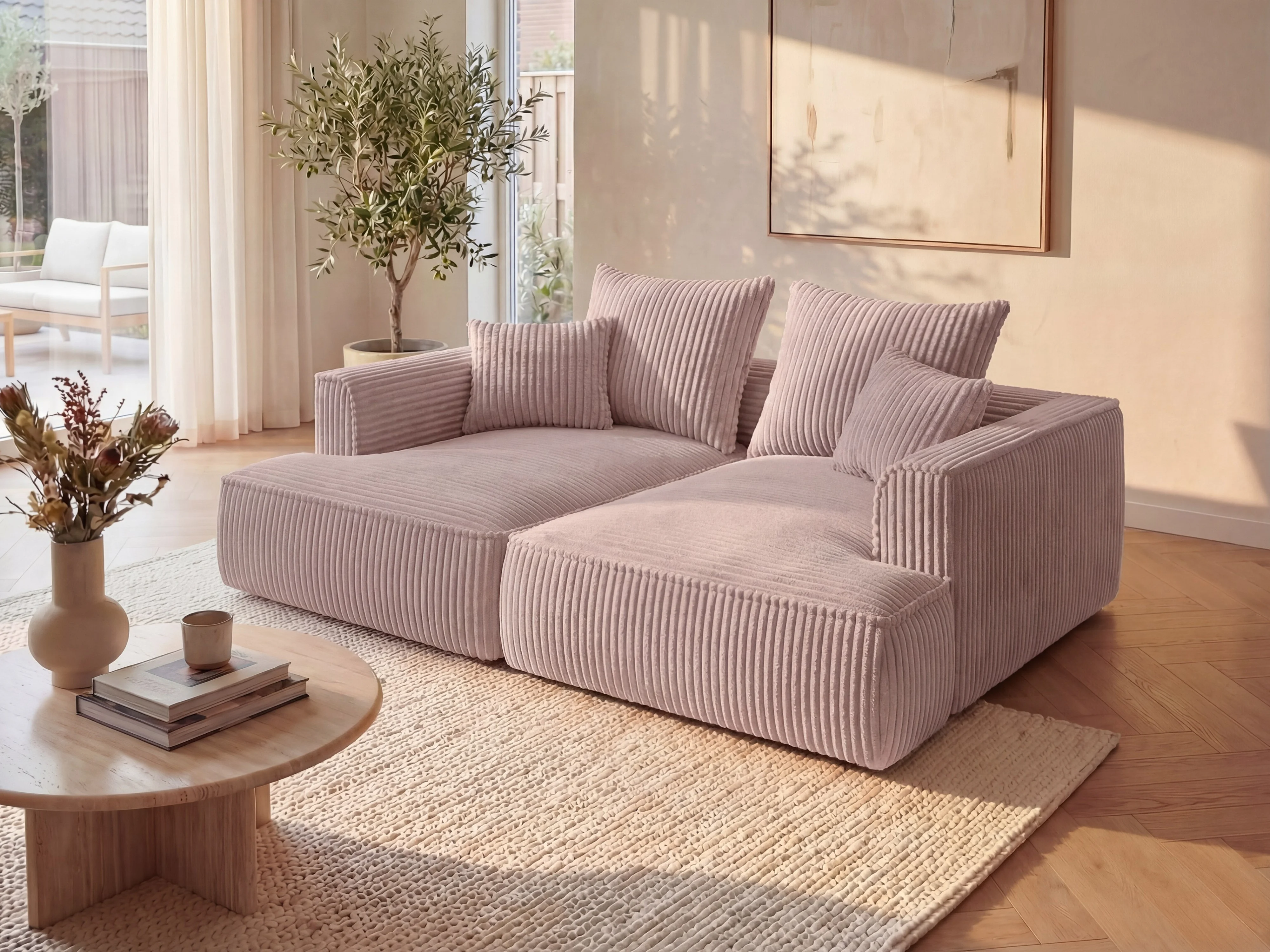 Comfortabele driezitsbank met diepe zitting van poederroze ribfluweel met brede ribbels PINETA