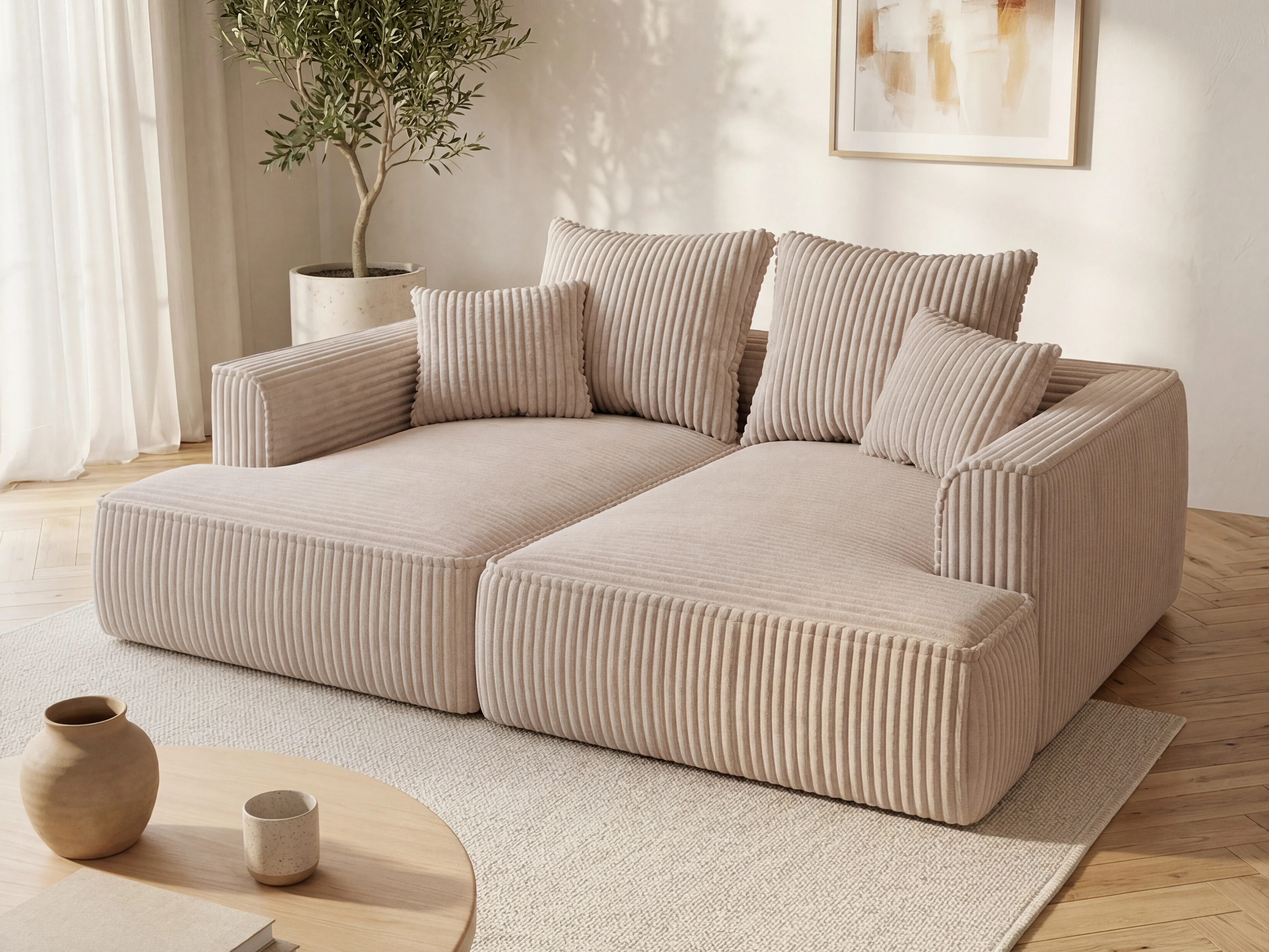 Comfortabele driezitsbank met diepe zitting van taupegrijs ribfluweel met brede ribbels PINETA