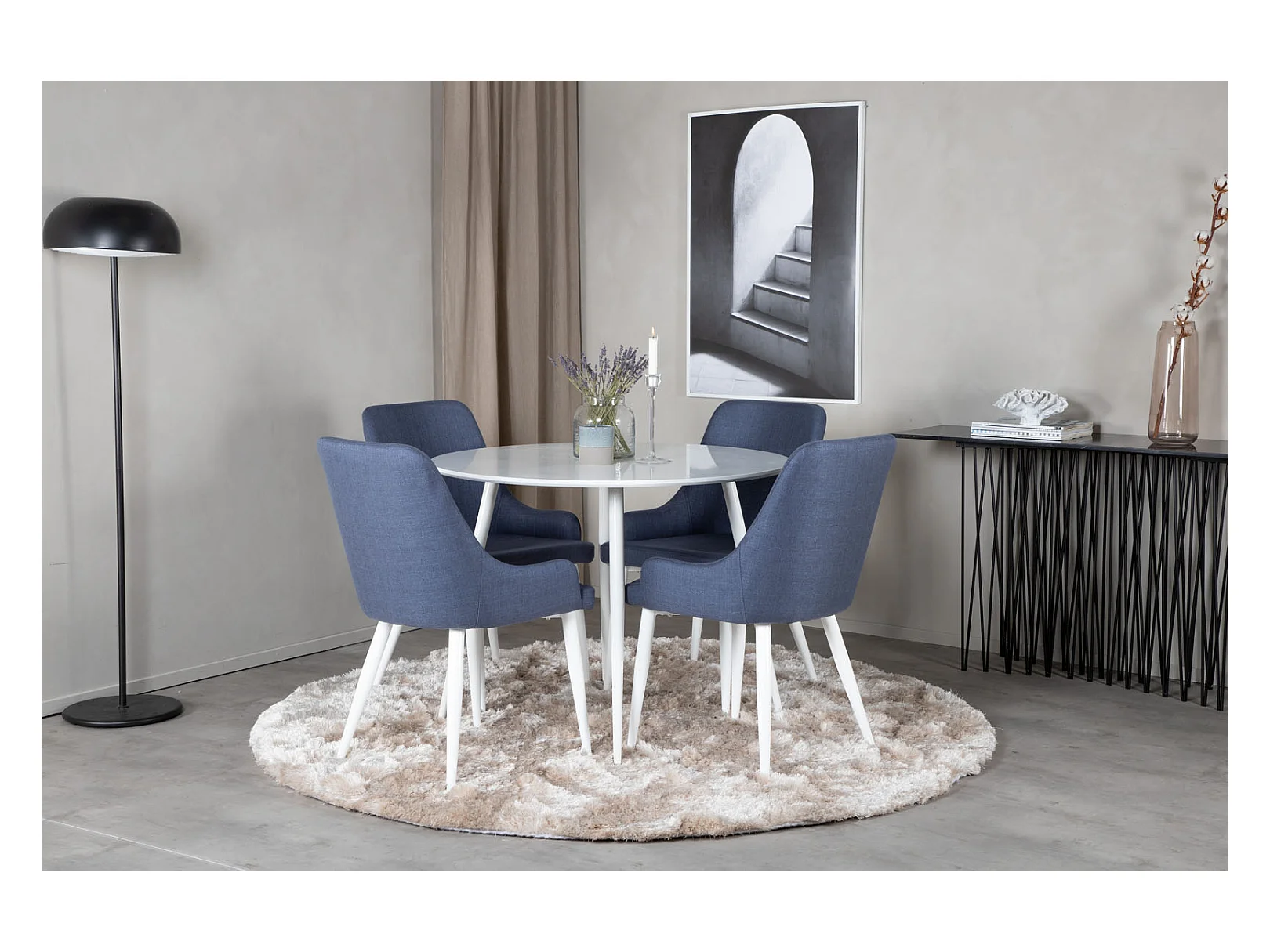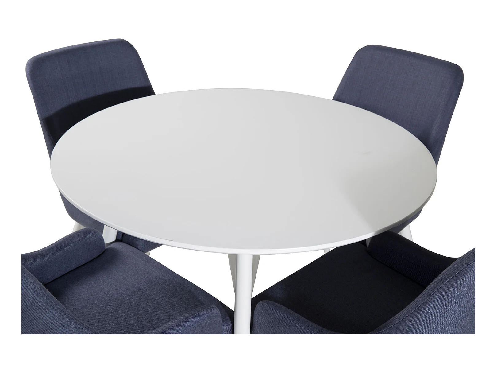 PlazaWHWH100 eethoek eetkamertafel wit en 4 Plaza eetkamerstal blauw, wit.