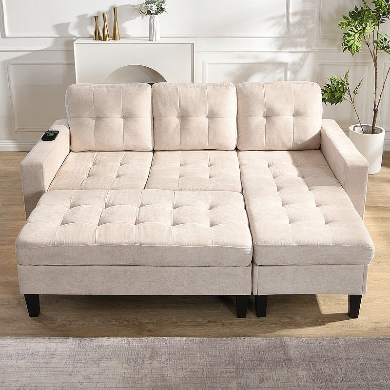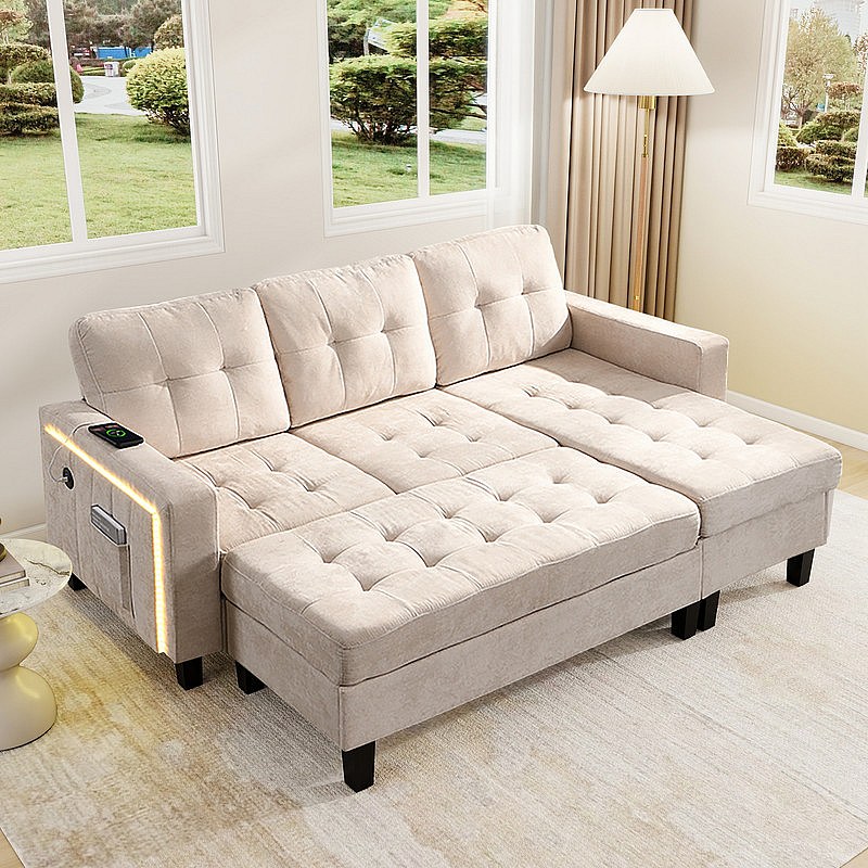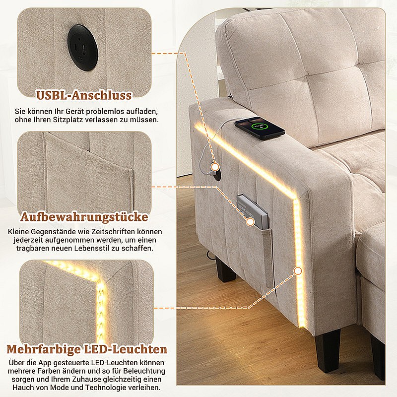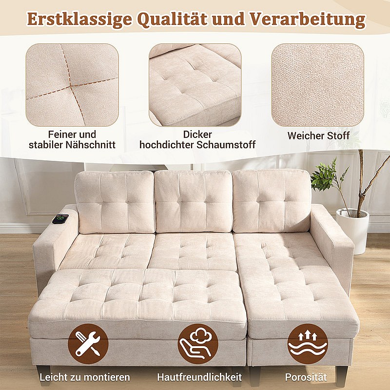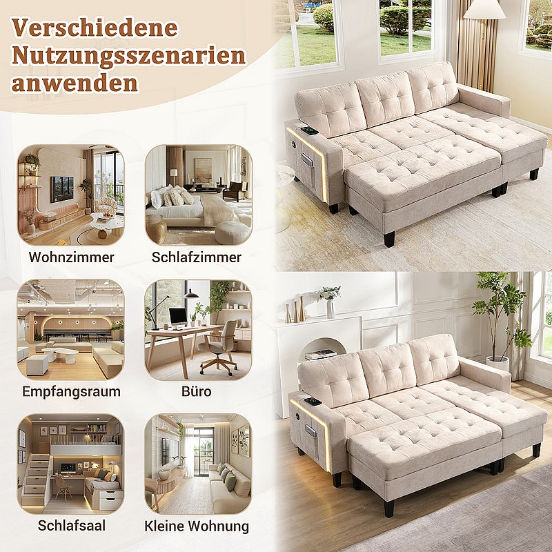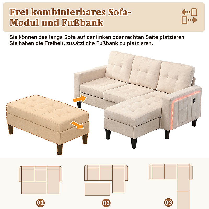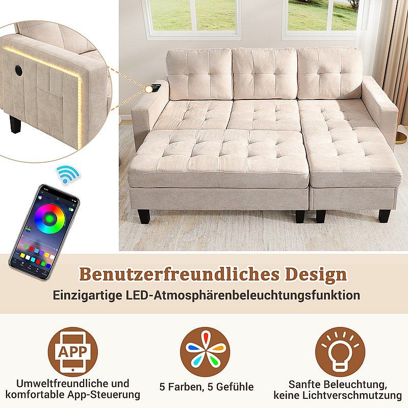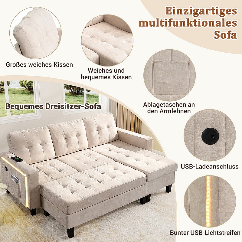 Rechte Hoekbank Convertible 3-zits - met Pouf, LED en USB - Slaapgedeelte 156x115 cm - Chenille Stof - Beige