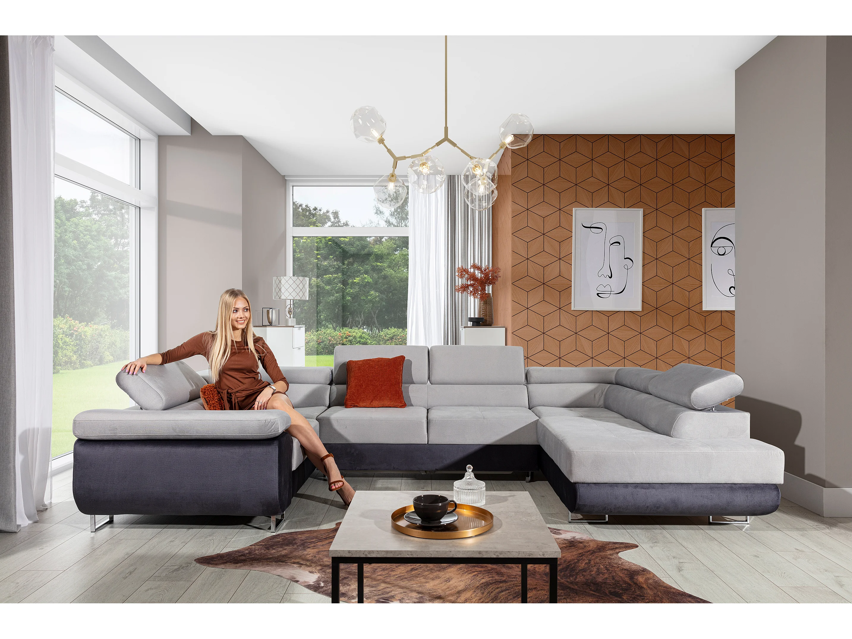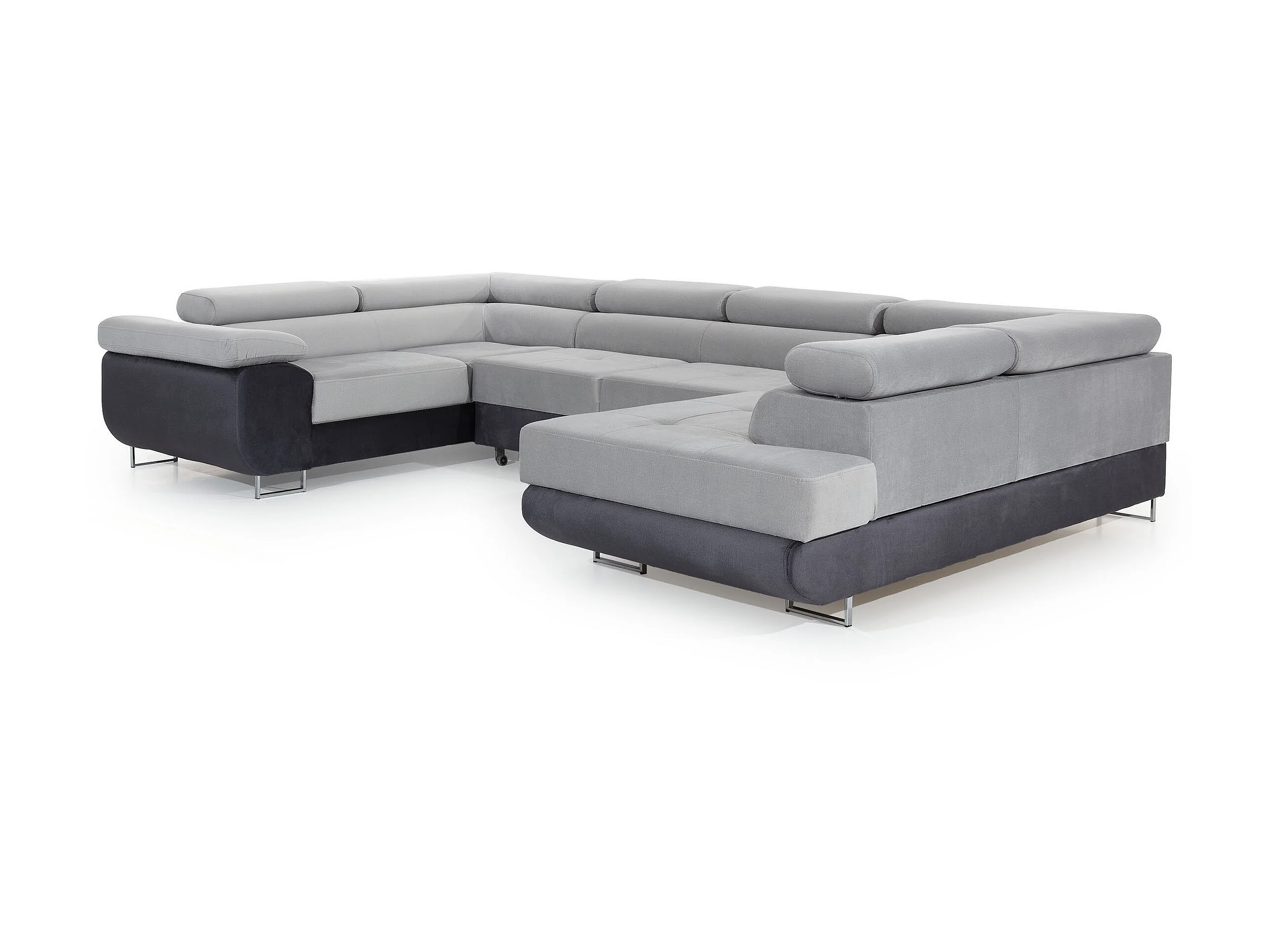 Linker U slaapbank in donkergrijze stof en wit kunstleer met Tovy opbergdoos 340 cm