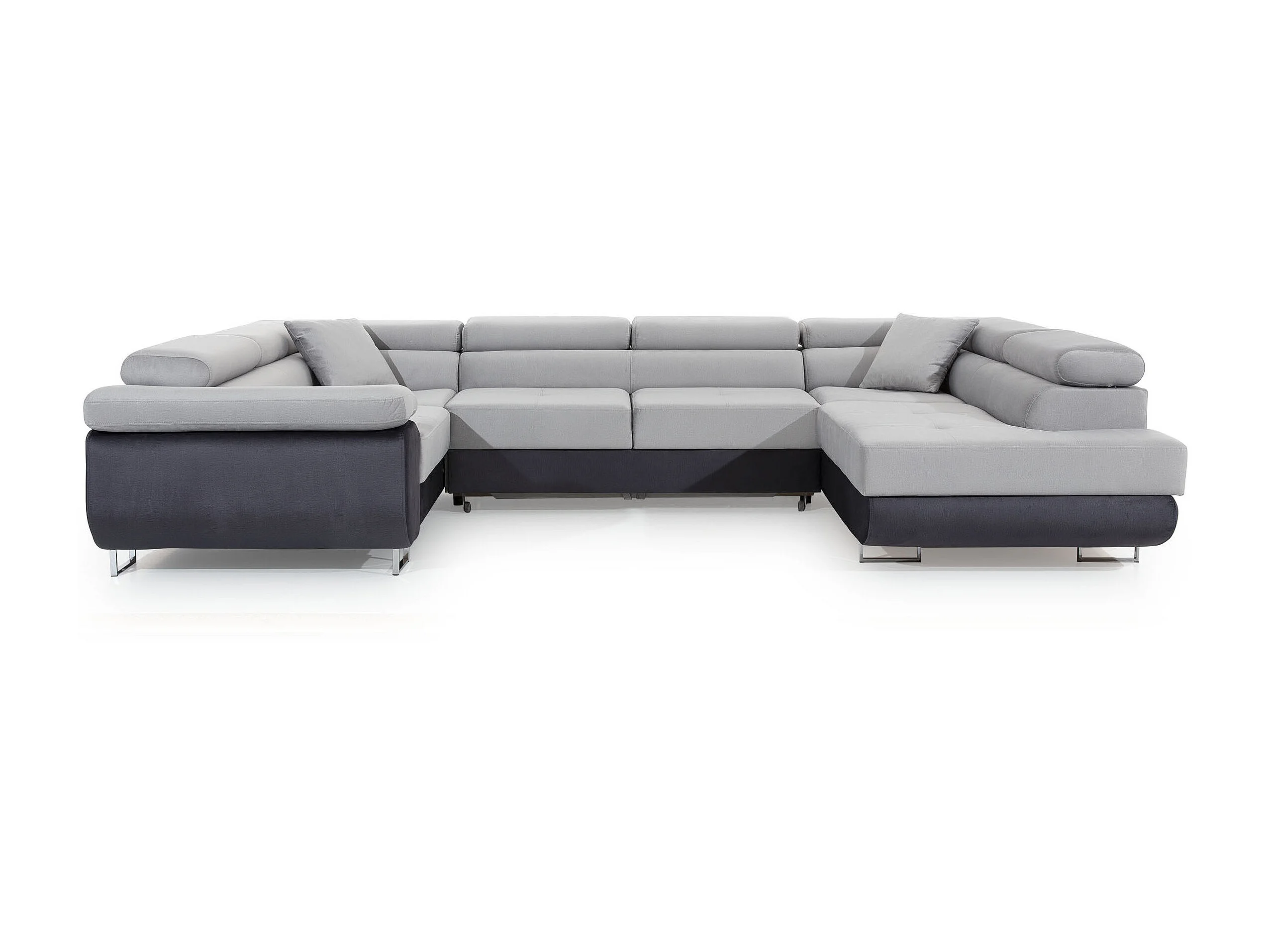 Rechte U-vormige slaapbank in lichtgrijze stof en zwart kunstleer met Tovy opbergdoos 340 cm