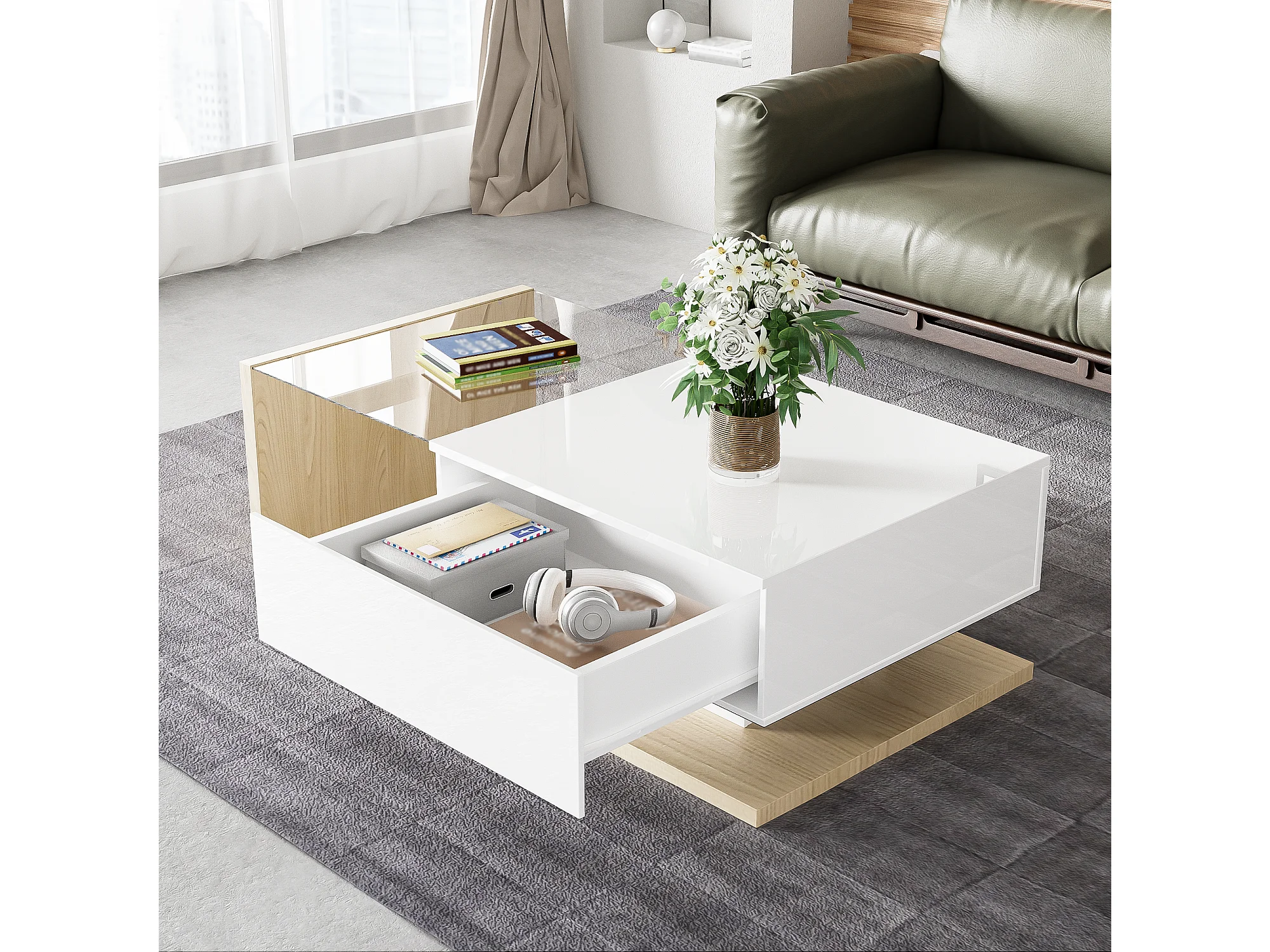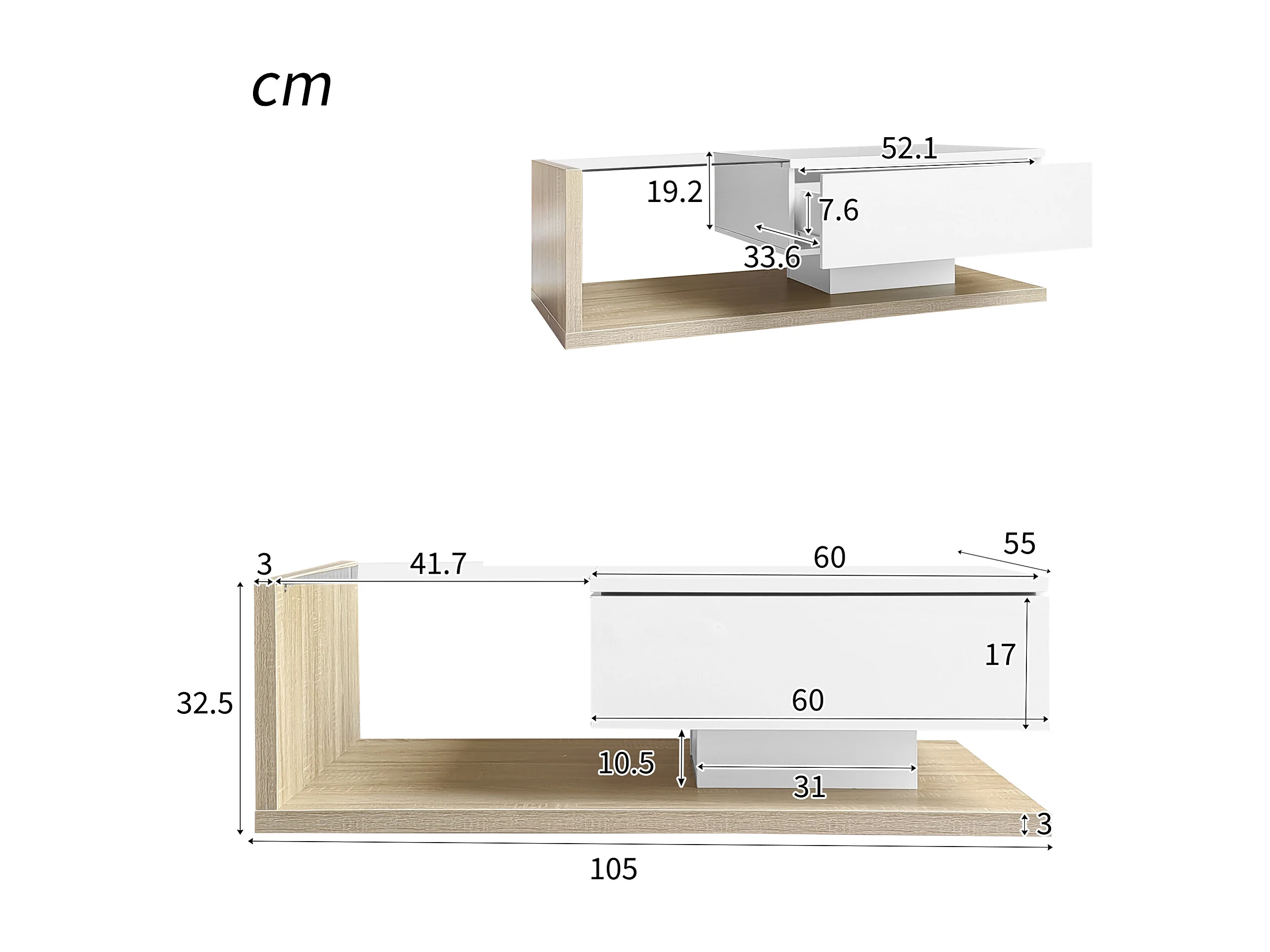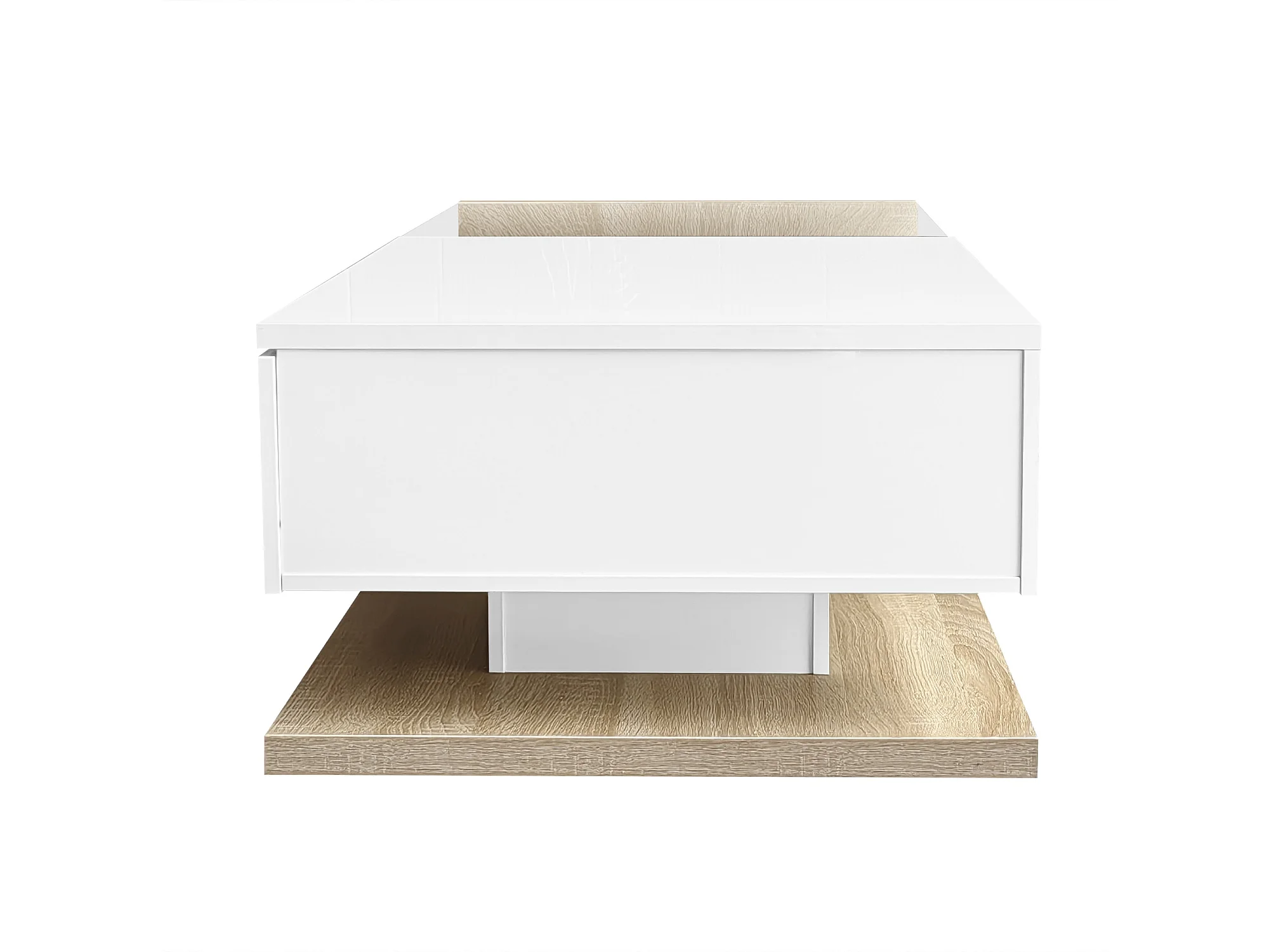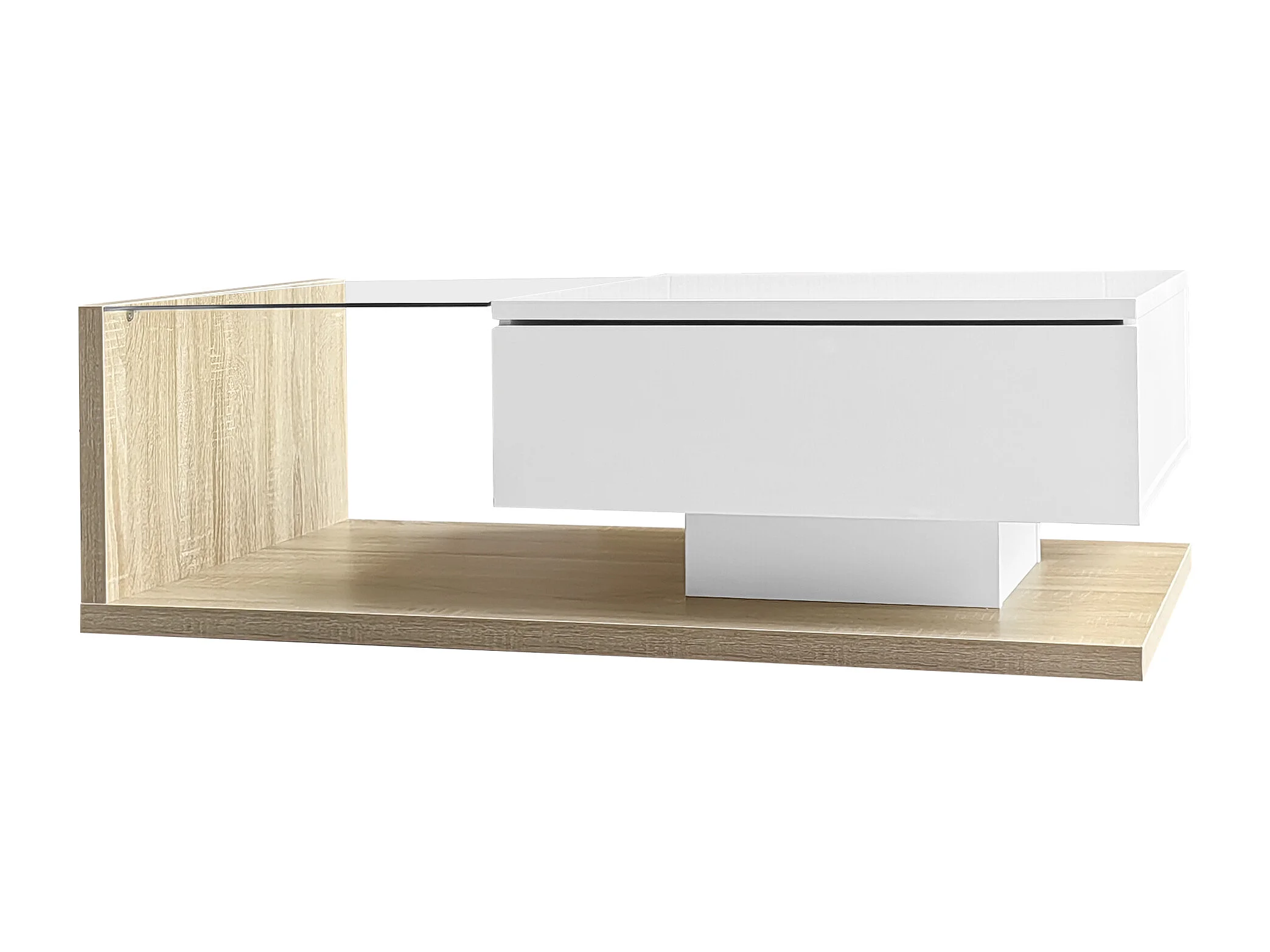 Rechthoekige salontafel 105x55x32,5cm met lade, onderstel in wit en licht hout, glazen blad