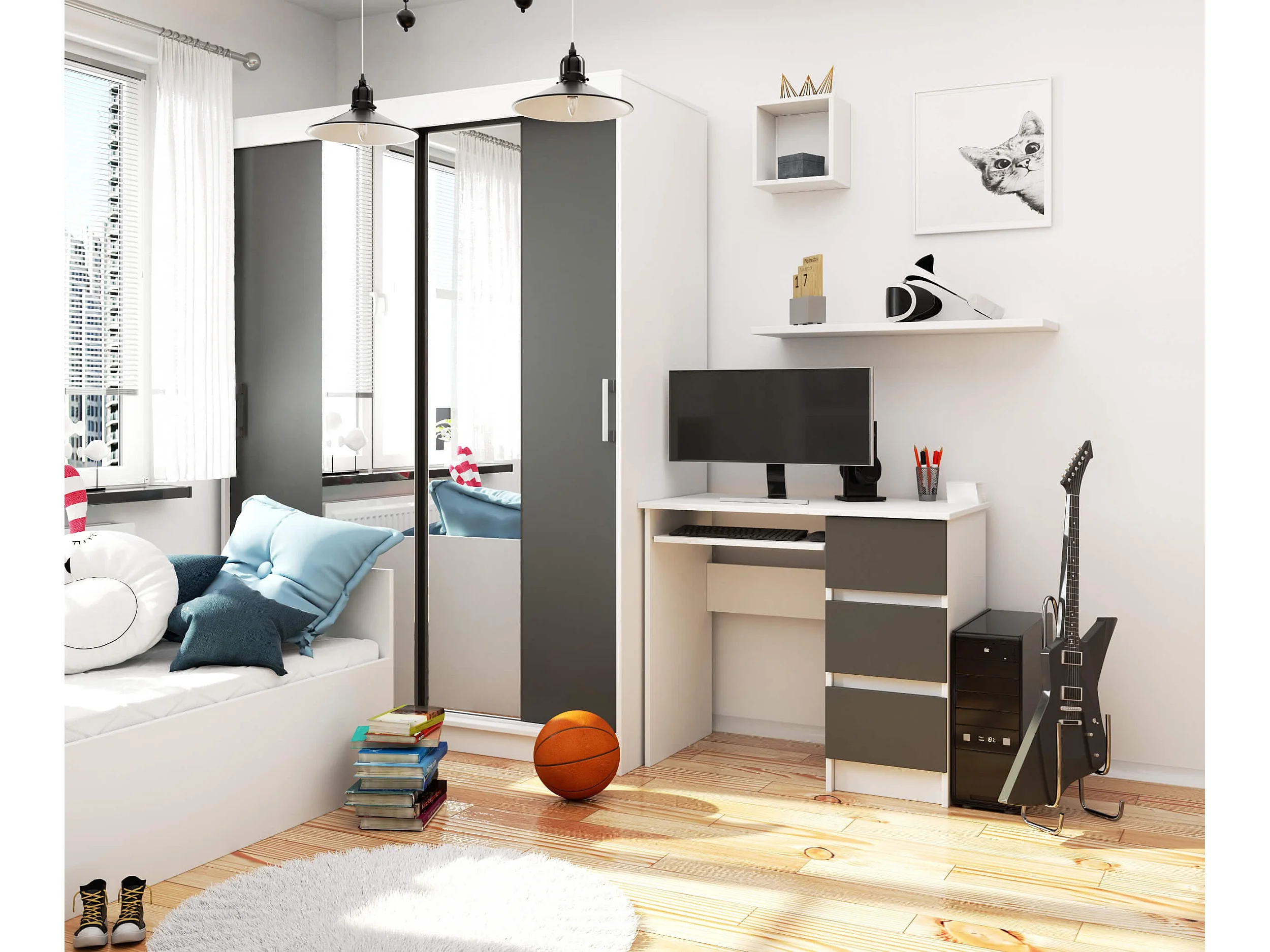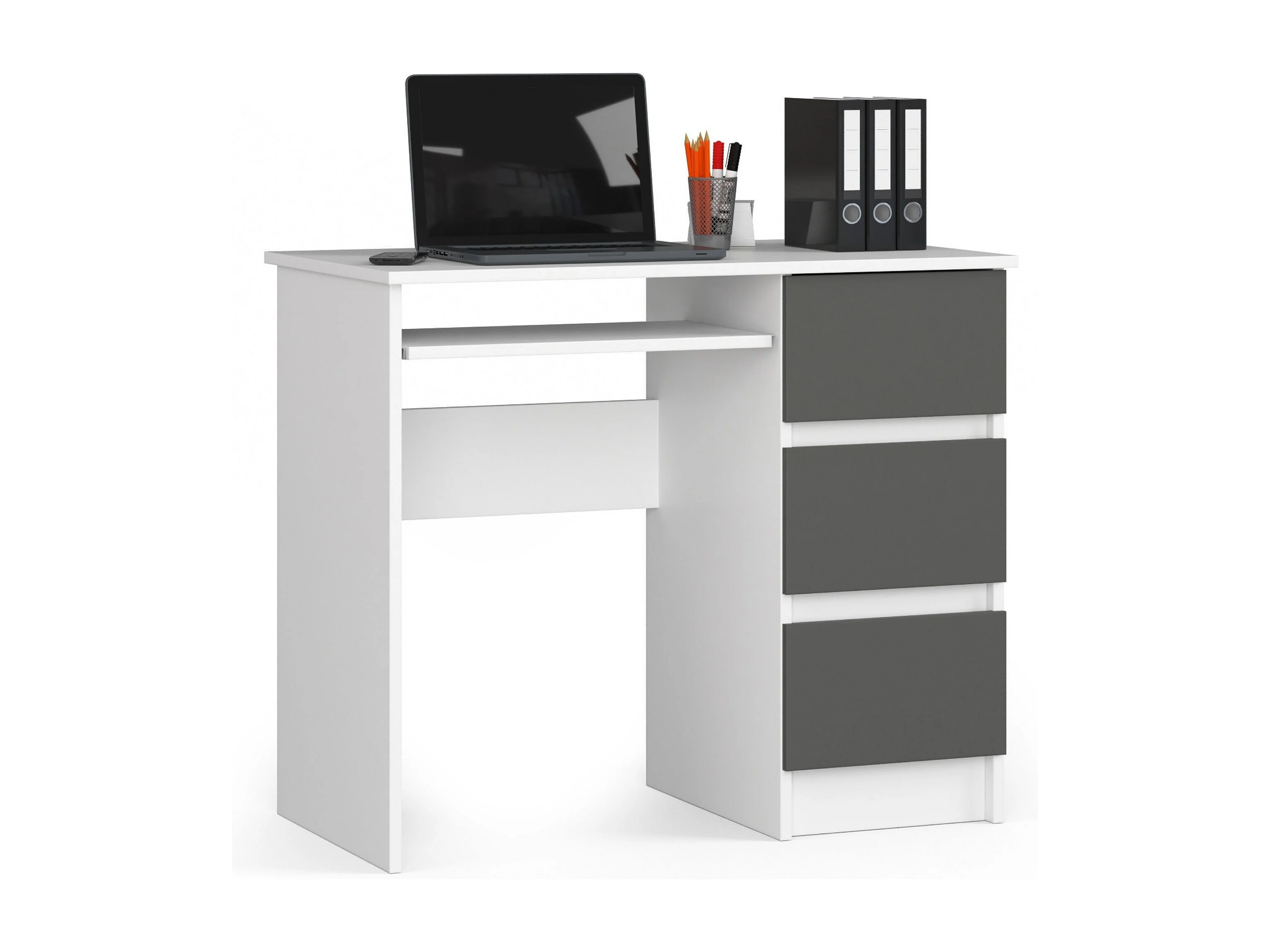 Rechts Computerdek 90cm met Witte en Grafietgrijze Afwerking - 3 Lades, Pro Design met Uitschuifbaar Toetsenbordplateau, Zelfmontage