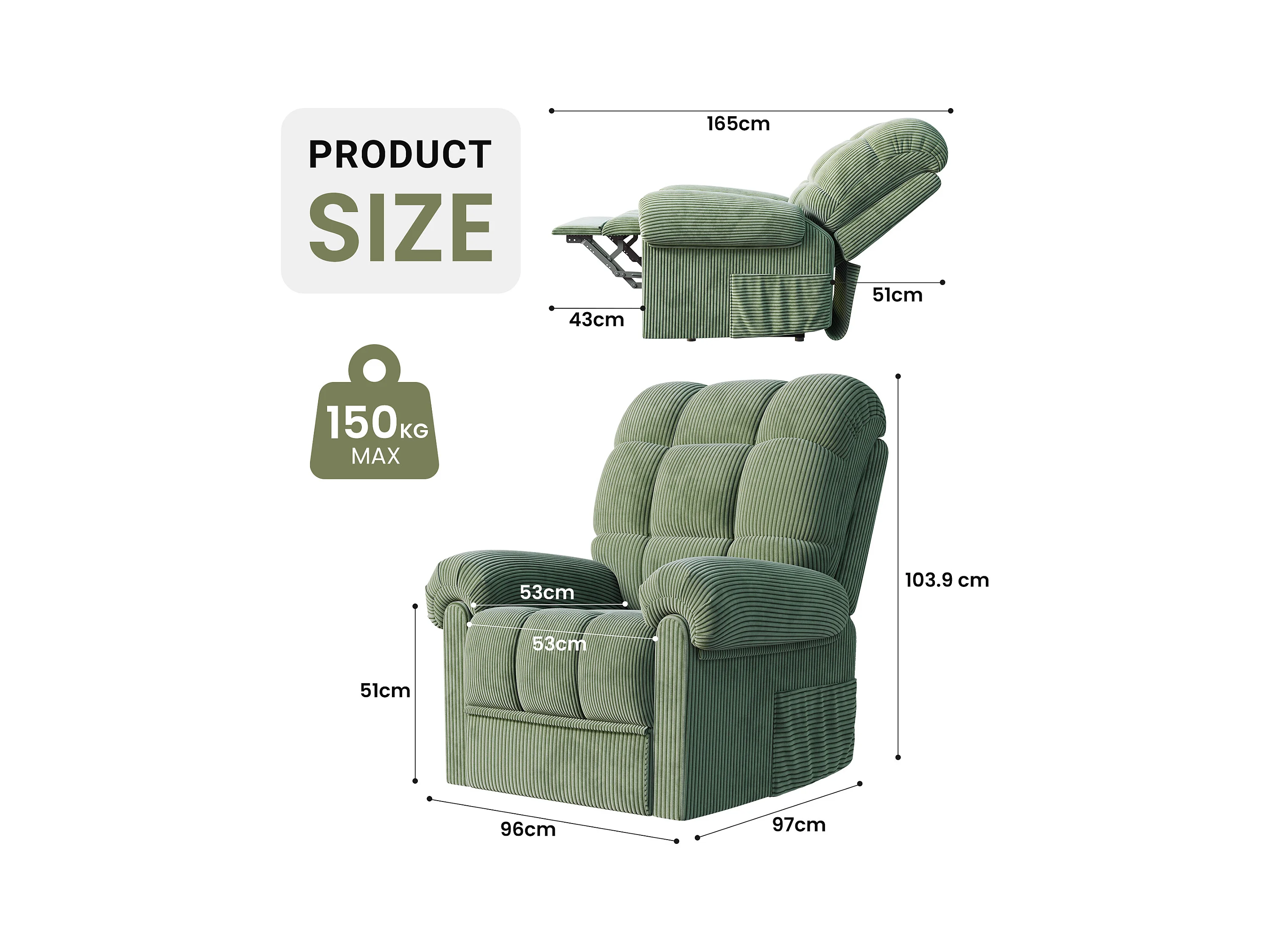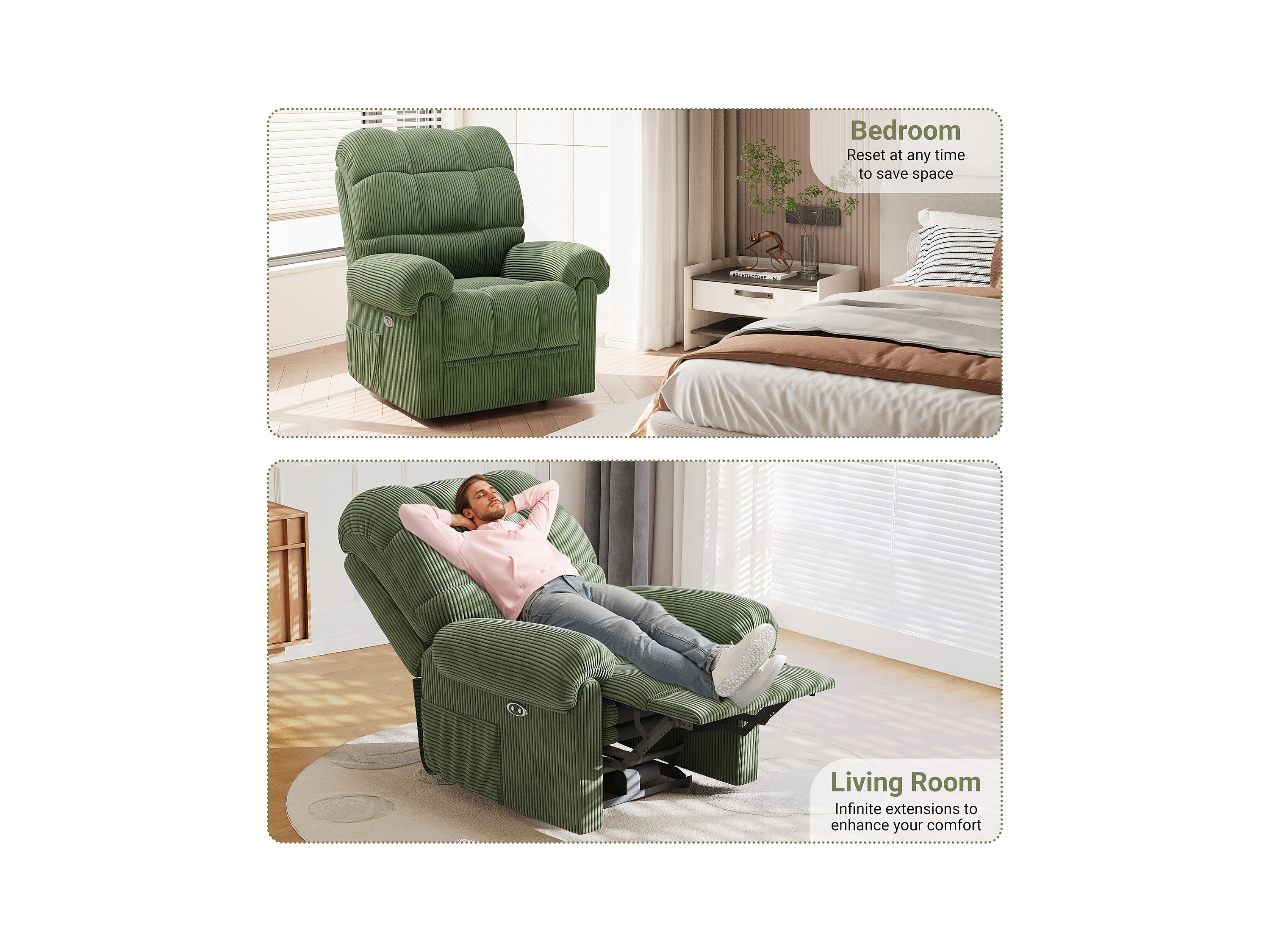 Relaxfauteuil Elektrische corduroy fauteuil, verstelbare vrijetijdsfauteuil met USB, verstelbare rugleuning, antistatisch met voetsteun - 96x97x104cm groen