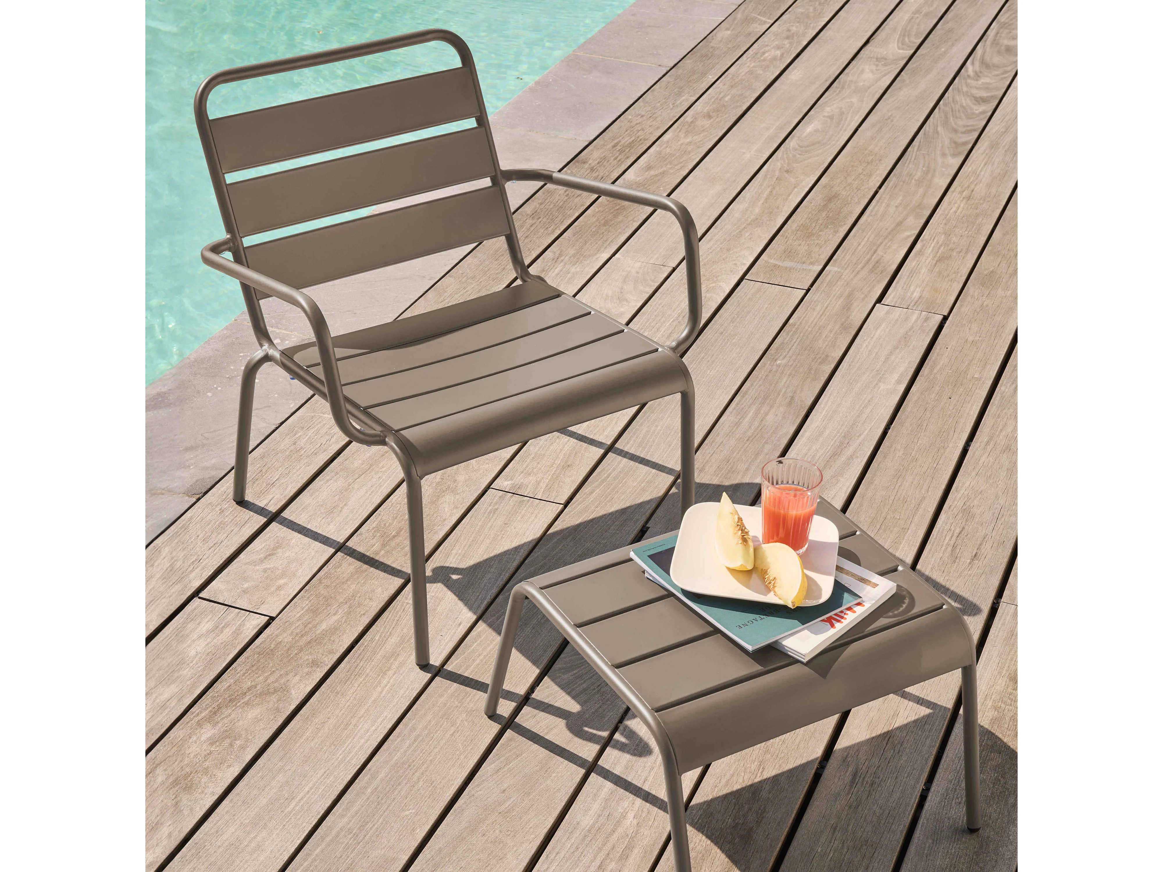Relaxfauteuil en voetenbankje van taupekleurig metaal