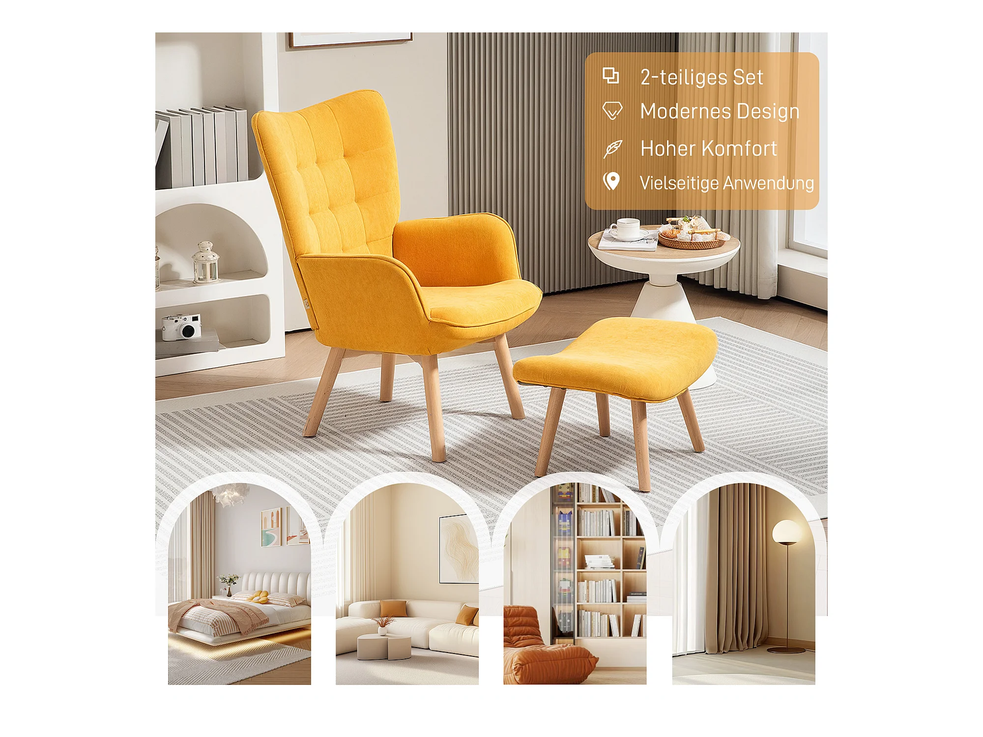 Relaxfauteuil met voetenbankje, fluweelachtige stof, hout, geel (72x80x101 cm)