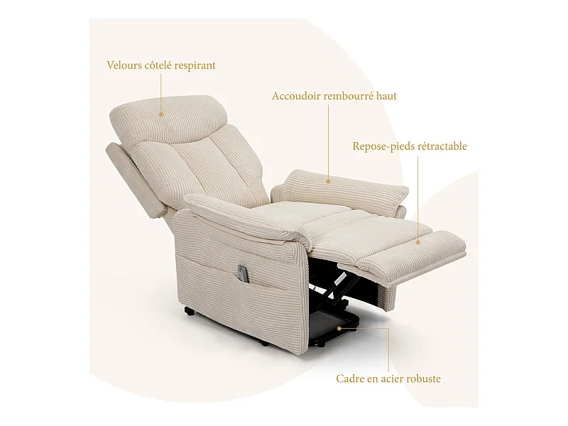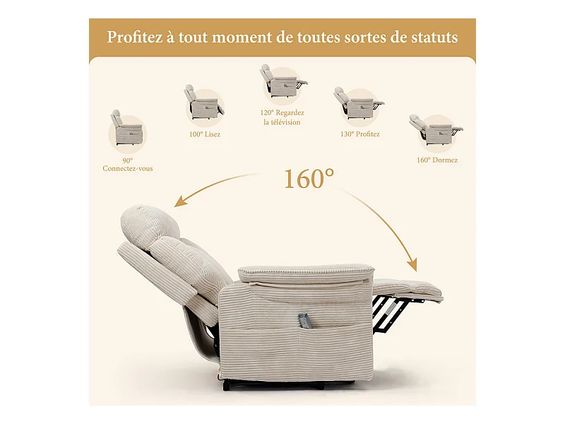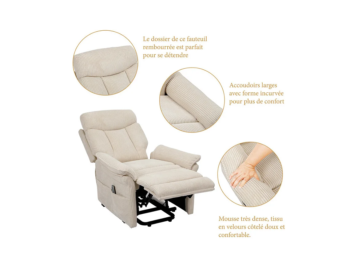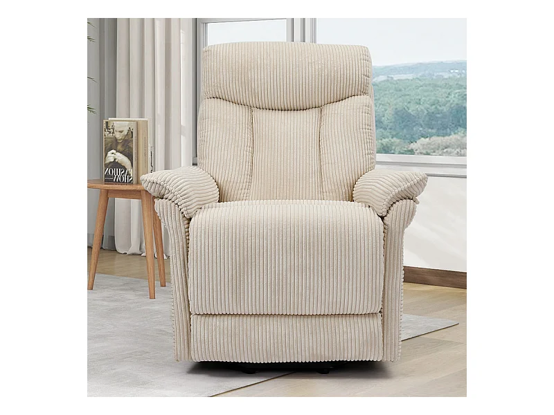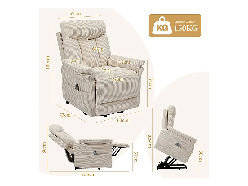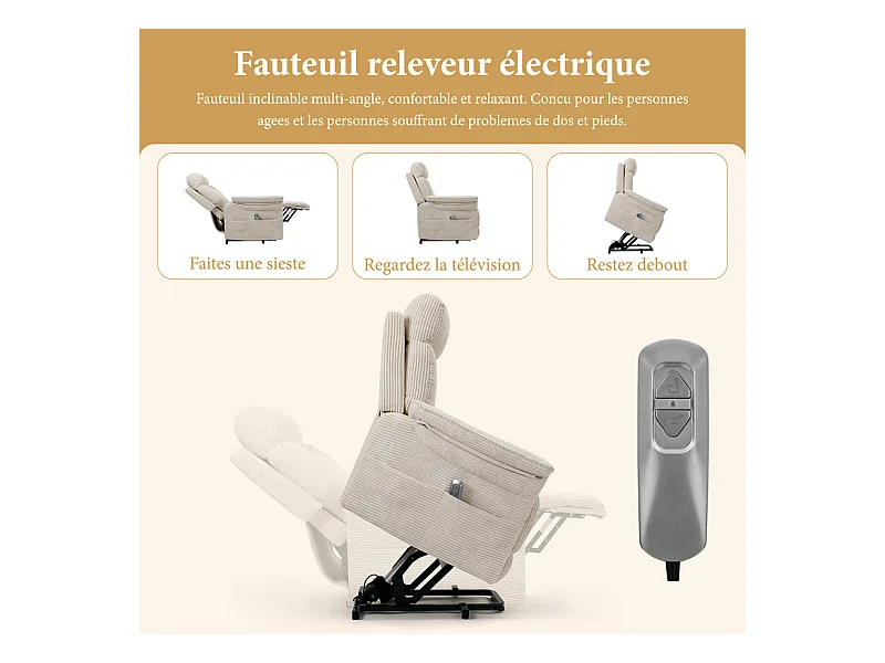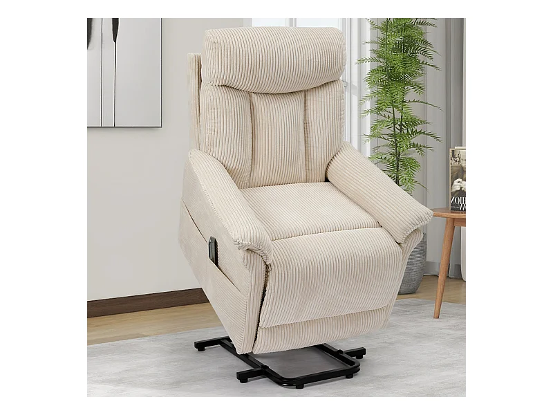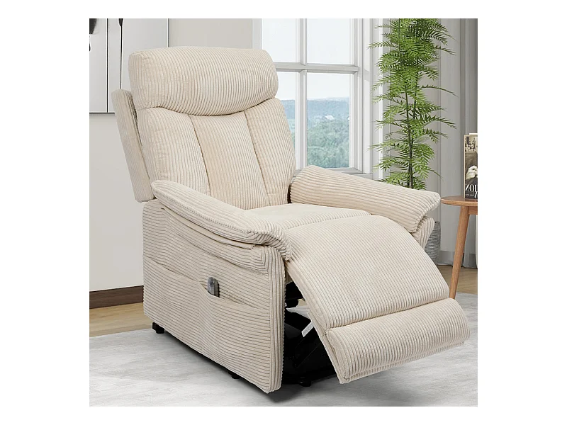 Relaxfauteuil van ribcord met elektrische liftfunctie, afstandsbediening, zijzak, verstelbaar 90°-160°, Beige