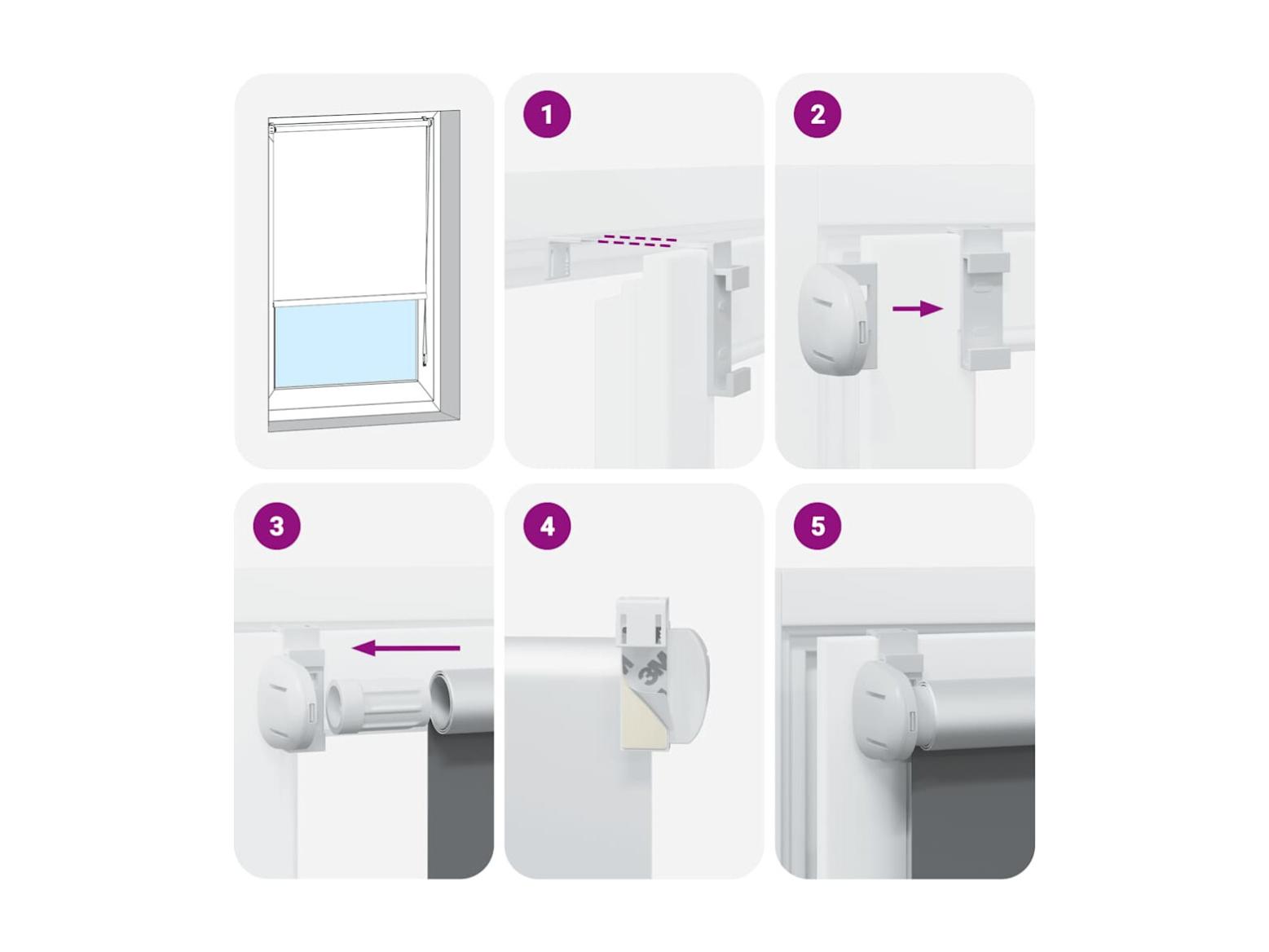 • Meerdere montagemethoden: U kunt het rolgordijn aan de muur of het raam bevestigen met schroeven of zonder te boren met behulp van klembeugels, afhankelijk van uw behoeften. Klembeugels voor kozijnsponningdiktes tussen 1,6 en 2,5 cm.