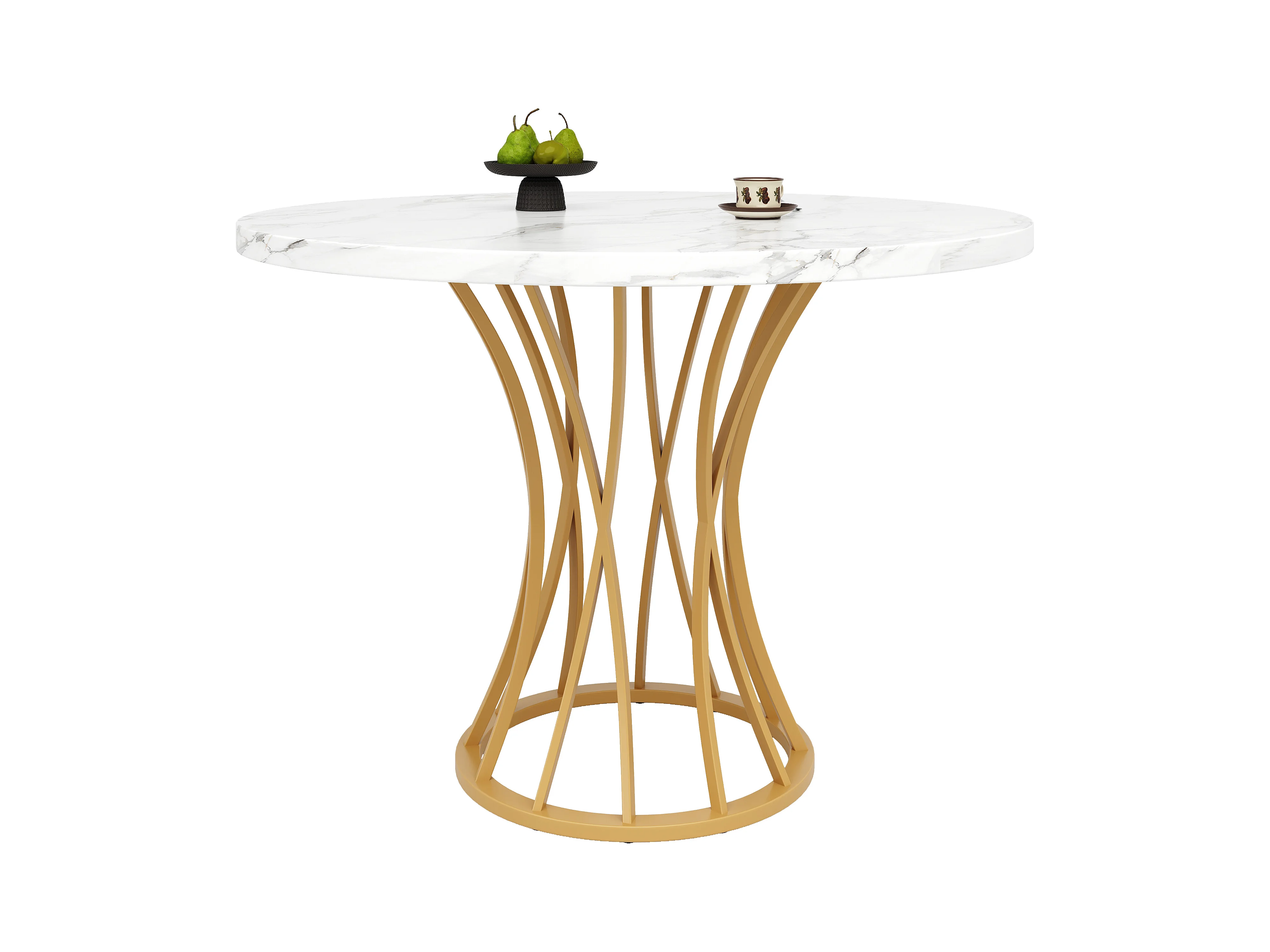 Ronde eettafel voor 4/6 personen - D 100 x H 76 cm - Blad van gemarmerd MDF en poten van goudkleurig metaal - Wit + goud