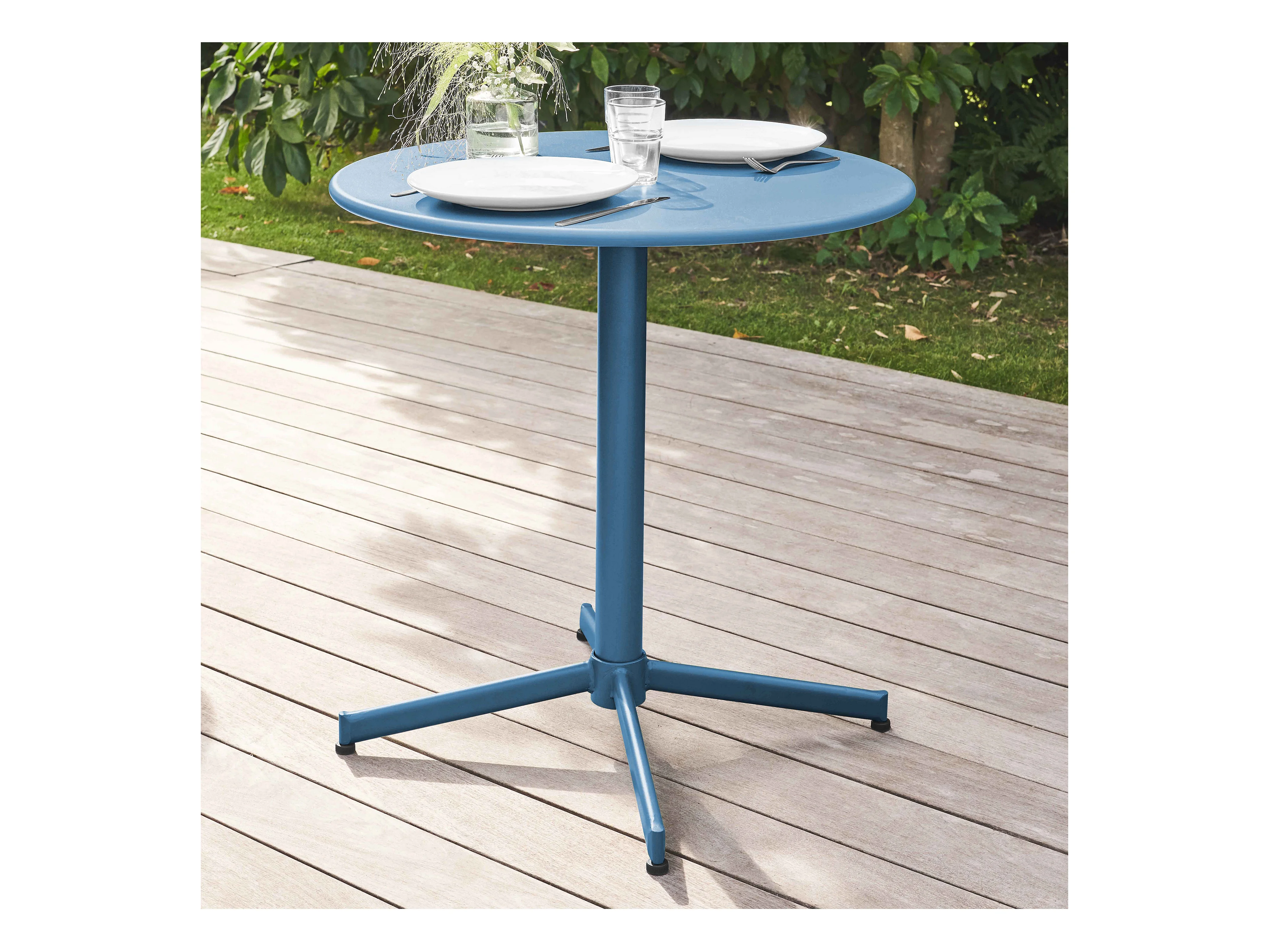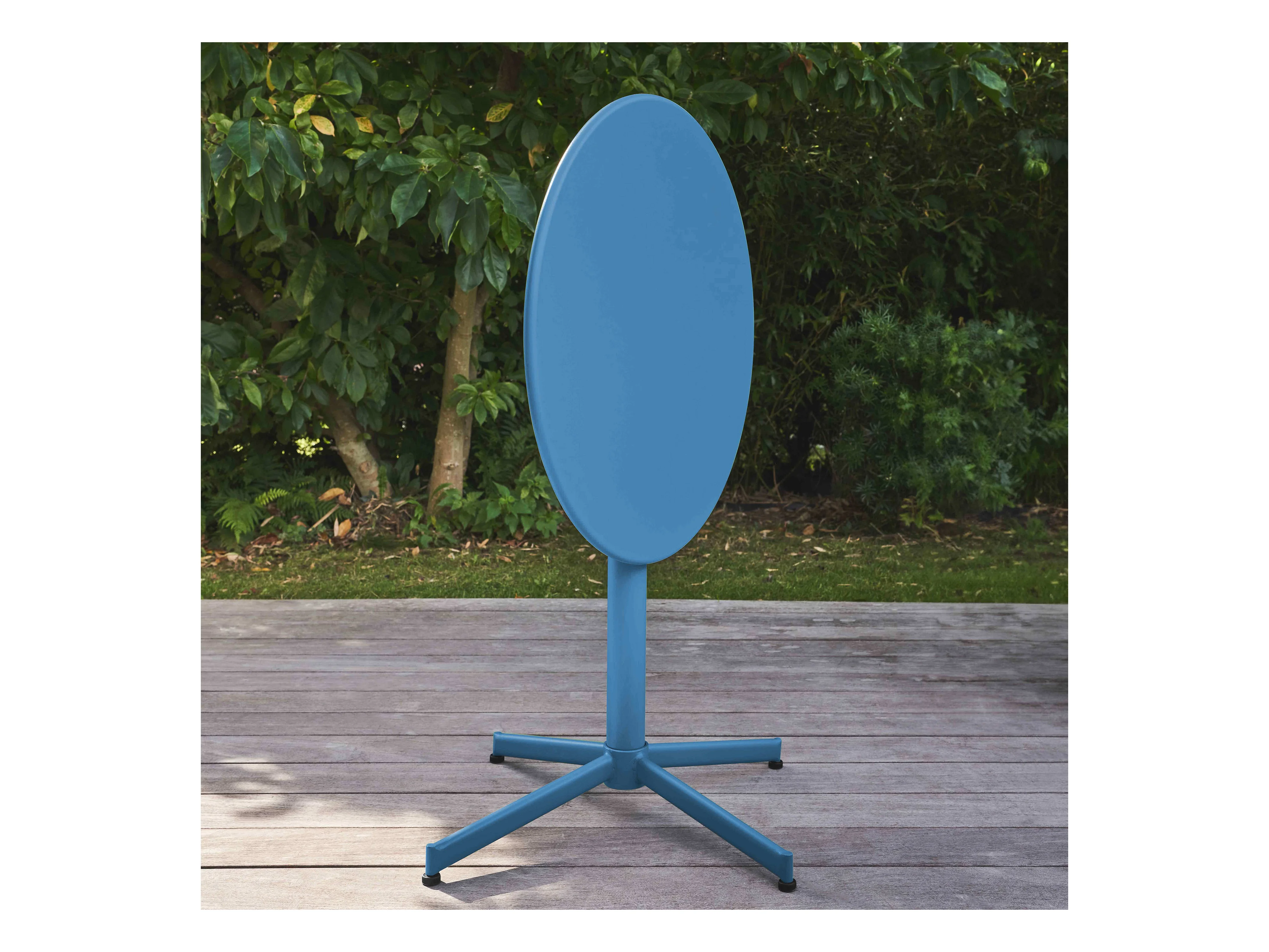Ronde kanteltafel voor in de tuin, van blauw pacifisch staal