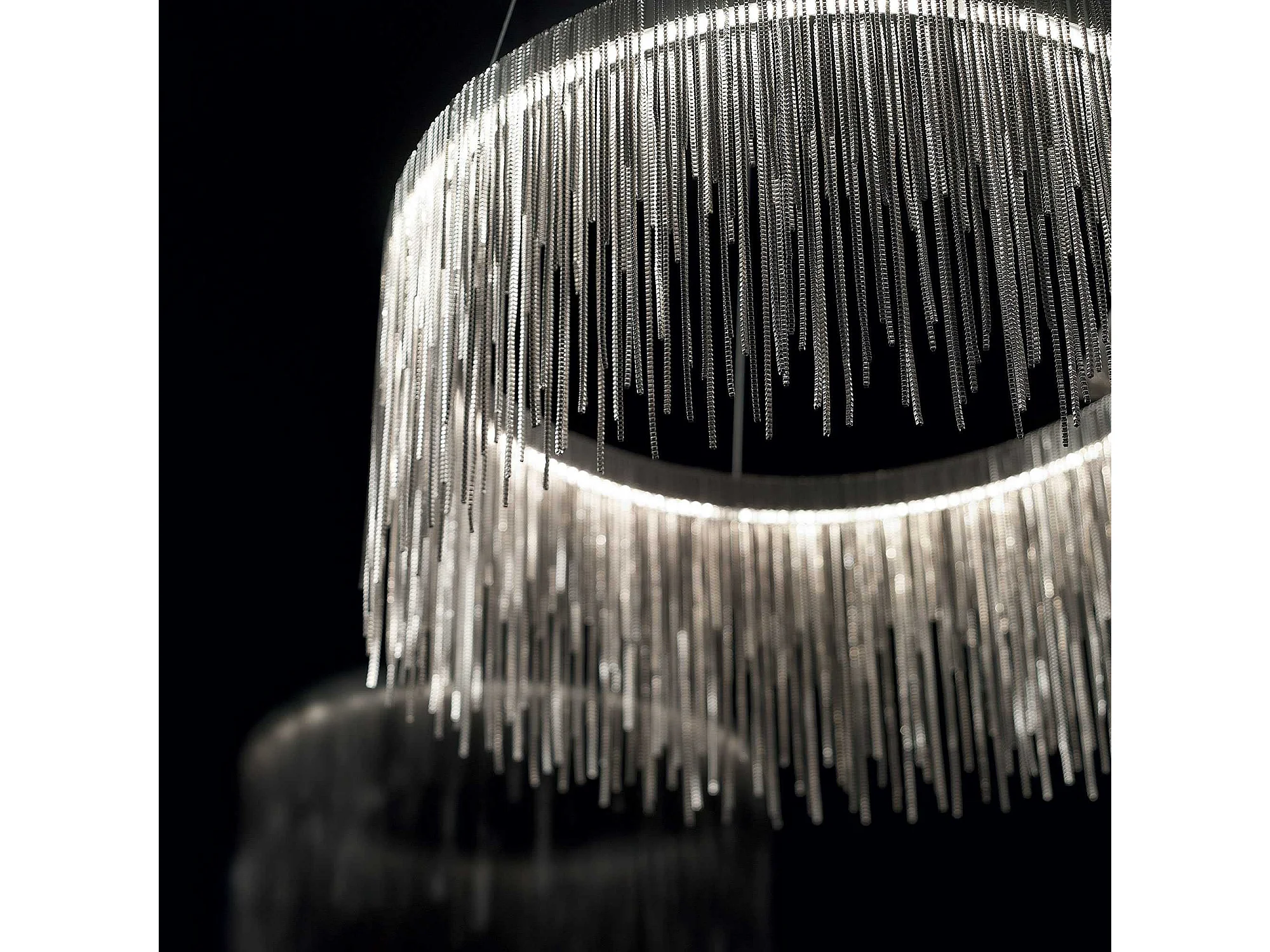 Ronde kroonluchter van verchroomd metaal met metalen kettingen en LED-licht