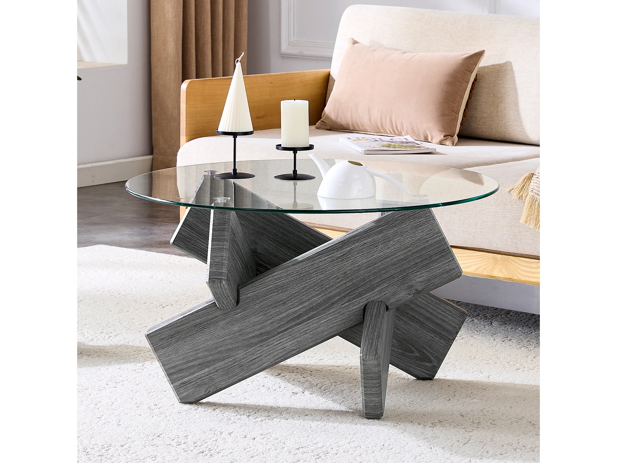 Ronde salontafel met kruisvormige poten - Glazen blad - Grijs hout