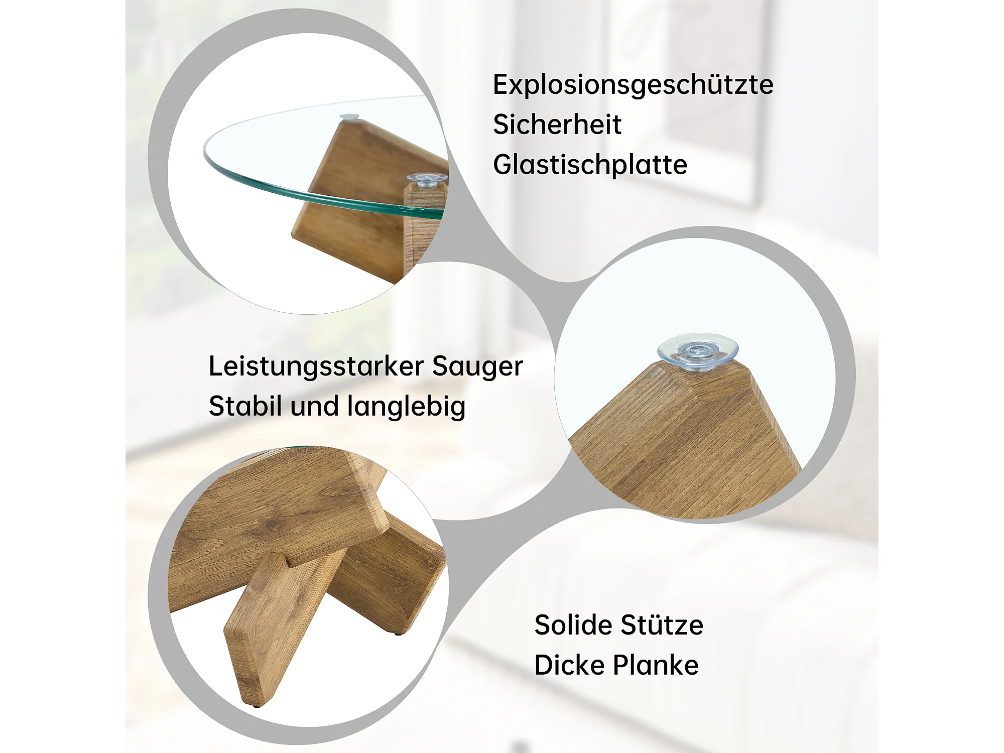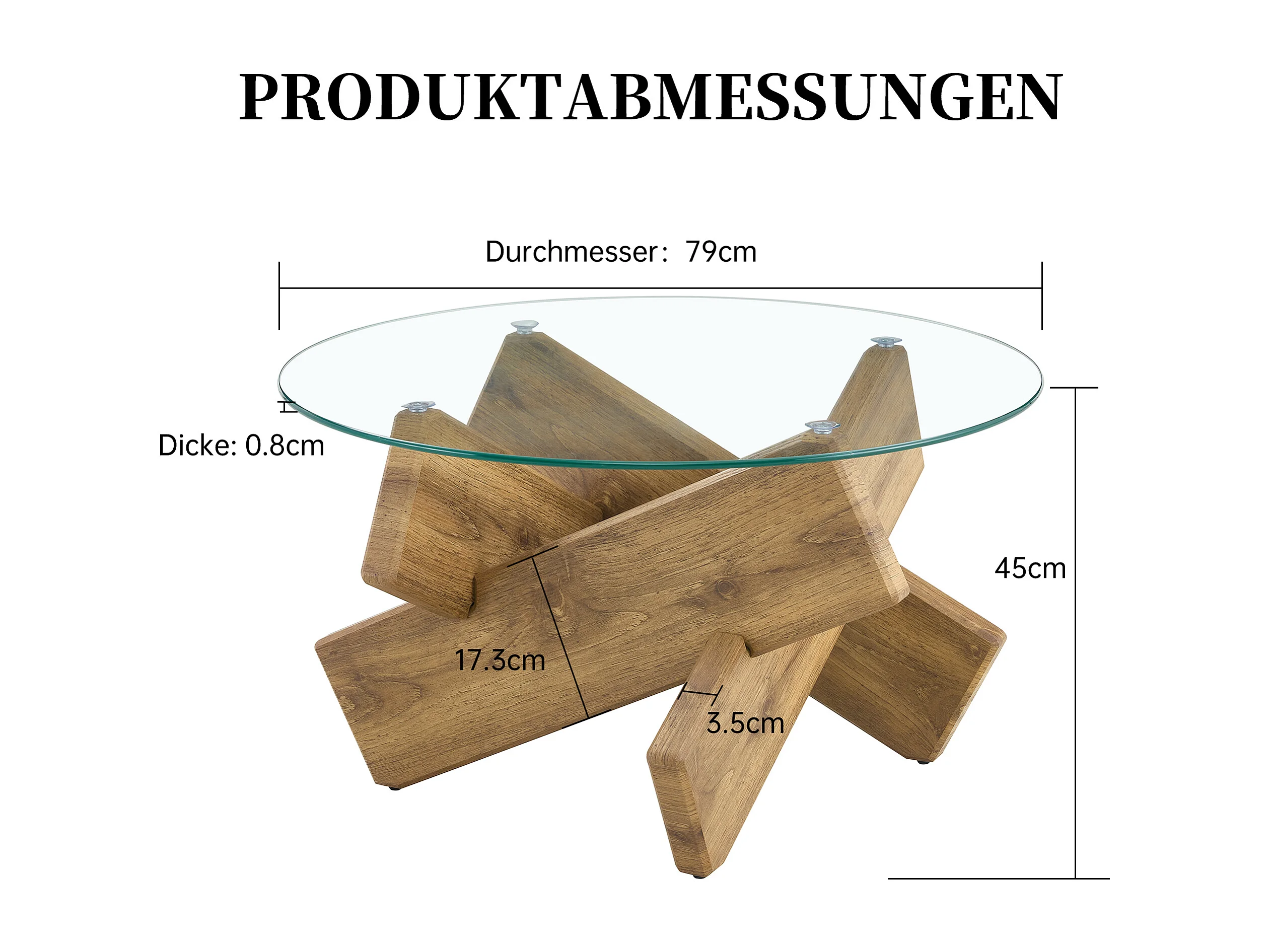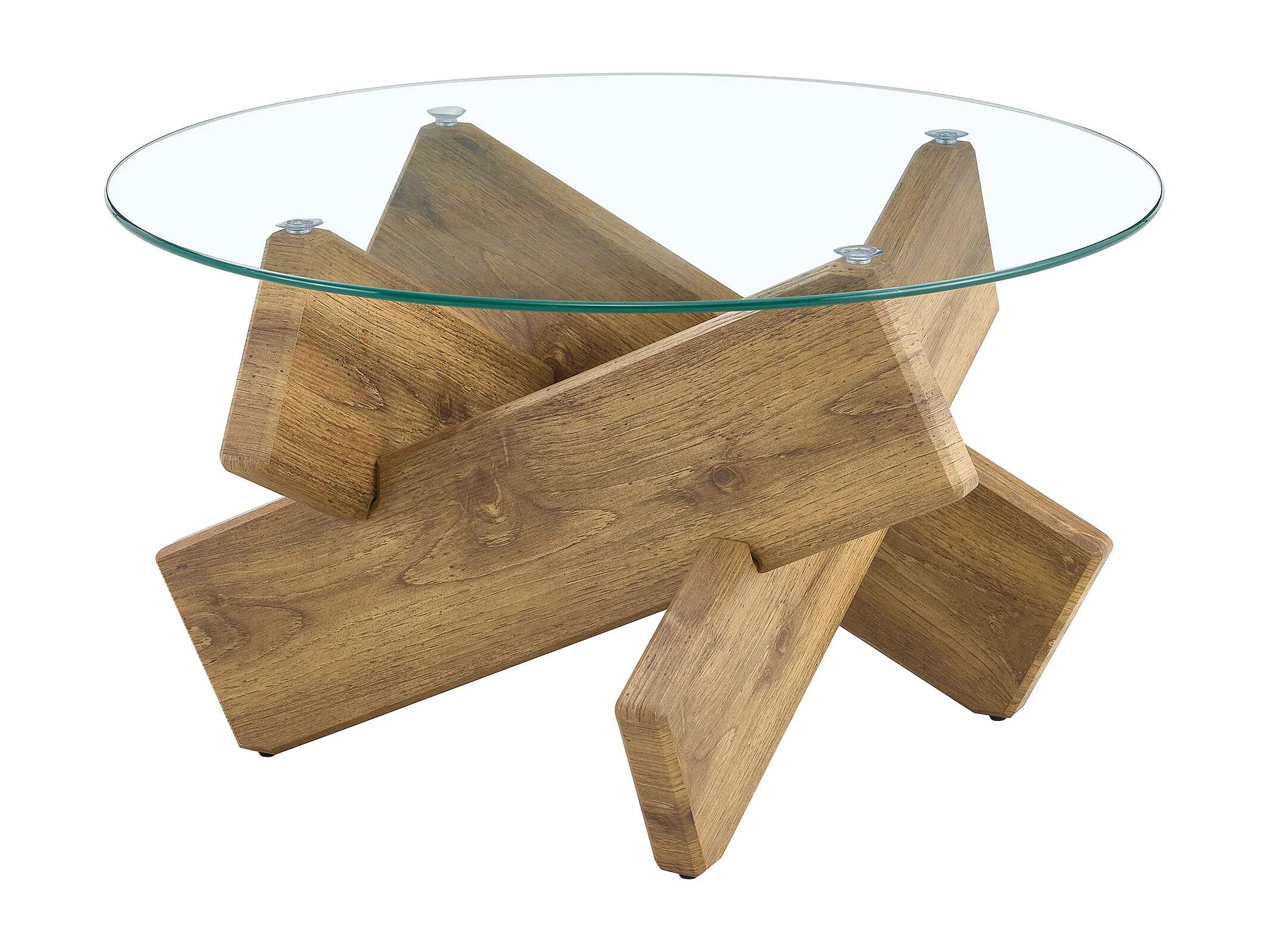Ronde salontafel met kruisvormige poten - Glazen blad - Natuurlijk hout