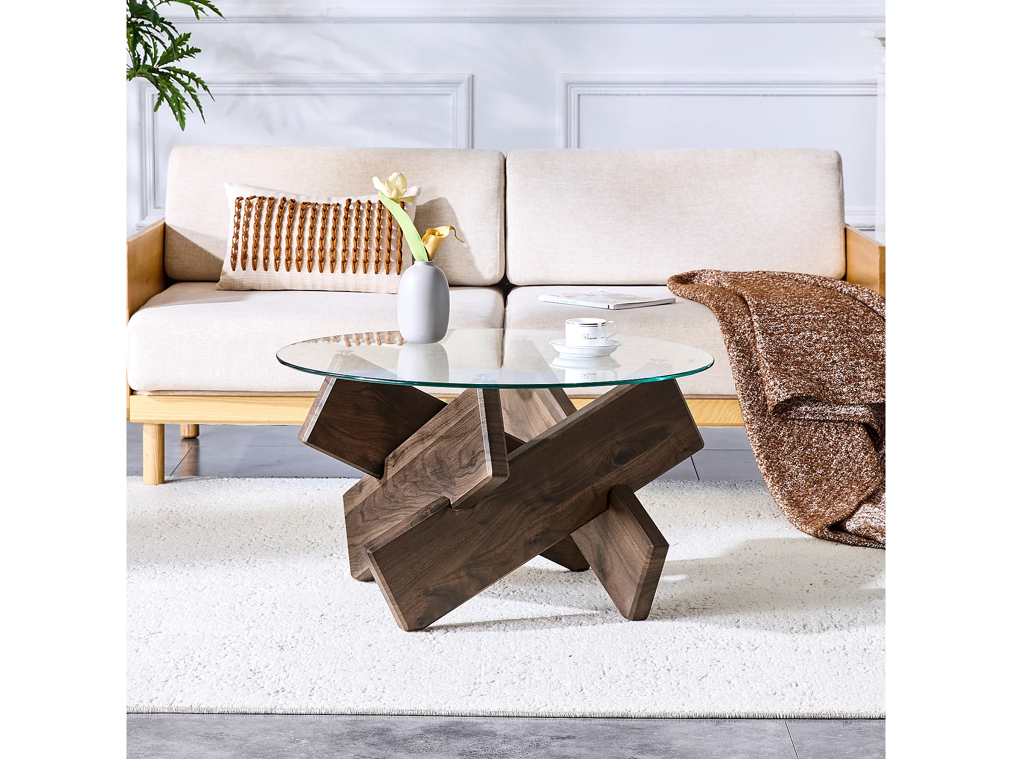 Ronde salontafel met poten van notenhoutnerf - Glazen blad