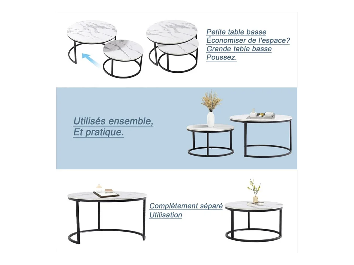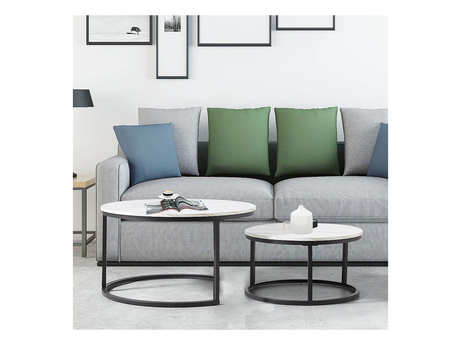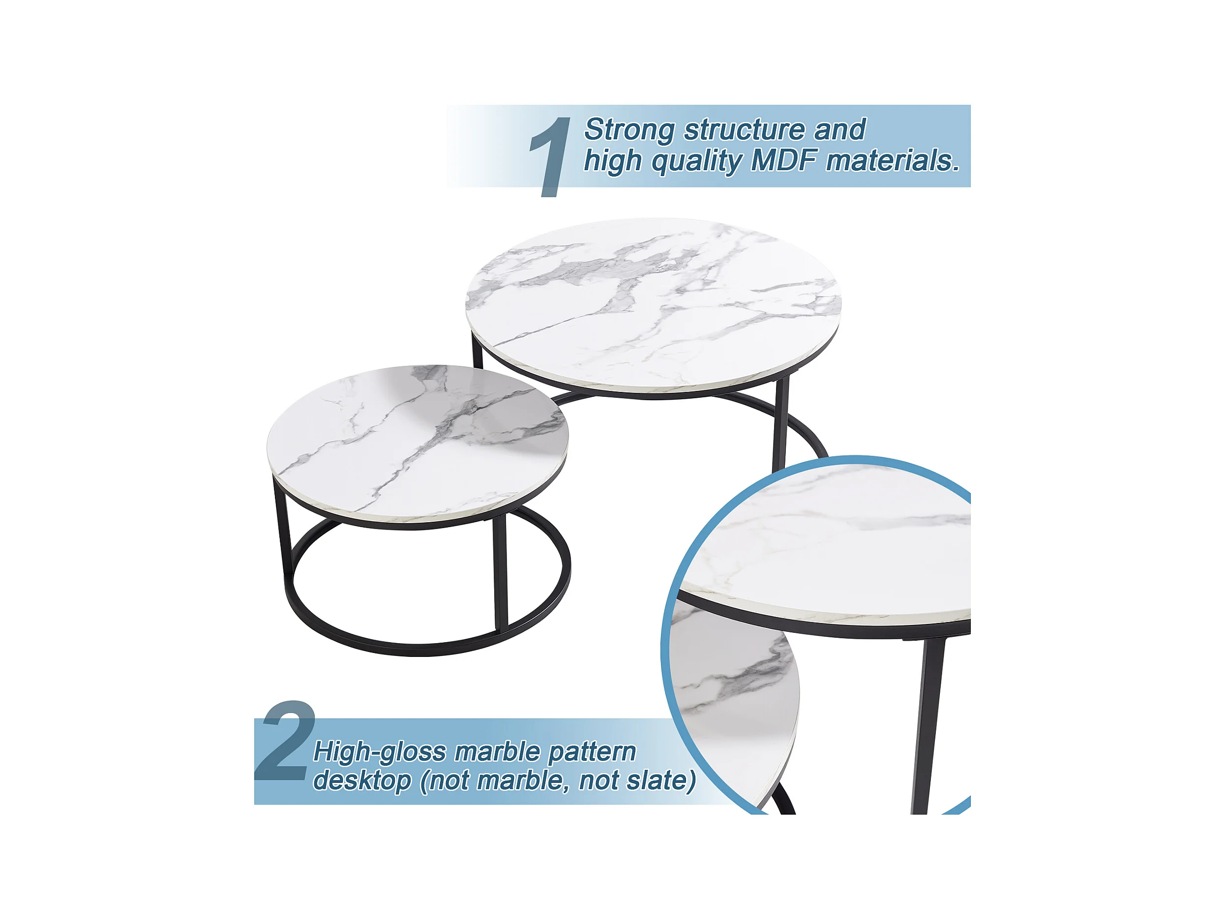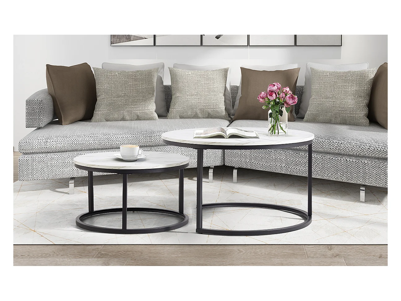 Ronde salontafel, set van 2, witte salontafel, zwart metalen frame, marmerfineer