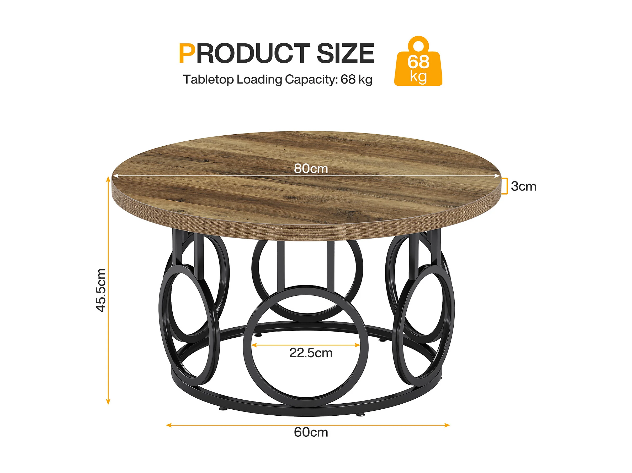 Ronde salontafel van 80 cm, rustieke ronde salontafel met metalen onderstel, industriële accentmeubels