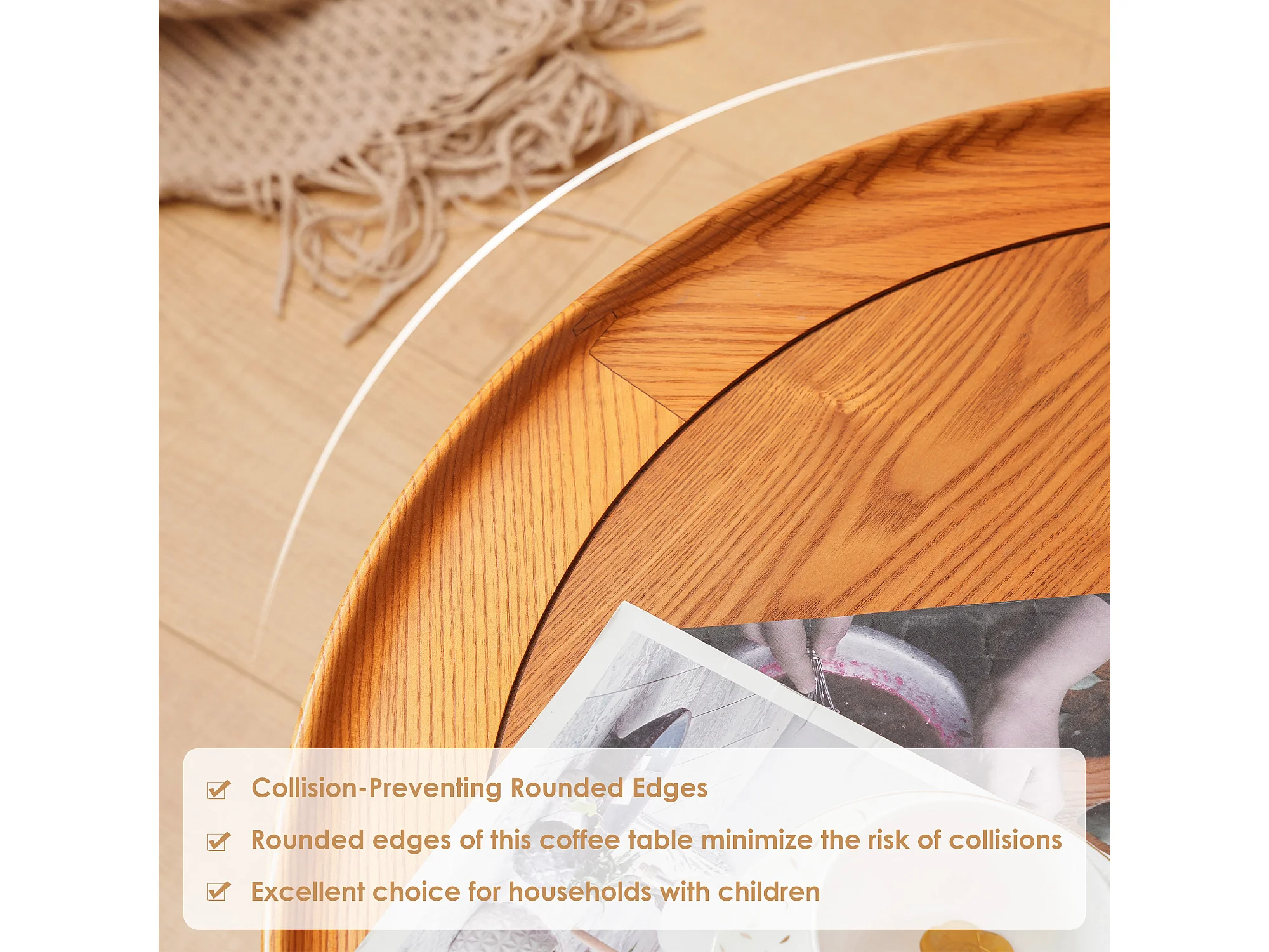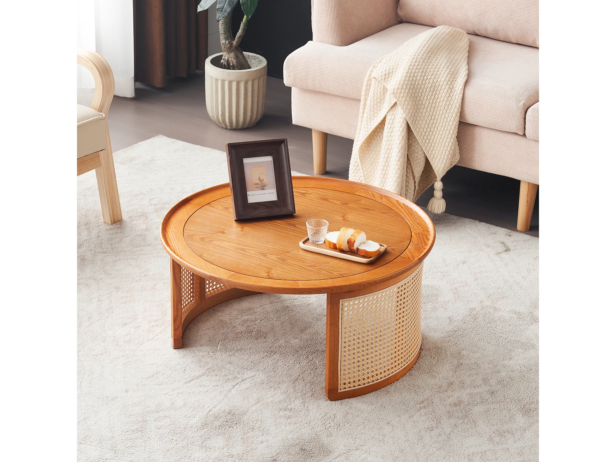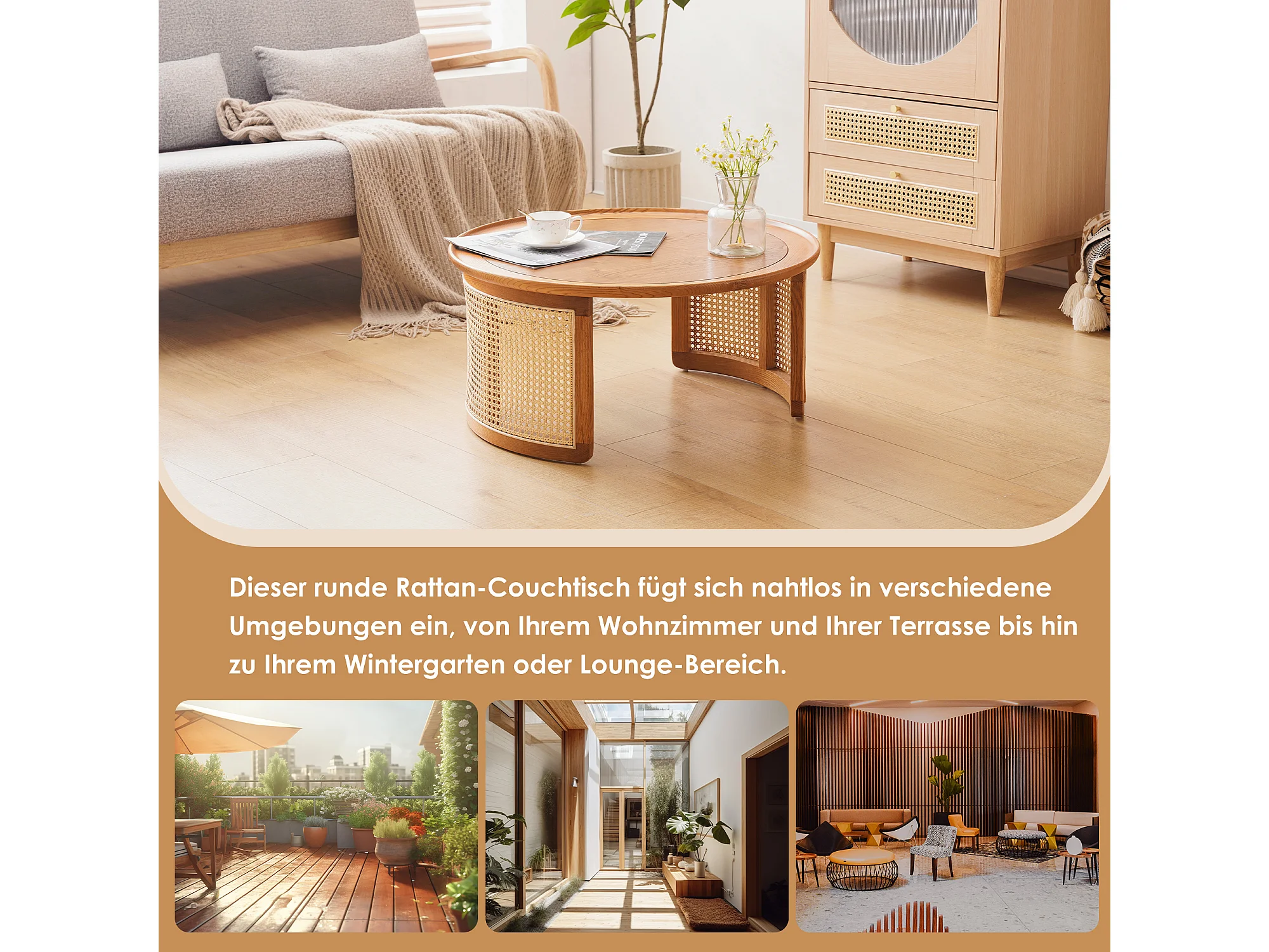Ronde salontafel van massief hout, rotan decor, elegante bijzettafel, eikenkleur, 70 x 70 x 34 cm