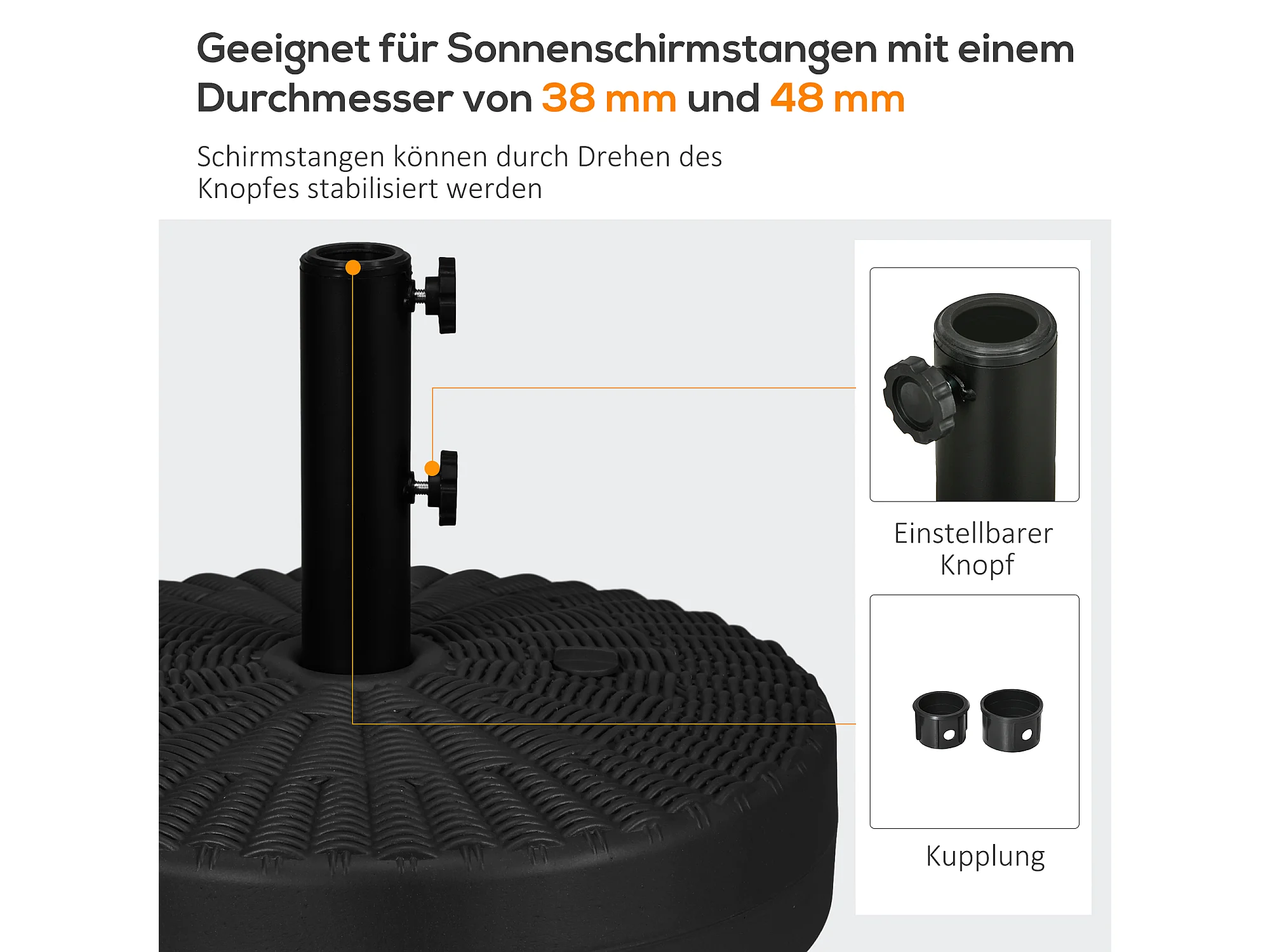 Rotan parasolvoet, steun voor paal Ø38/48mm, HDPE, zwart, draagvermogen tot 29kg (51x51x36 cm)