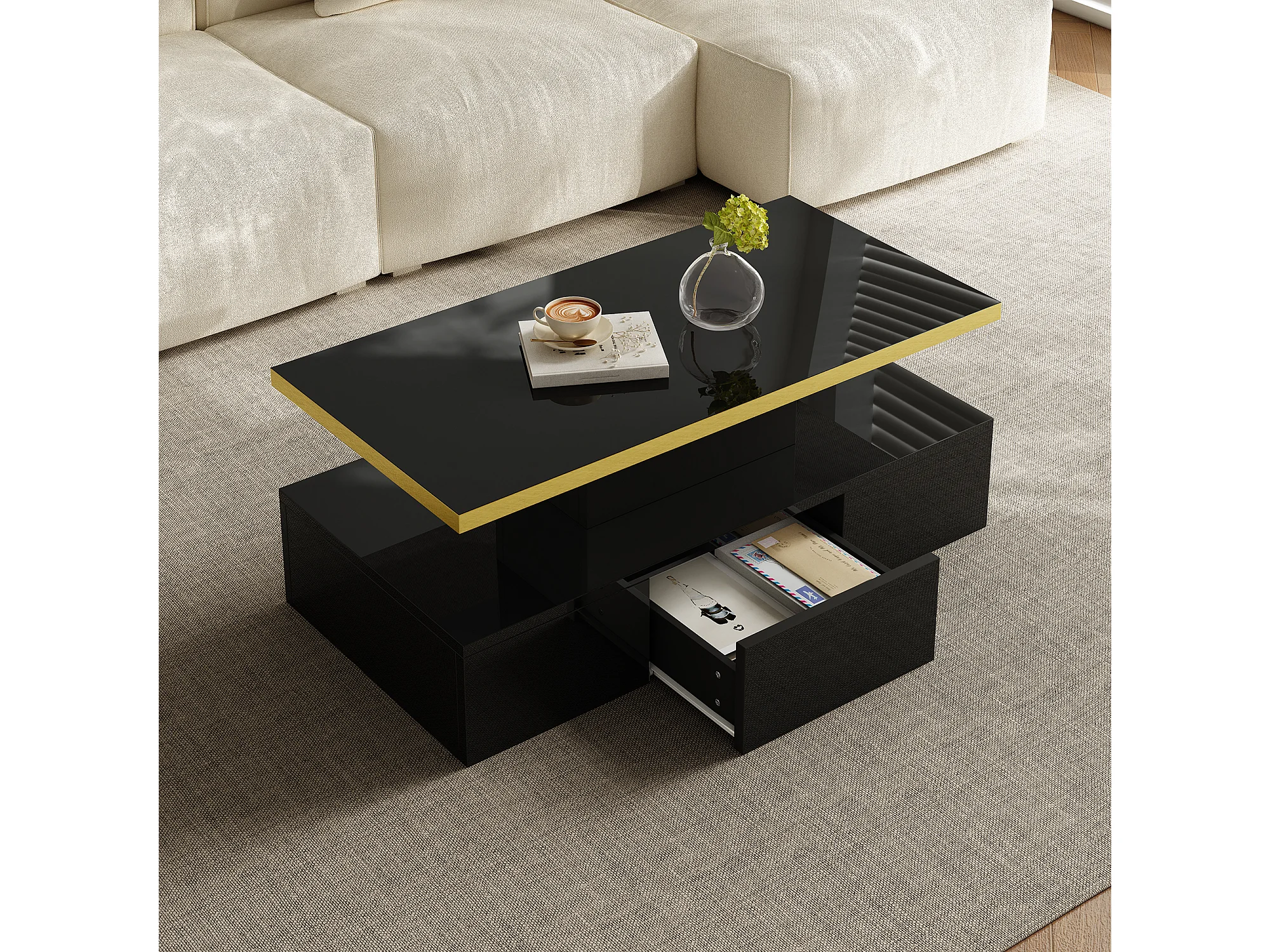 Salontafel 100x50x39 cm, 2 niveaus, ingebouwde lade, glanzende afwerking, spaanplaat, zwart