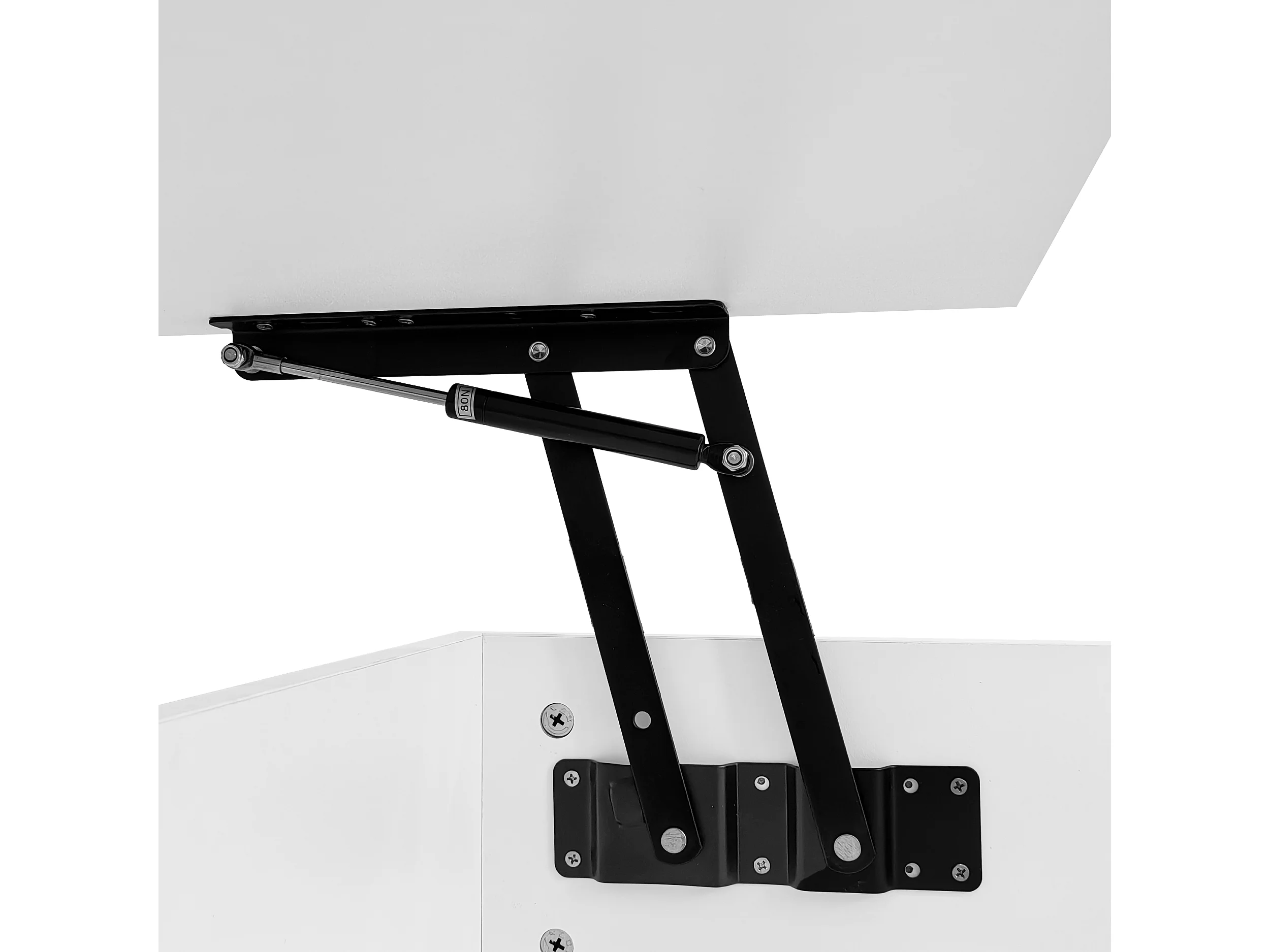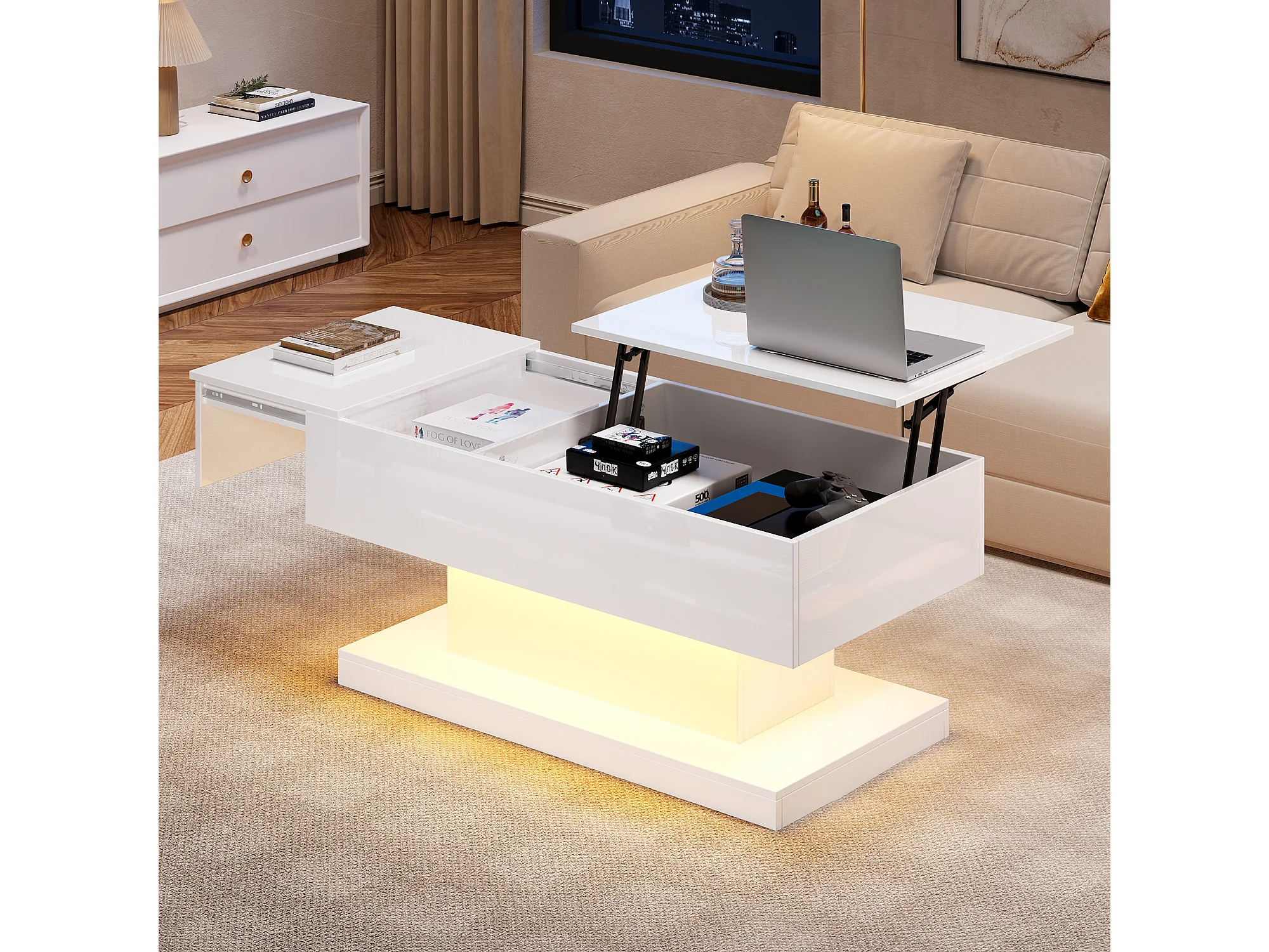 Salontafel met dubbel hefmechanisme en geïntegreerde opbergruimte voor een moderne woonkamer in het wit