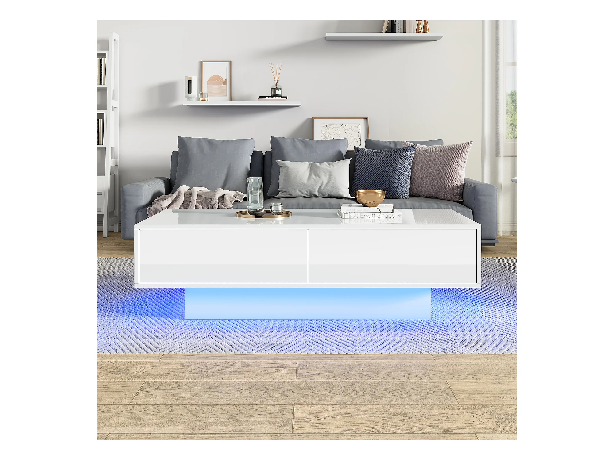 Salontafel 100x50x32cm glanzend met krasbestendig gehard glazen blad LED-verlichting en witte lade