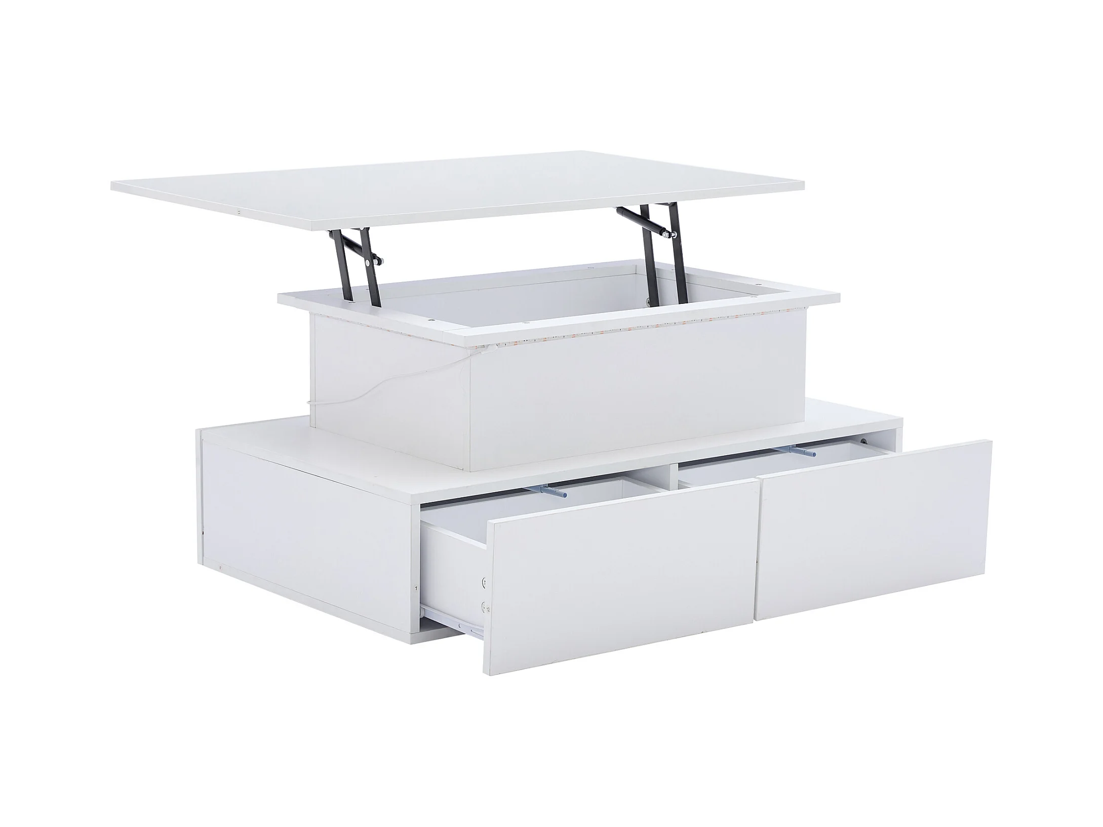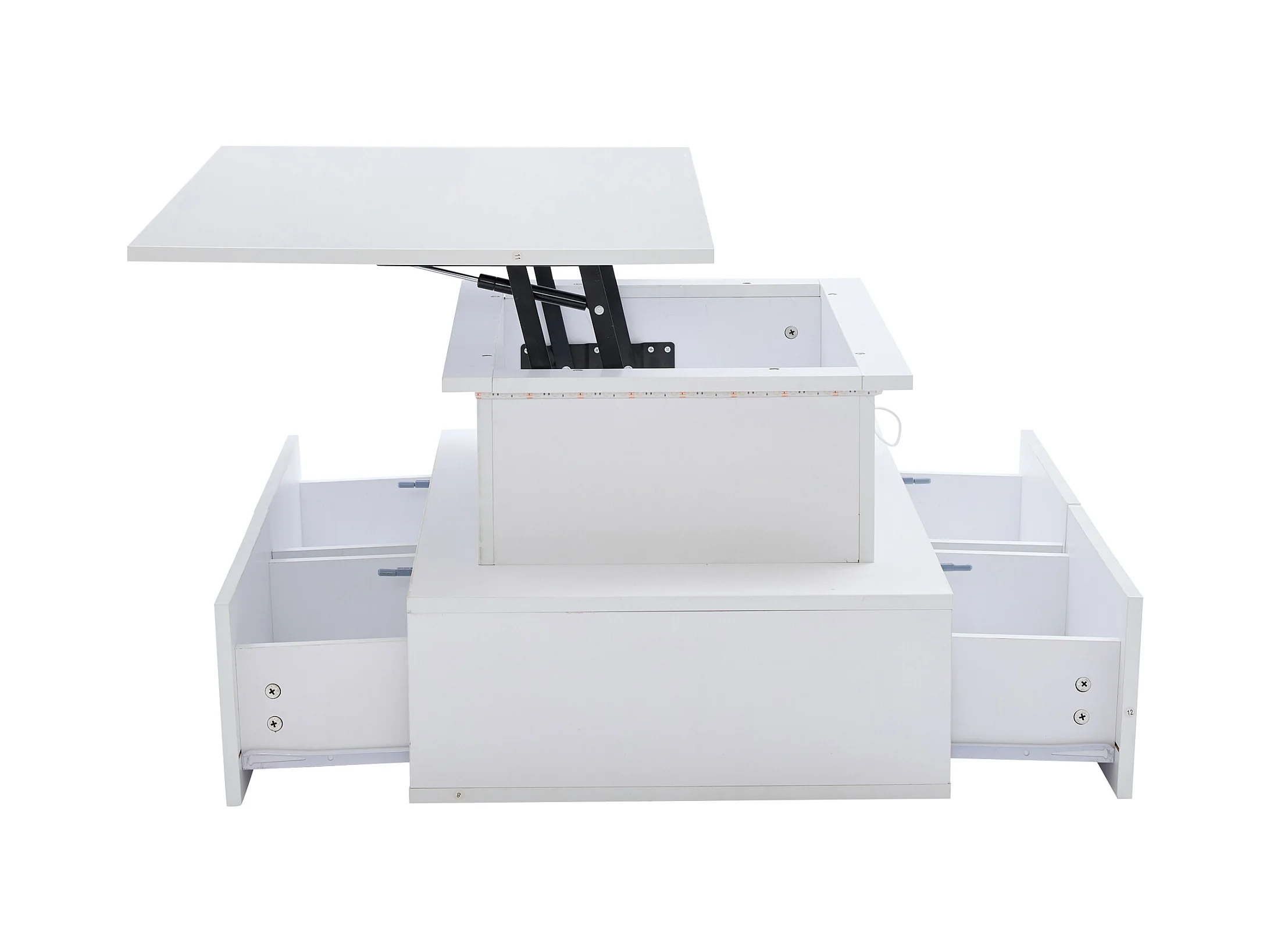 Salontafel met dubbel hefmechanisme en geïntegreerde opbergruimte voor een moderne woonkamer in het wit