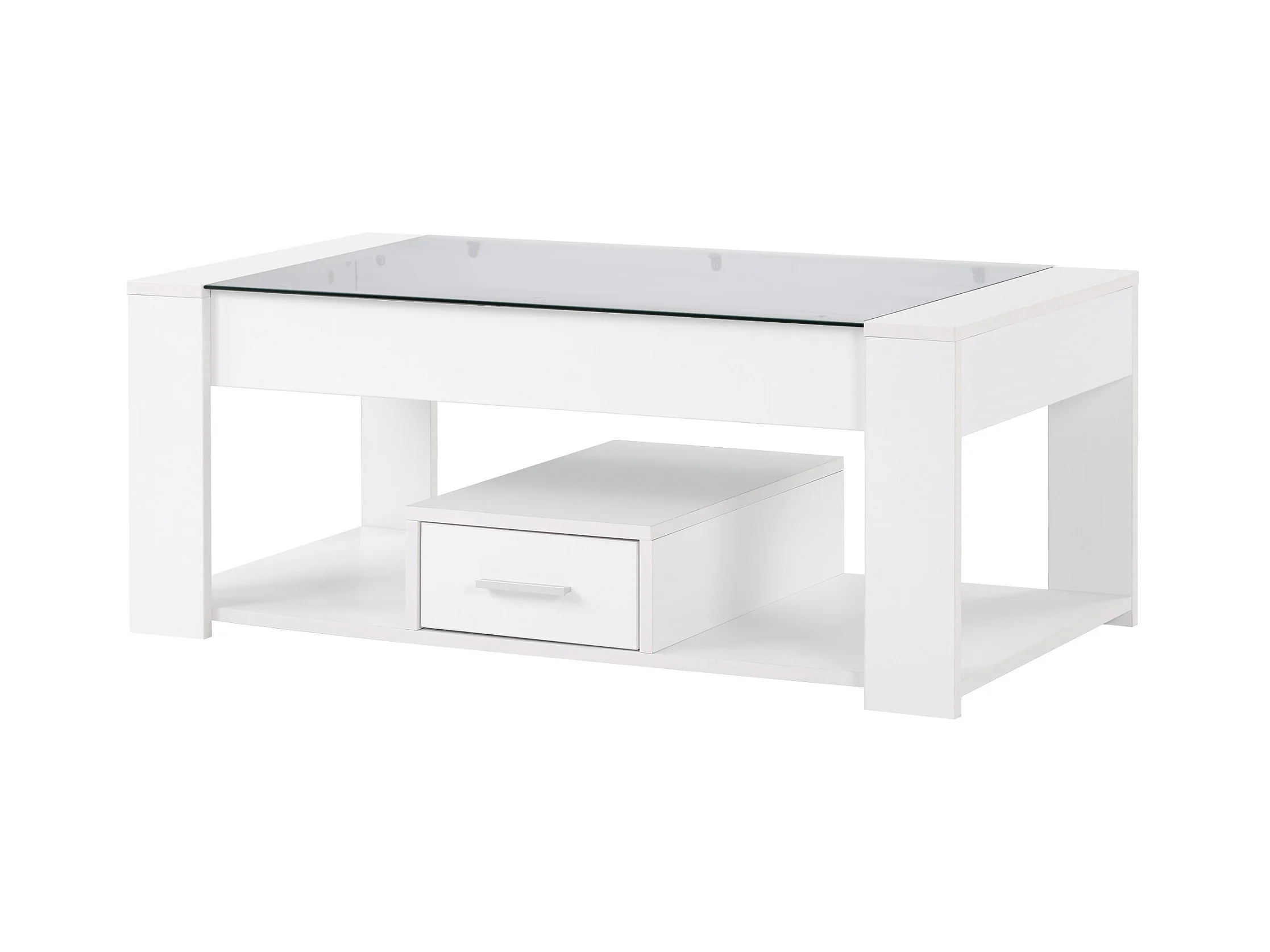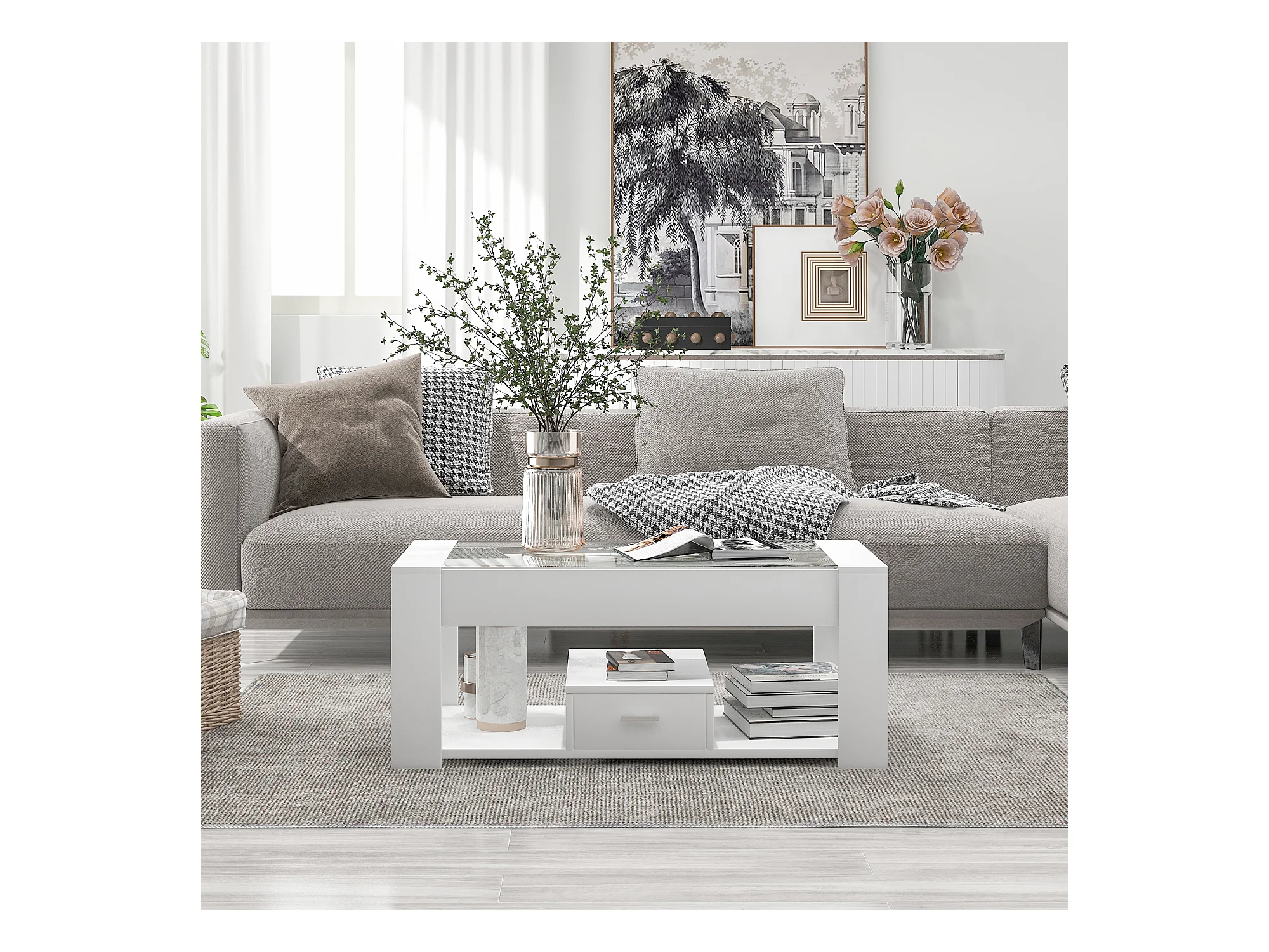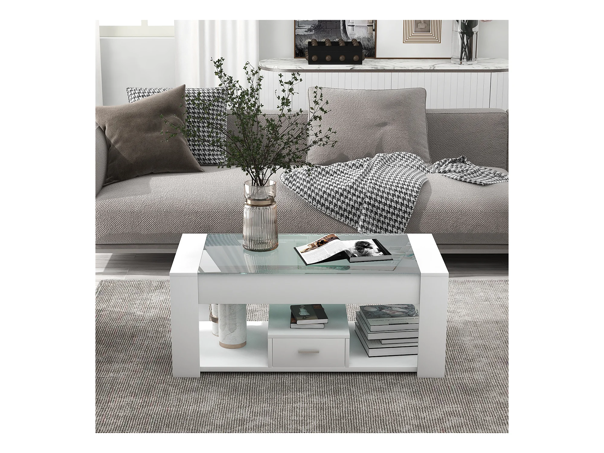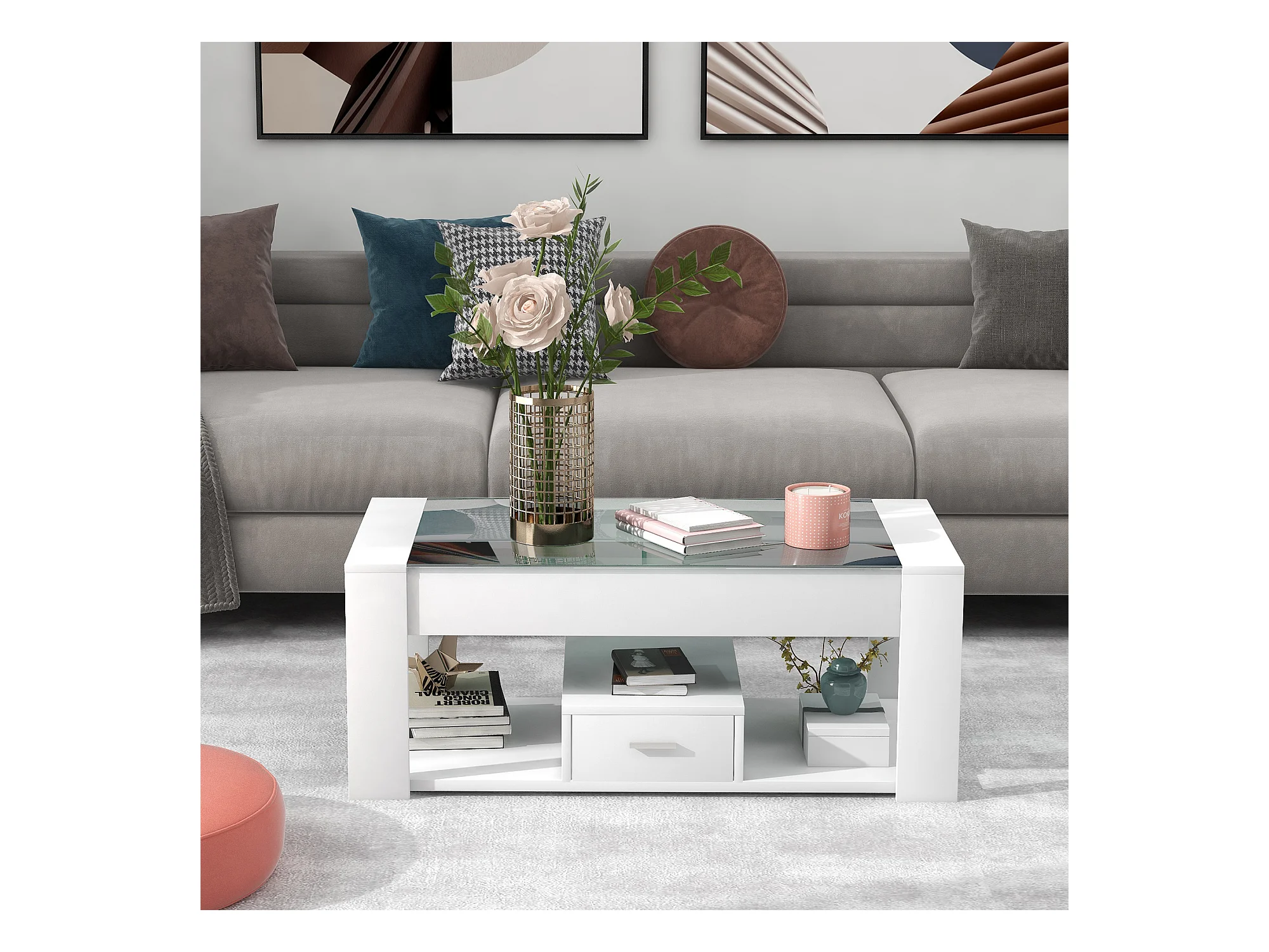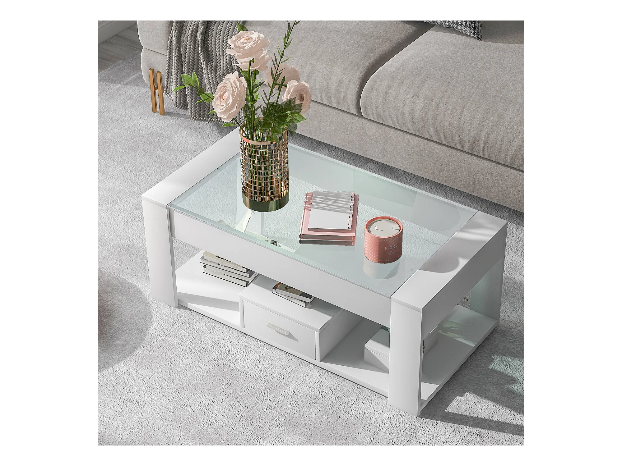Salontafel in de woonkamer met glazen blad, kluisjes en opbergruimte, Houten frame van spaanplaat, Modern, Wit, 100x50x40cm