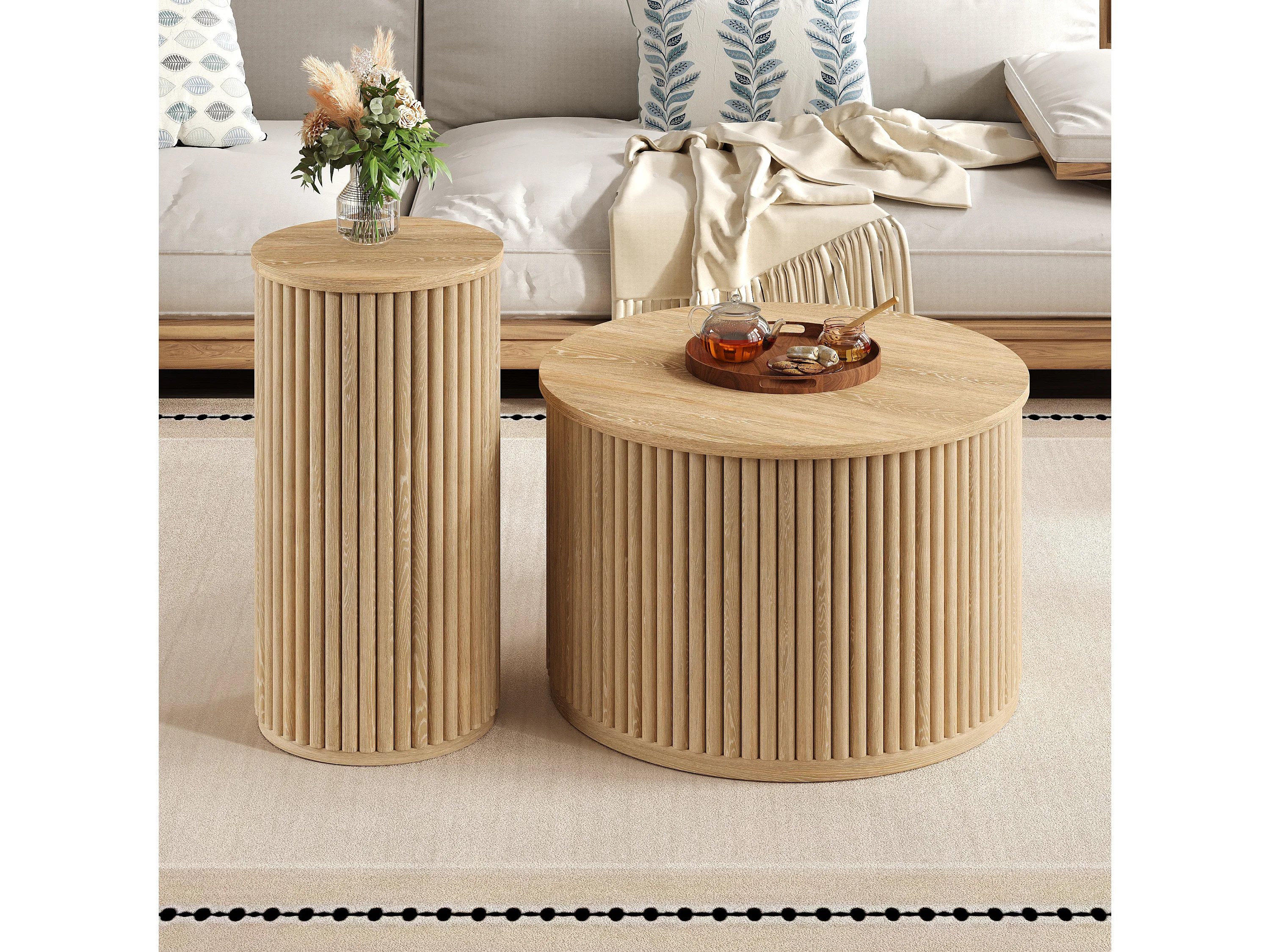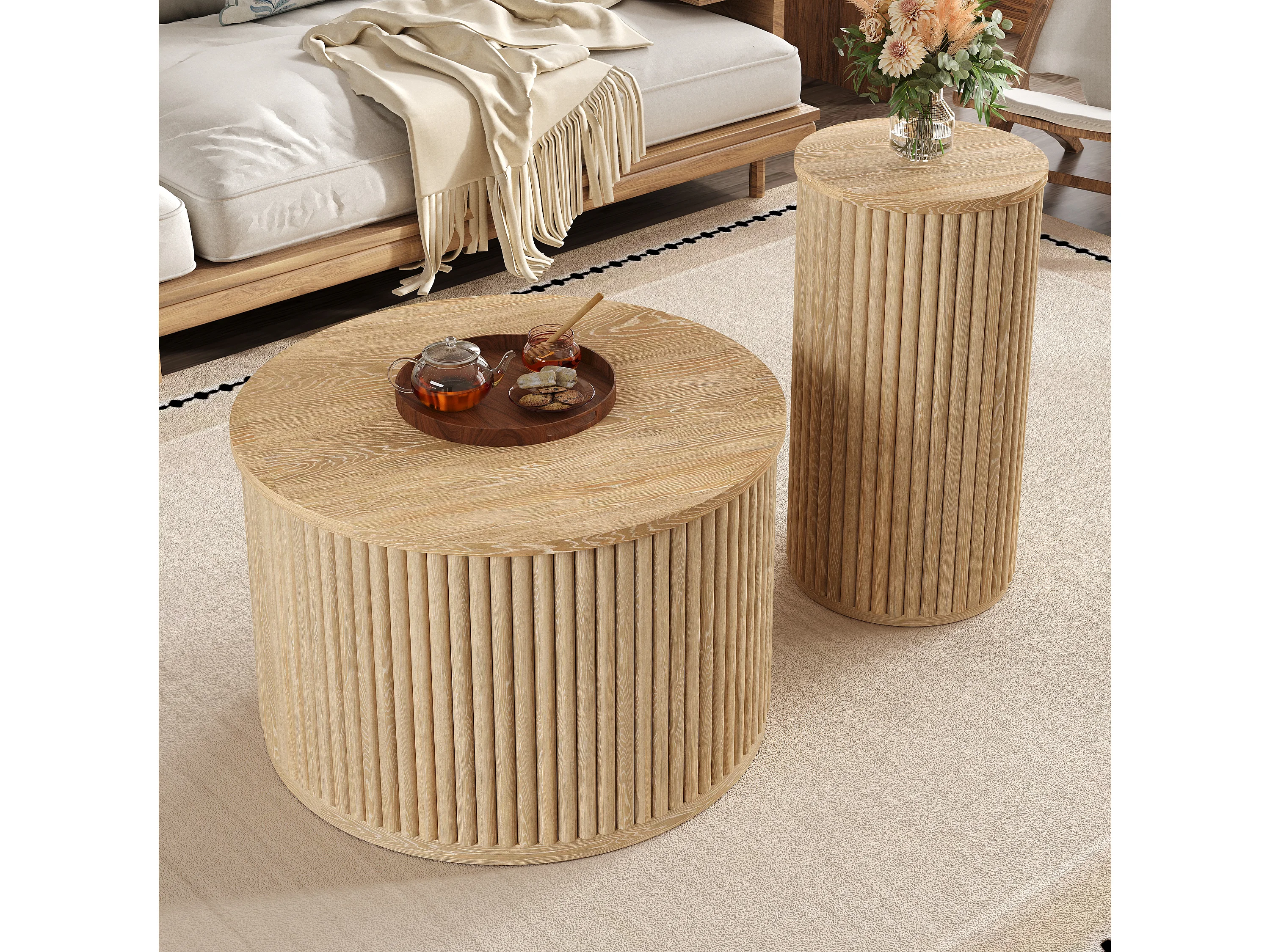 Salontafel set - Ronde plaat - Verticale strepen motief - MDF - Natuur