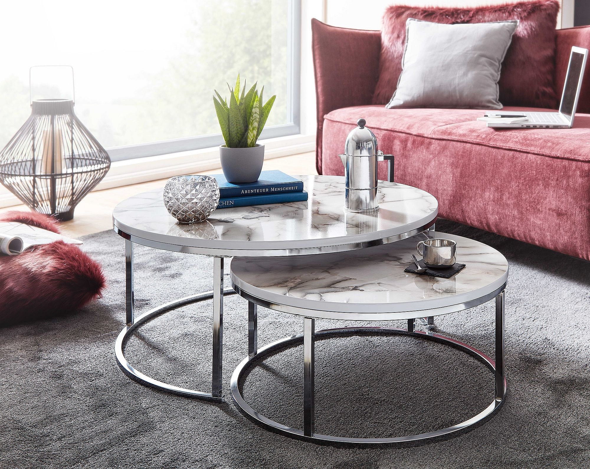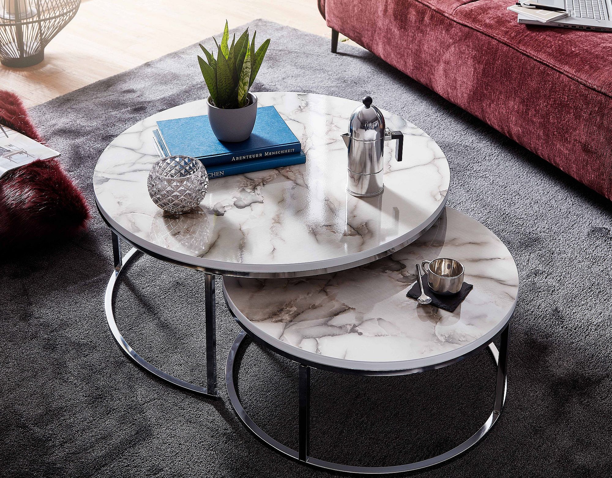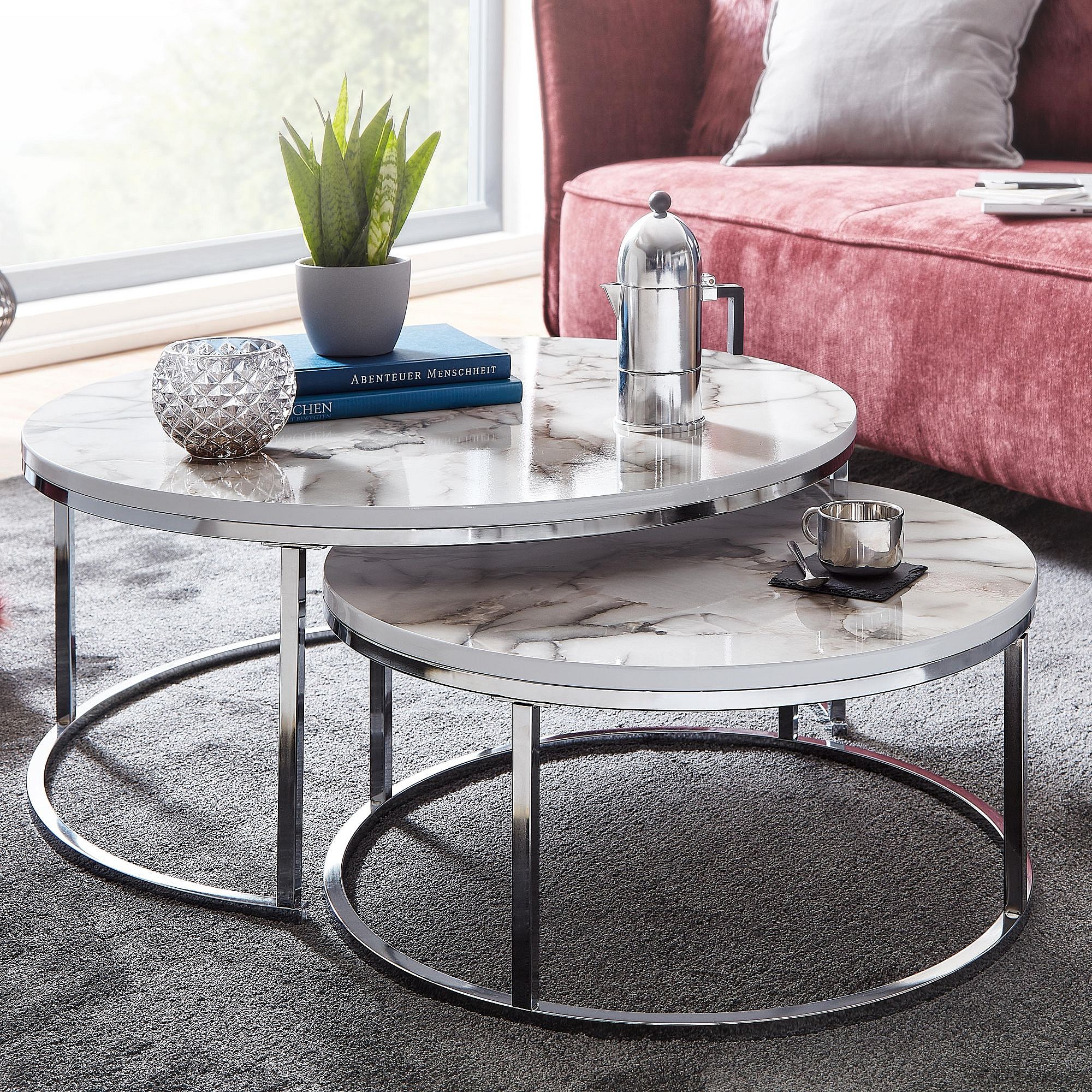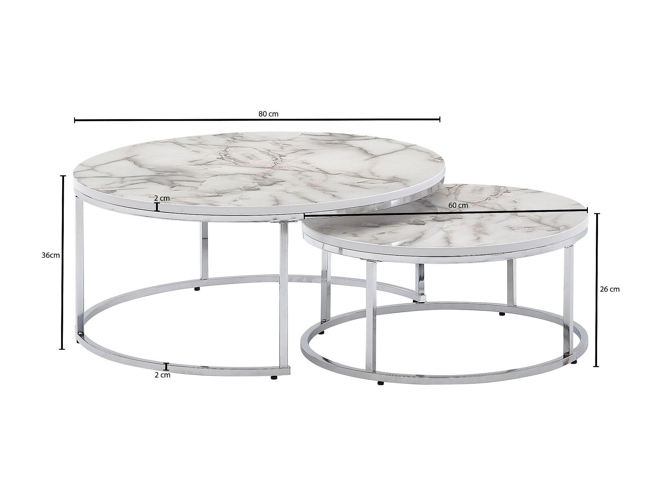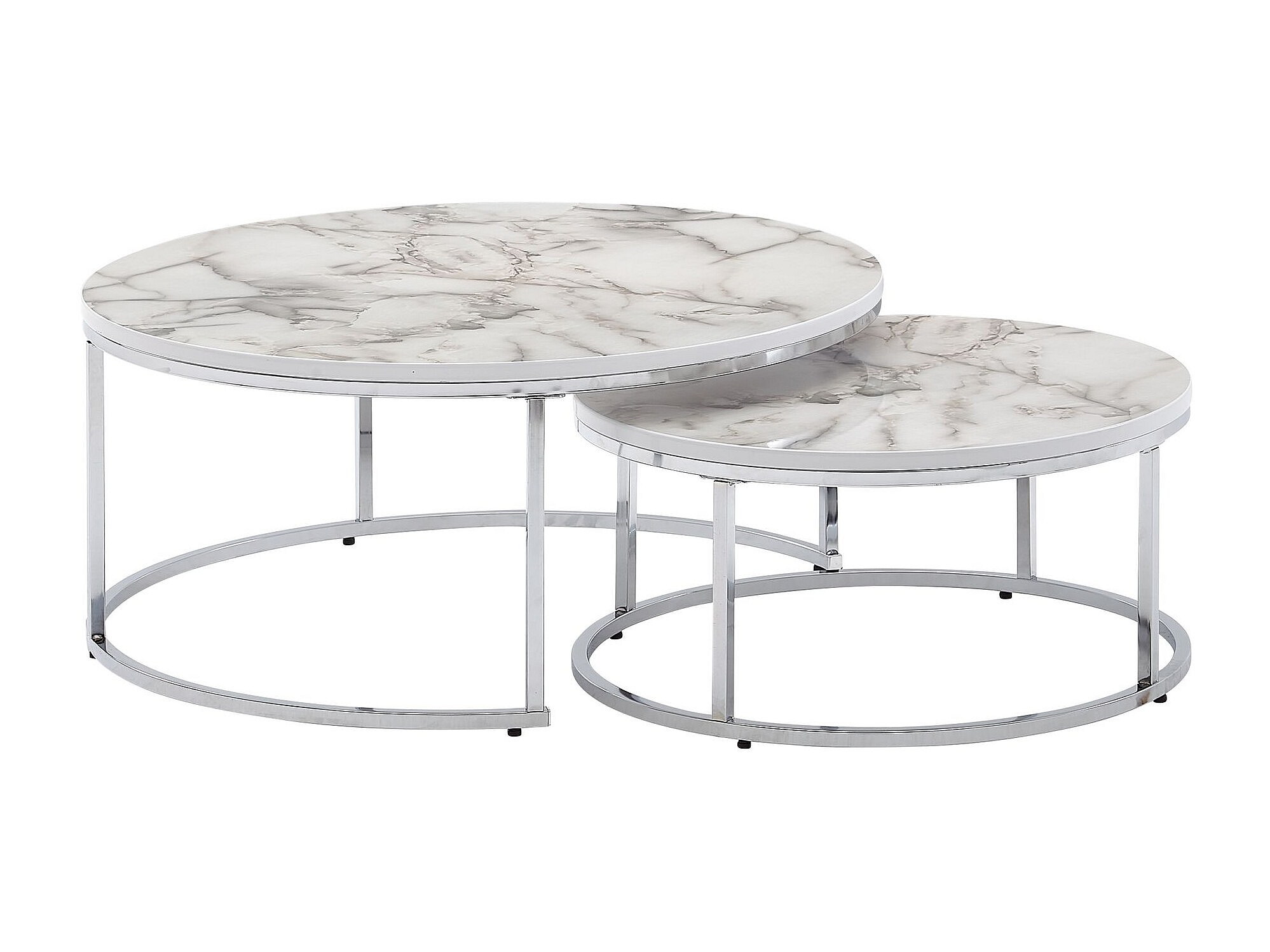 salontafel set van 2 wit zilver marmerlook salontafel rond modern | Bijzettafel 2-delig metaal | Ronde salontafels | Ontwerp nesttafels