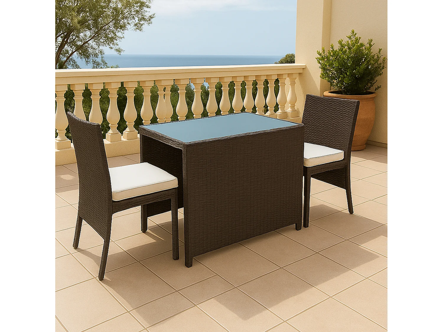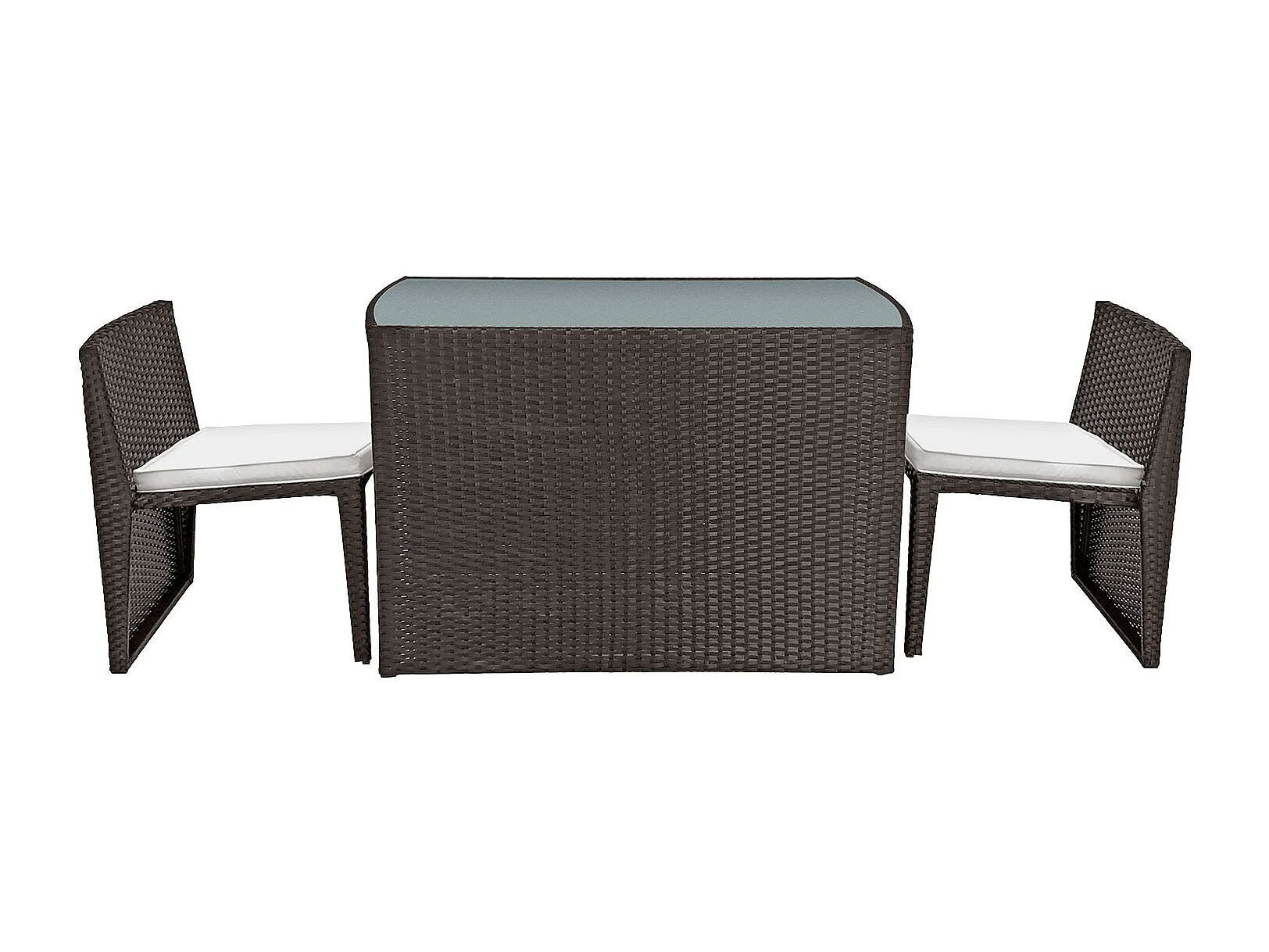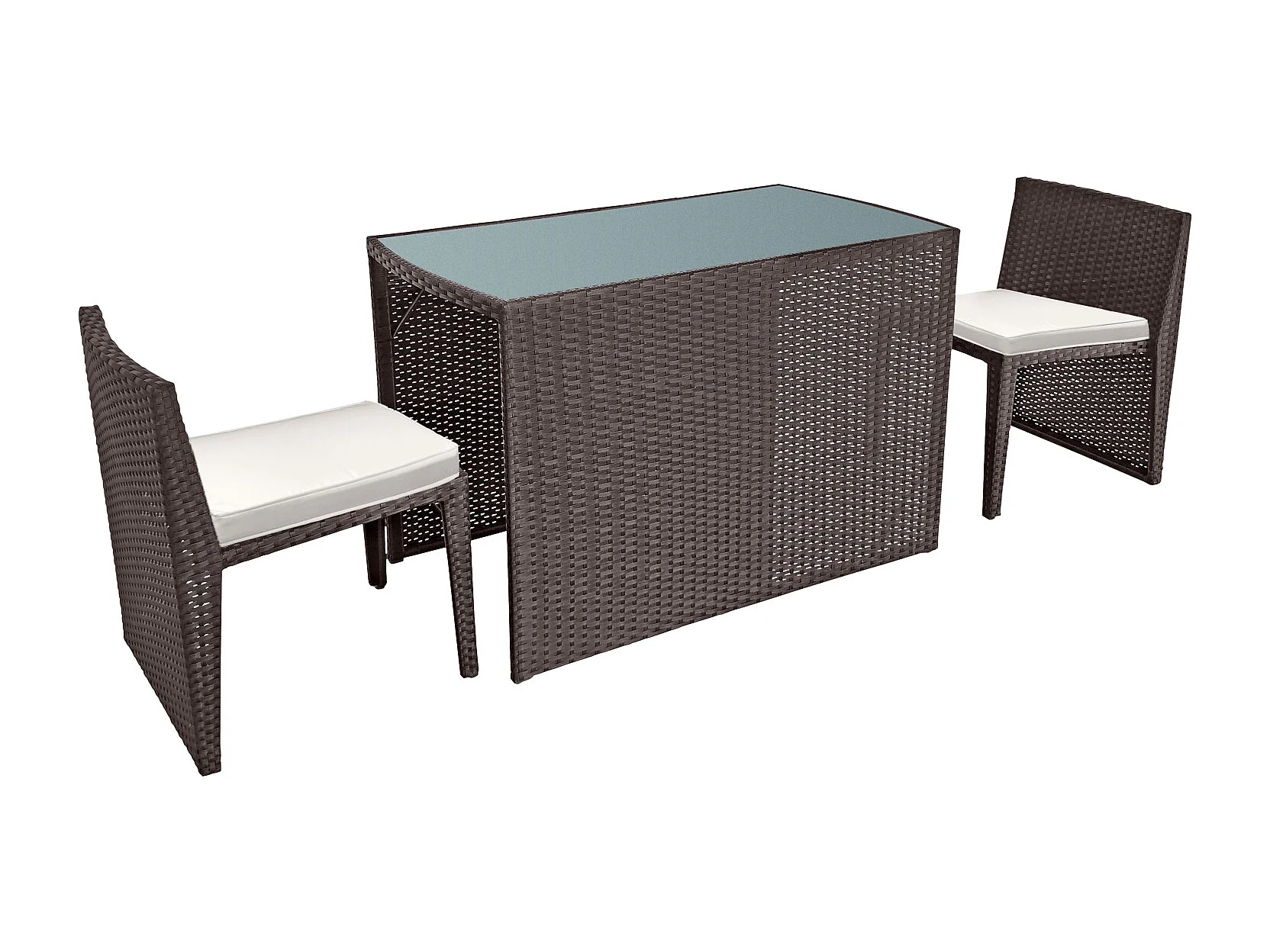 SANTORIN bruin gevlochten kunststof inbouw tuinmeubelen voor 2 - ivoorkleurige kussens