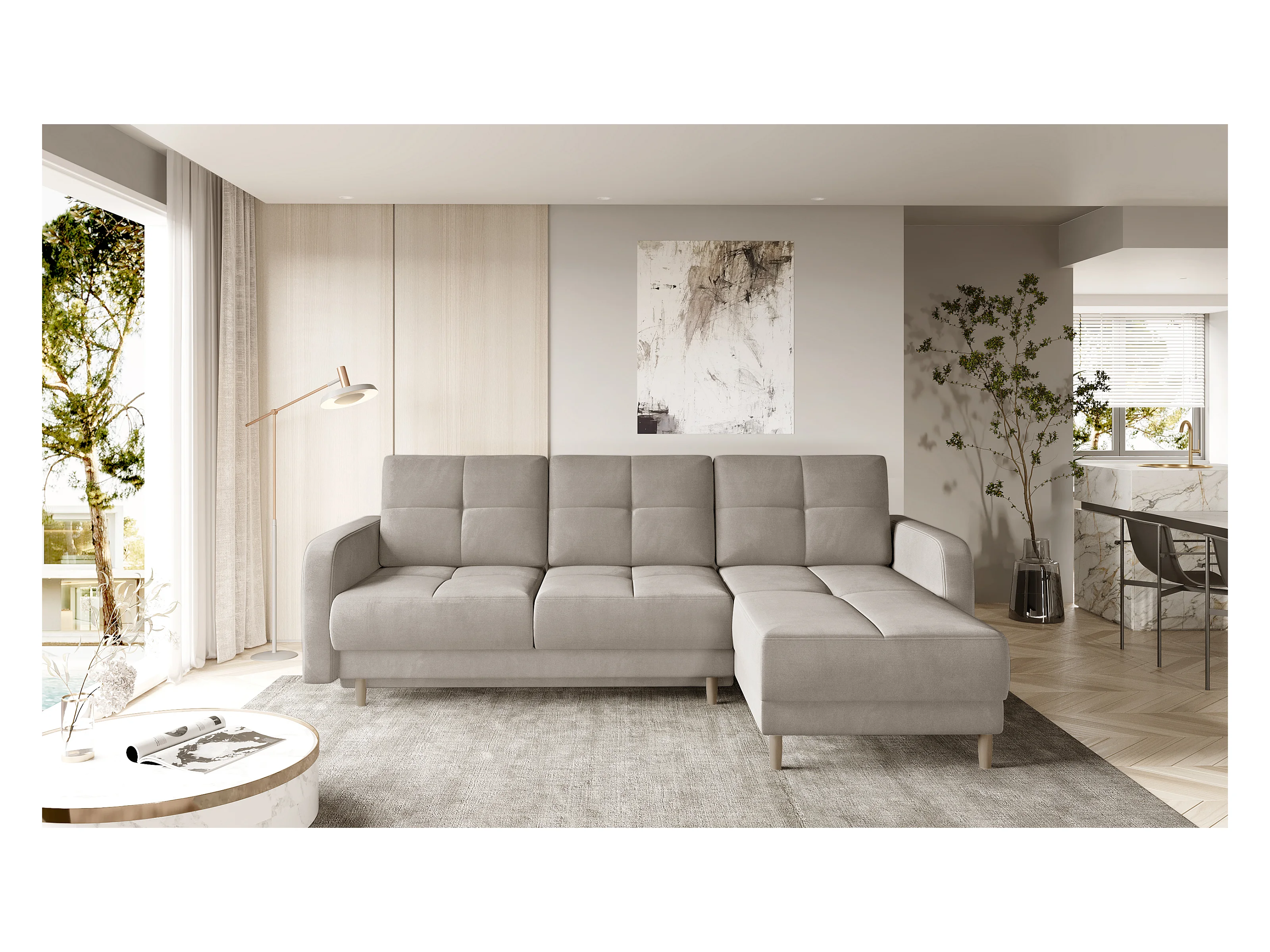 Scandinavische omkeerbare hoekbank lichtbeige fluweel en lichte houten poten Kindo 240 cm